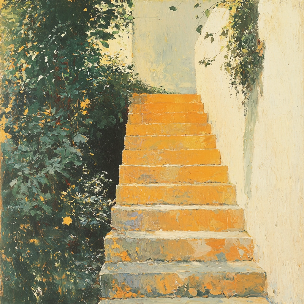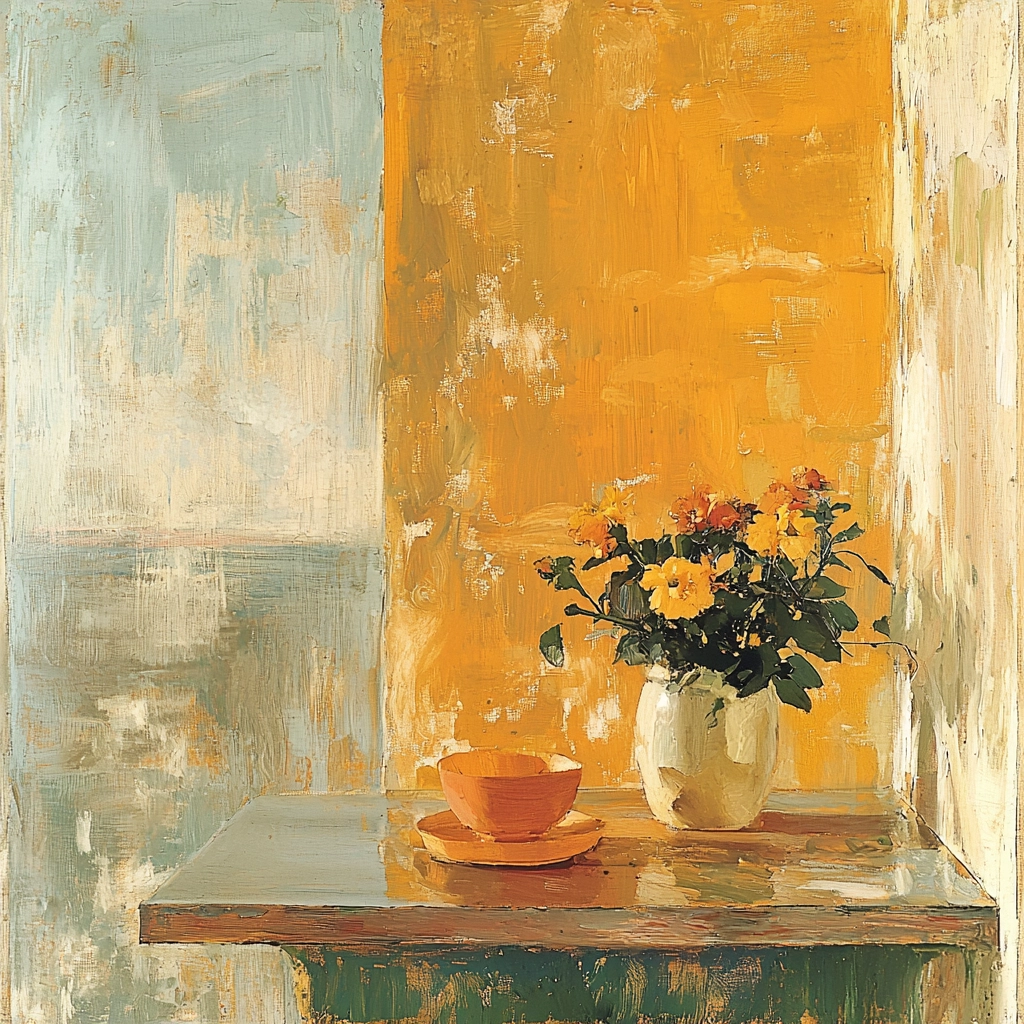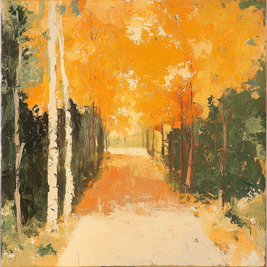 Emphasizes contrasting lighting where the warm intensity of orange is balanced by muted beige tones. The texture is thick yet deliberate, suggesting depth with a tactile quality almost tangible.