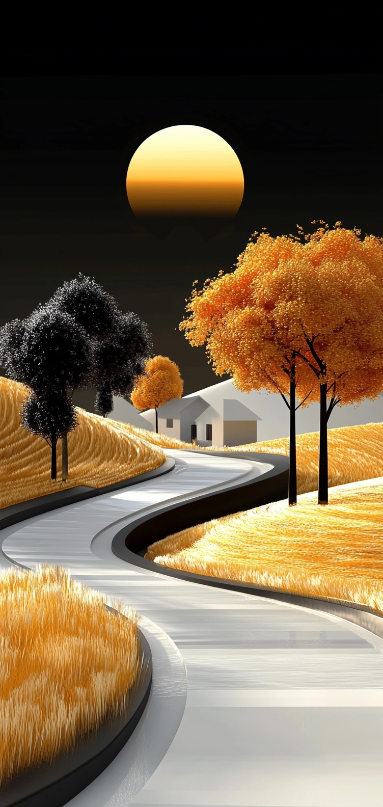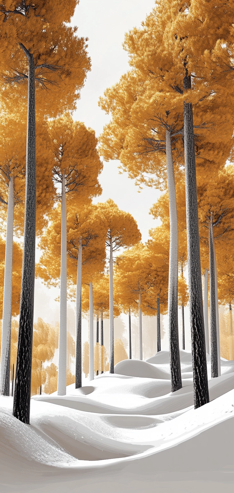 Illuminated by warm lighting, golden tones dominate with sharp contrasts against black. The composition plays with vertical orientation, enhancing a sense of height. Smooth textures contrast with precise lines, offering depth and detail.