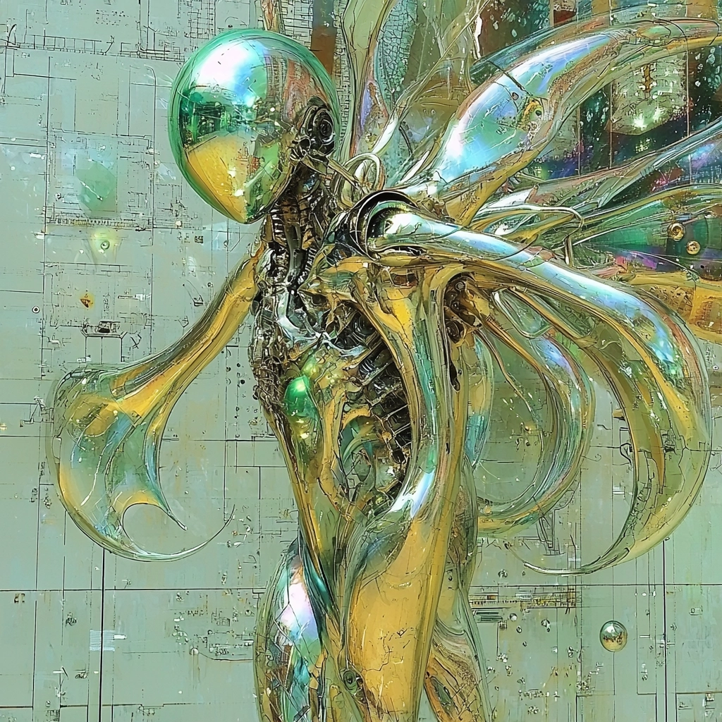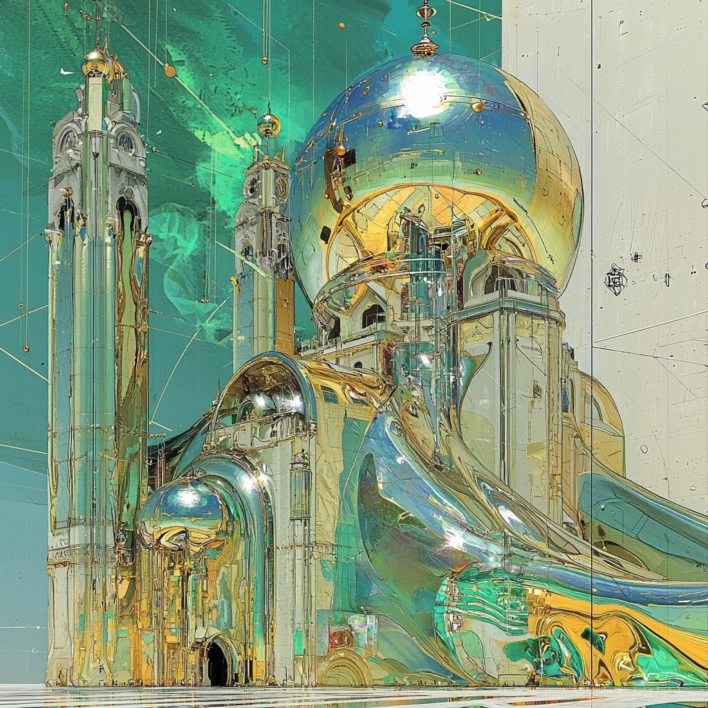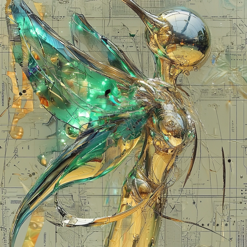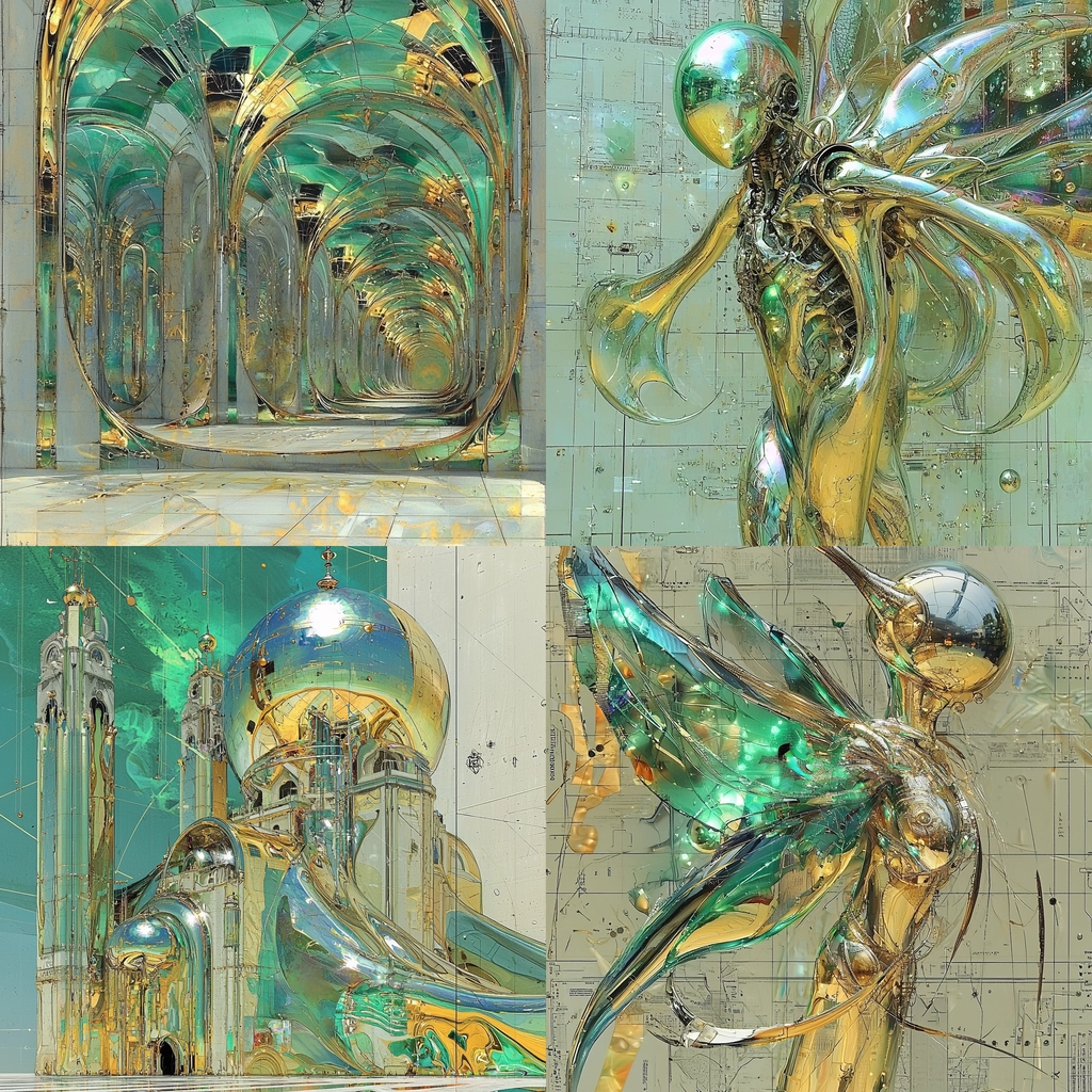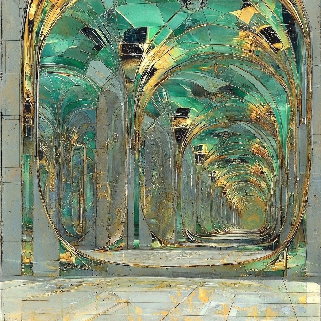 The gold and teal palette interacts with reflective surfaces, creating a dynamic sense of depth and shine. Light and shadows play across metallic textures, emphasizing sleek, fluid forms against a meticulously detailed background. The composition combines intricate design with polished, luminous surfaces.
