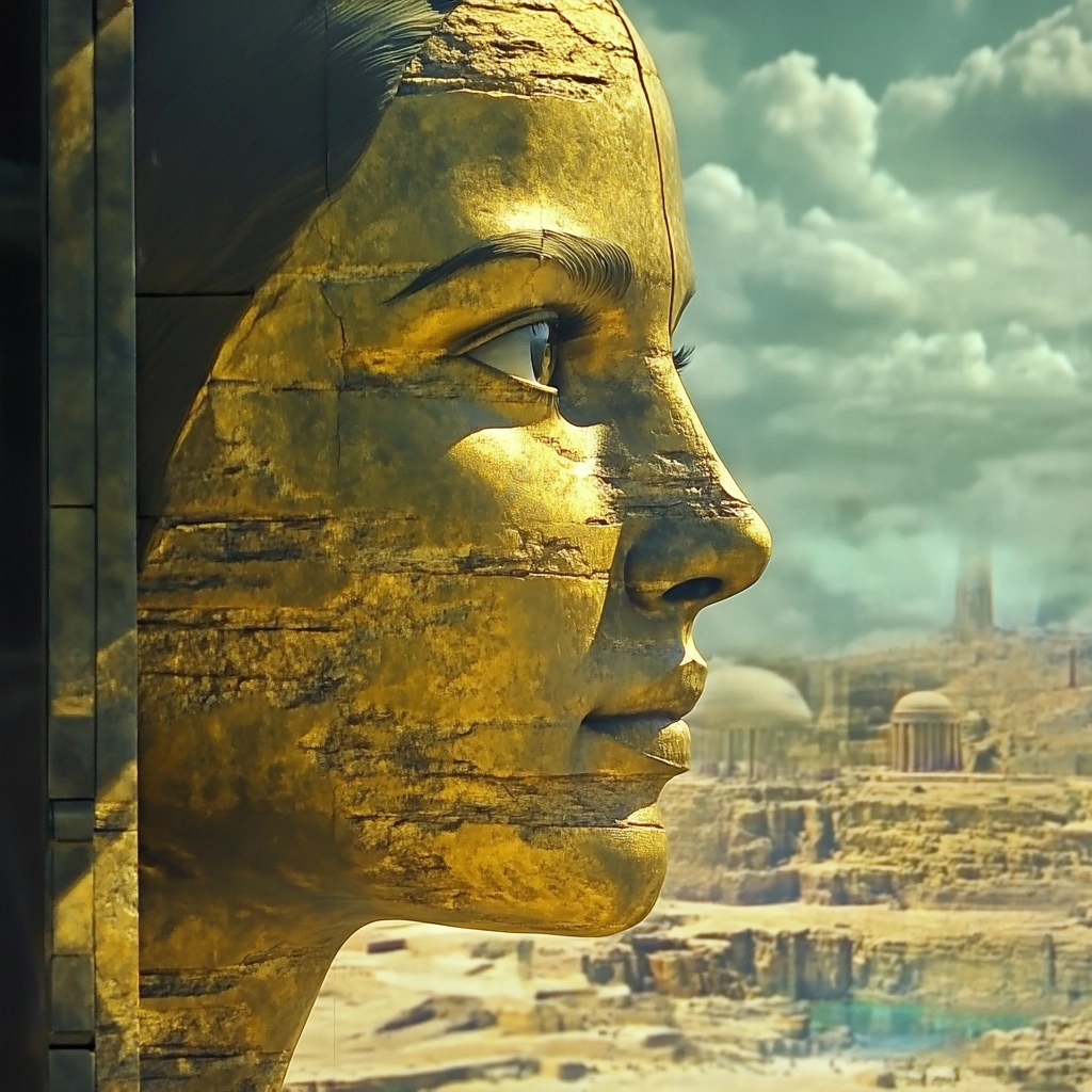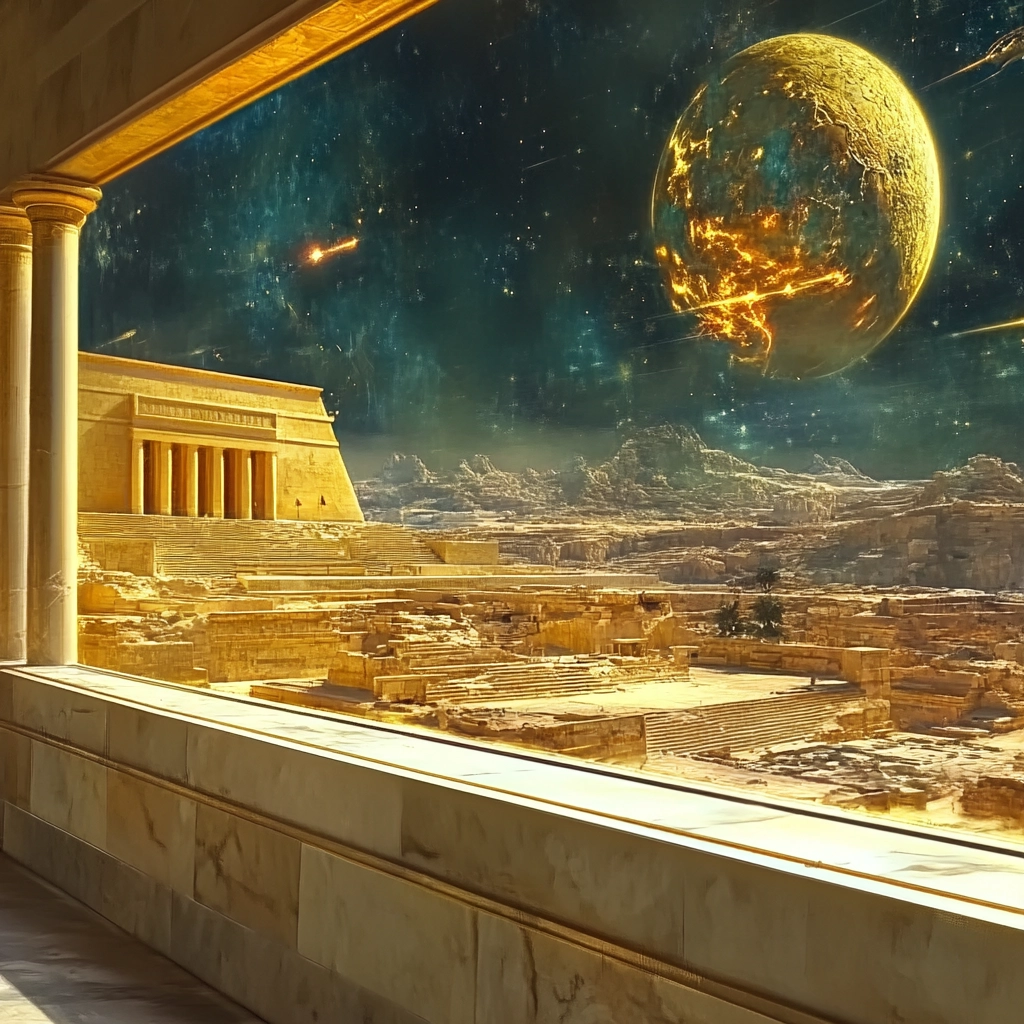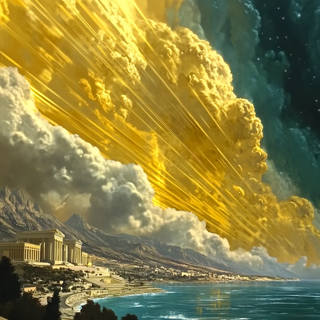 The composition uses directed golden lighting that emphasizes sharp reliefs and surface texture on architectural stone and sculptural forms. The yellow tones dominate, creating a warm hue that contrasts with deep blue water and sky, enhancing spatial layering. The texture of stone surfaces is finely detailed, with visible cracks and erosion, contributing to a tactile sense. Linear light streaks and cloud formations add vertical and diagonal spatial dynamics.
