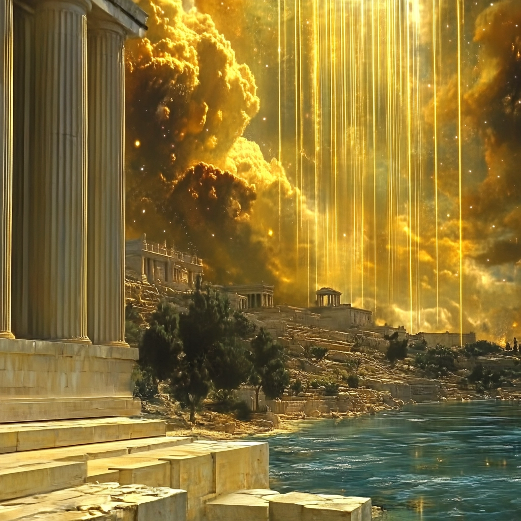 Strong golden and yellow lighting highlights classical architectural forms with detailed texture, contrasted by cool blue water and sky, creating spatial depth and clear structural definition.