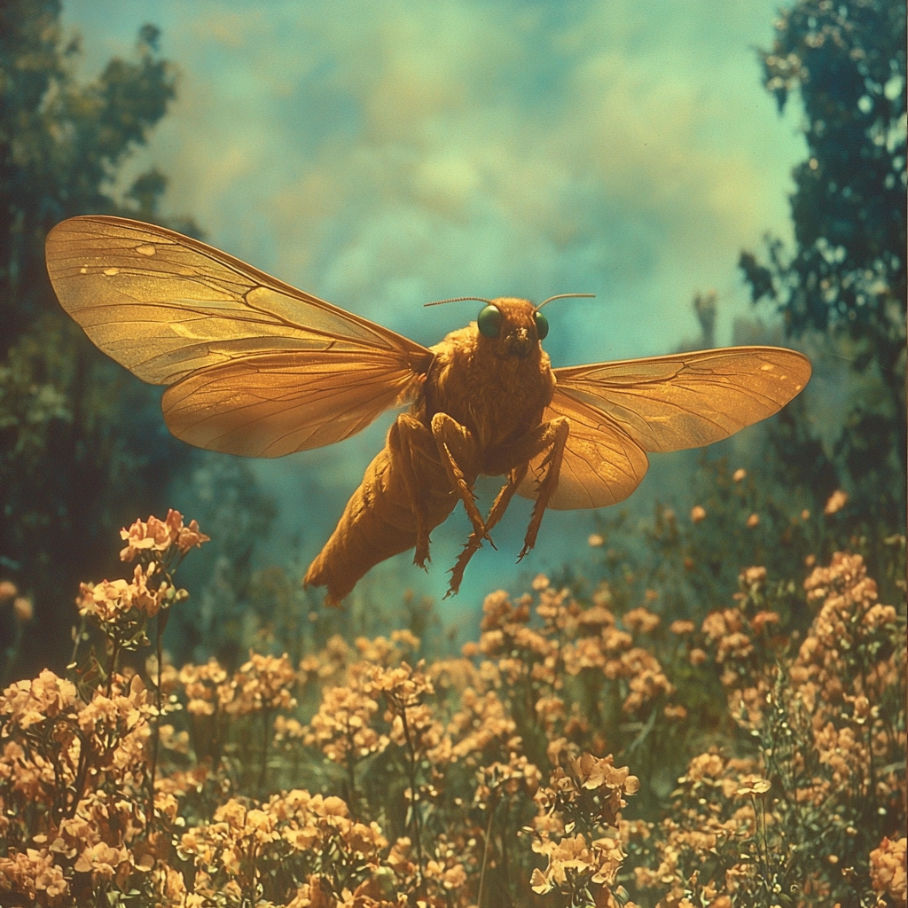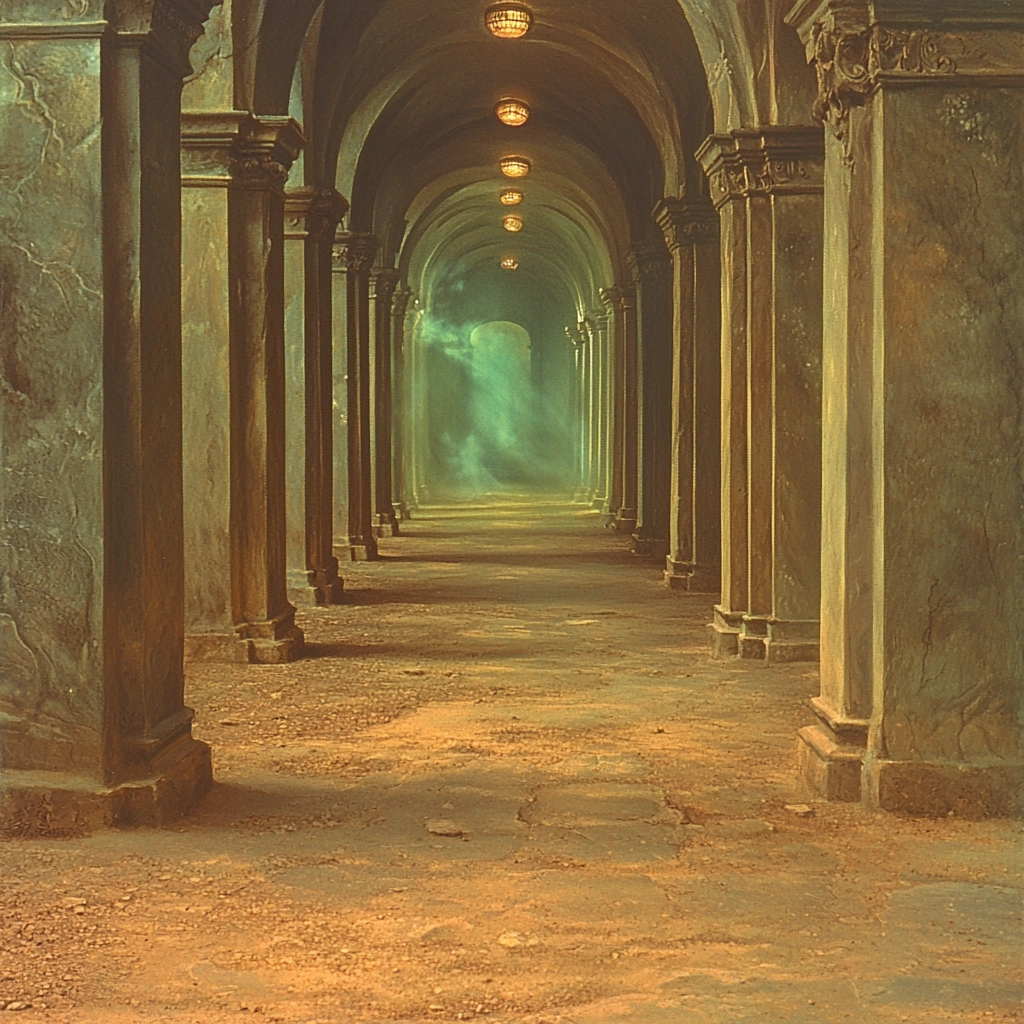 Strong contrast between gold lighting and cyan shadows adds depth and dimension. Smooth spatial transitions and a seamless integration of elements highlight the dynamic yet balanced composition. The subtle texturing integrates all aspects with a soft, cohesive finish.
