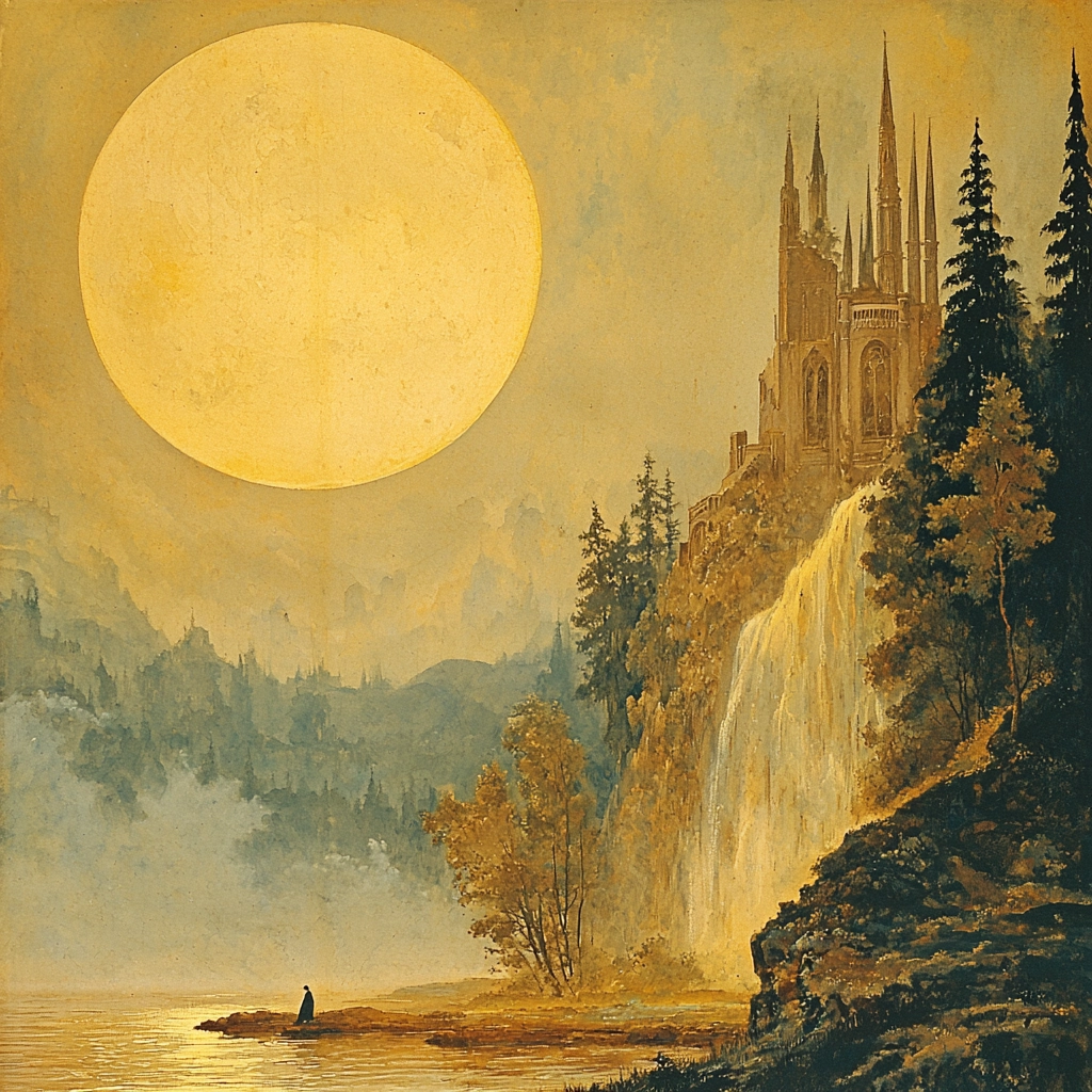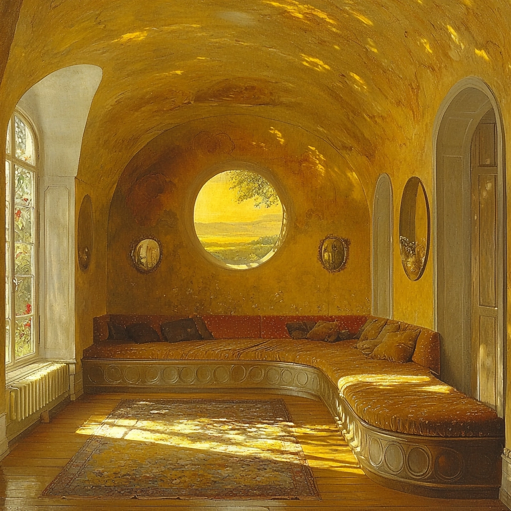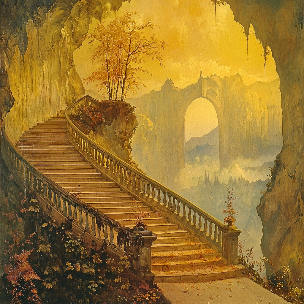 Warm, glowing yellows complement cool blues, creating a dynamic interplay of light. Texture varies from soft, misty backgrounds to crisp architectural lines. Depth is evident, inviting the viewer to explore layered landscapes and intricate spaces.
