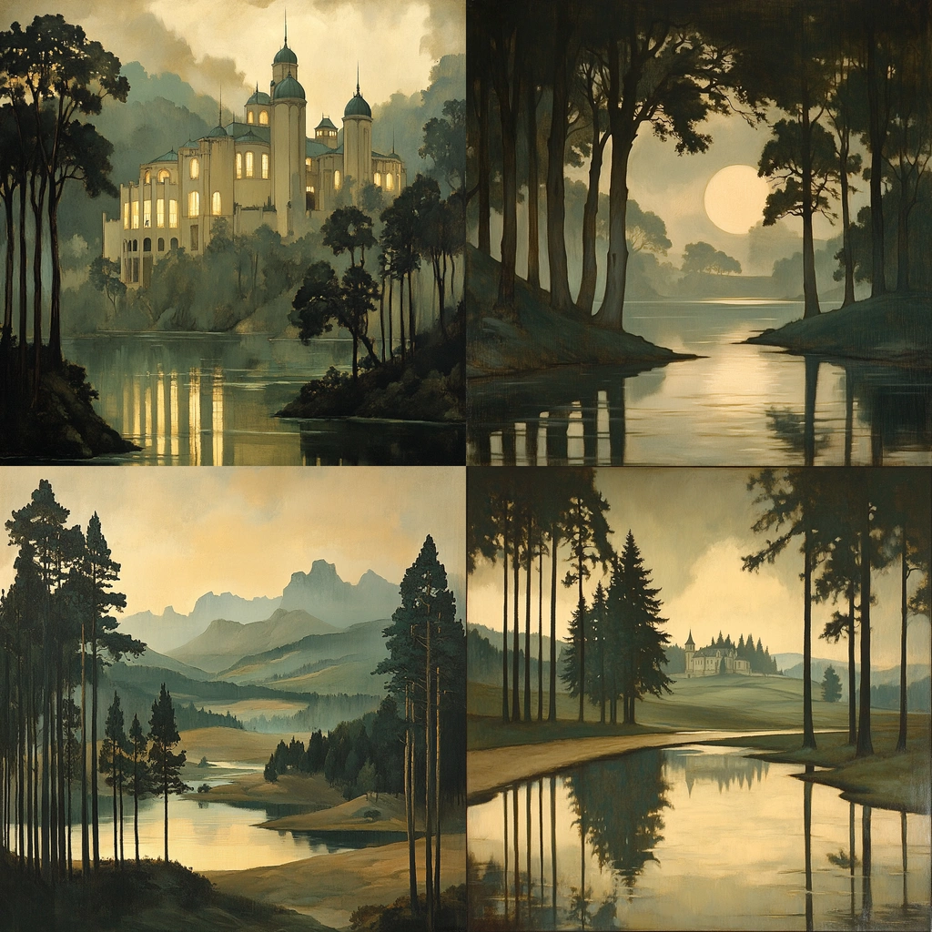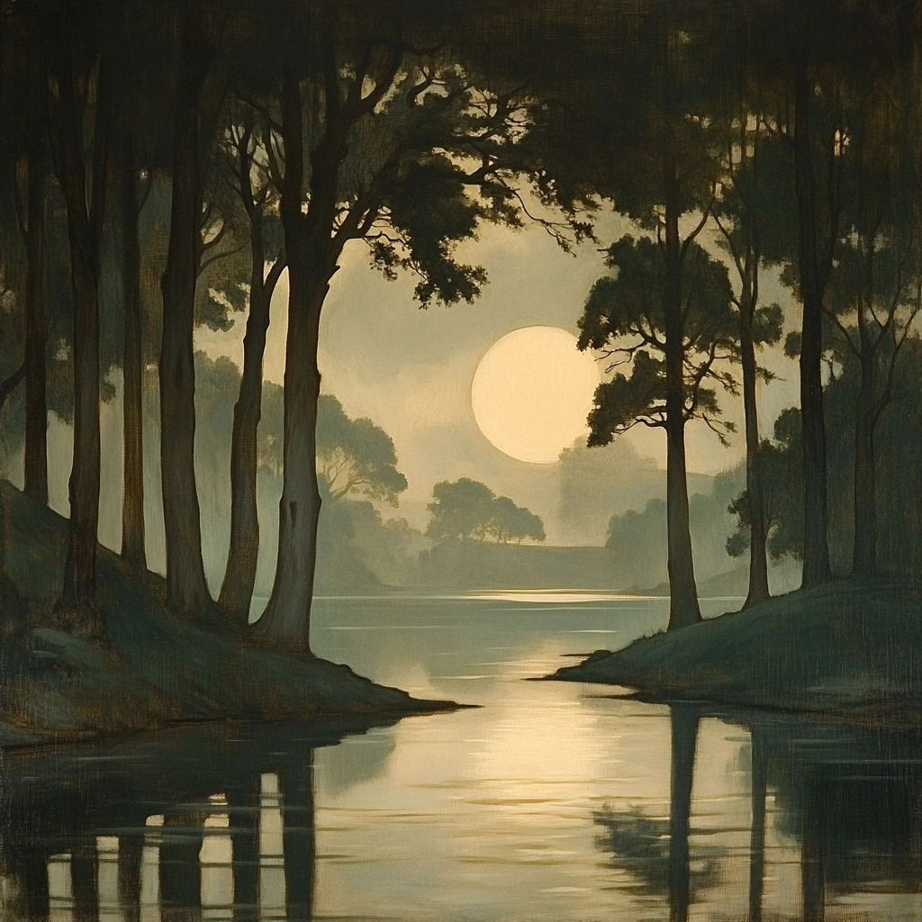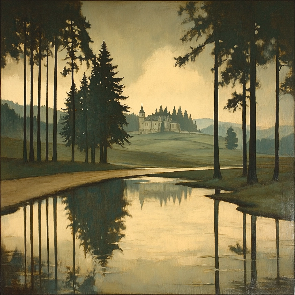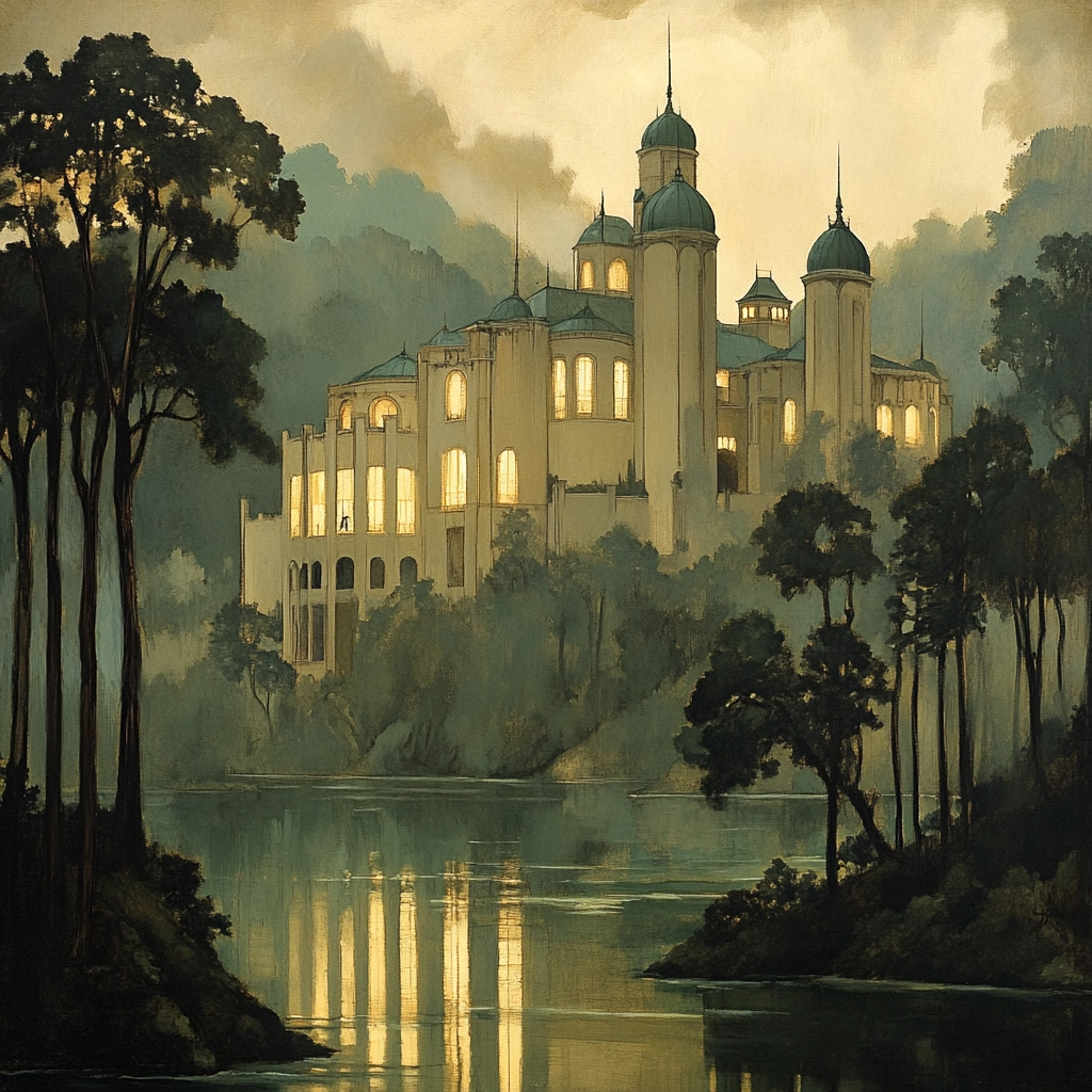 Soft lighting illuminates the scene, highlighting the reflections in the water and creating a serene atmosphere. The hues of green and dark blue define the natural terrain, while delicate brushstrokes create texture on the foliage and architecture, providing depth and dimension.