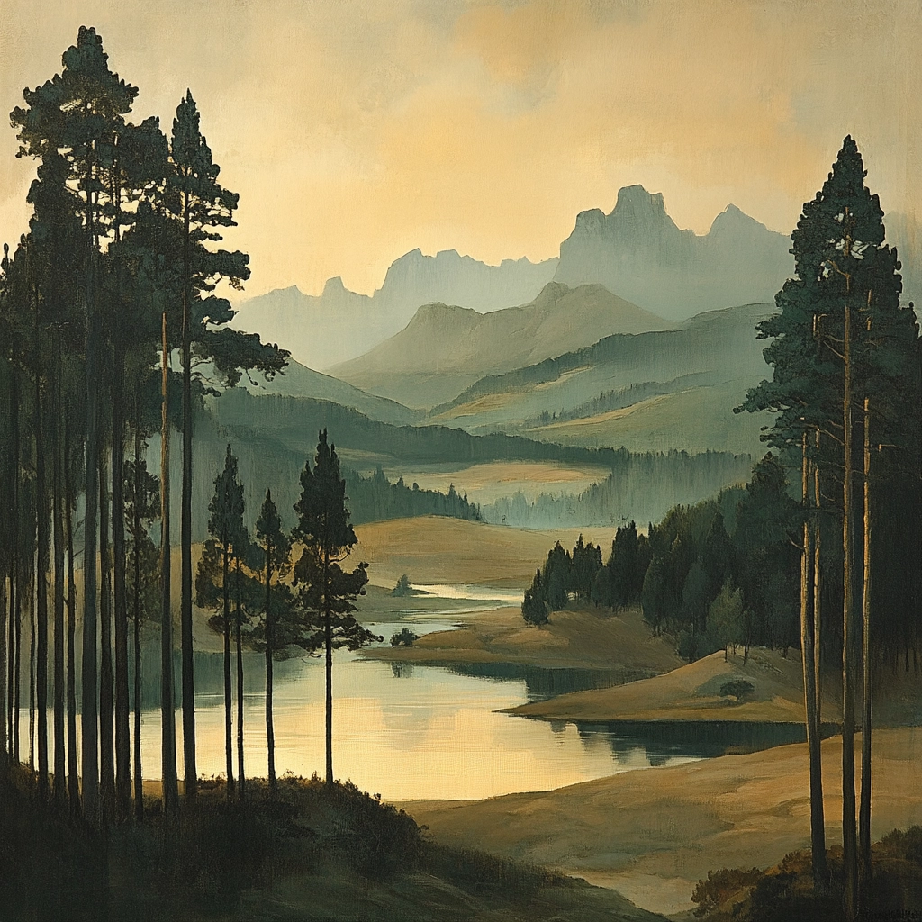 Beige skies and dark blue waters create a tranquil contrast with green landscapes.