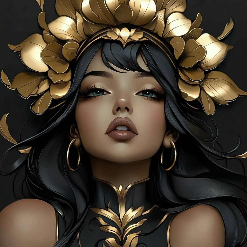 The imagery showcases intricate gold embellishments that create a striking visual impact. The use of black and white accentuates the golden elements, with flowing lines and textures adding depth.