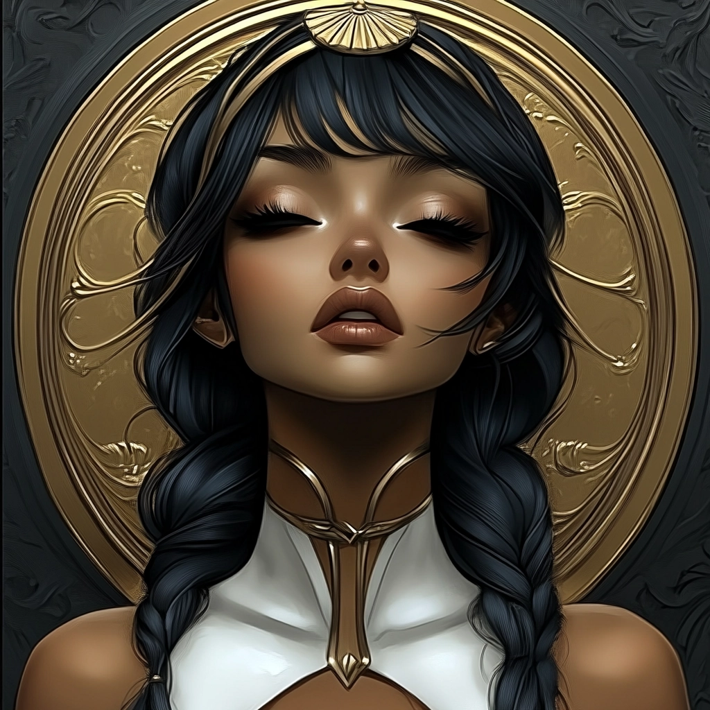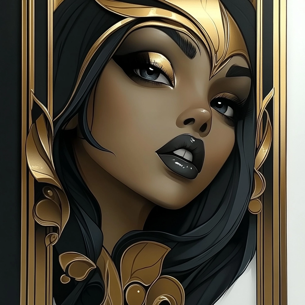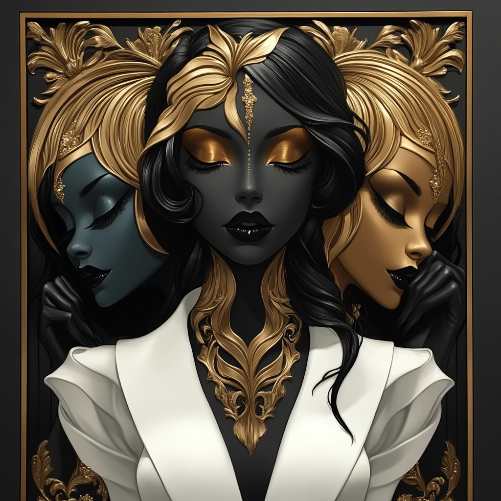 Rich gold detailing against contrasting black and white backgrounds.