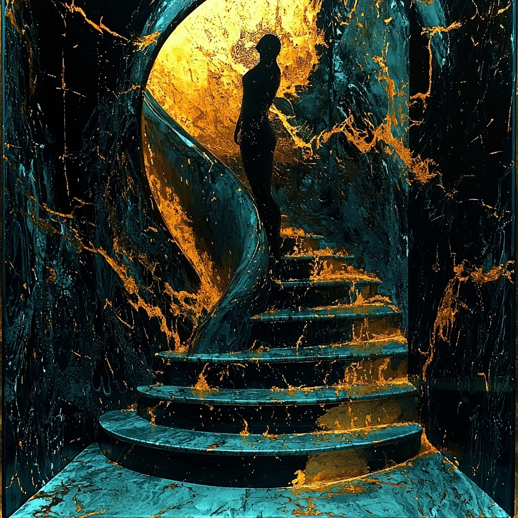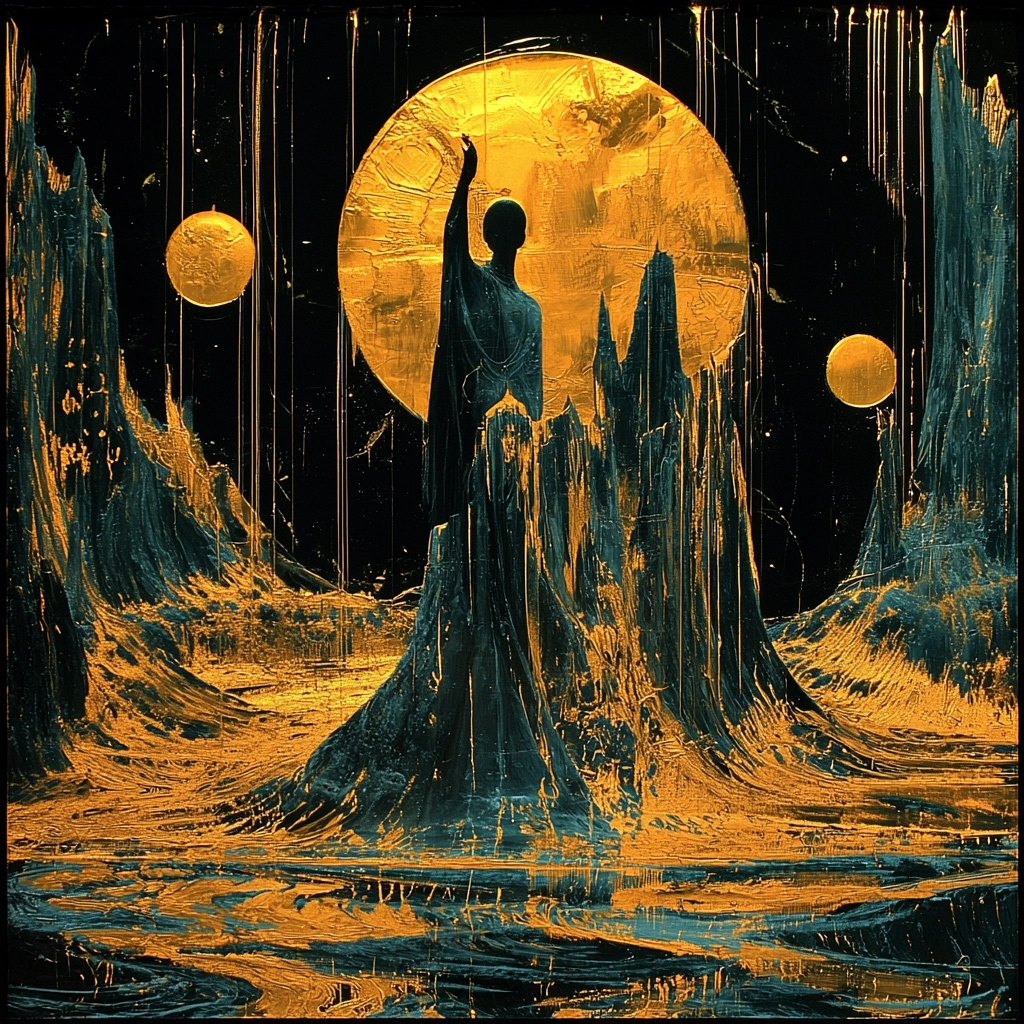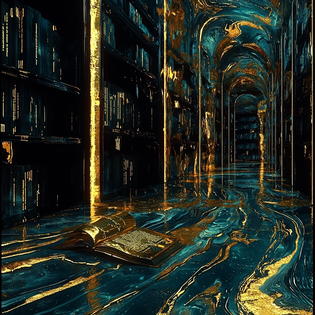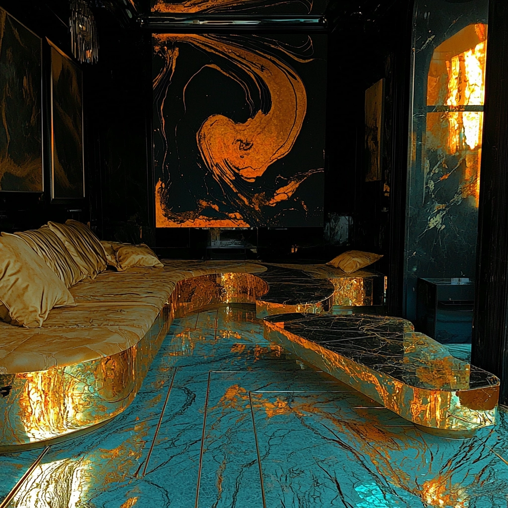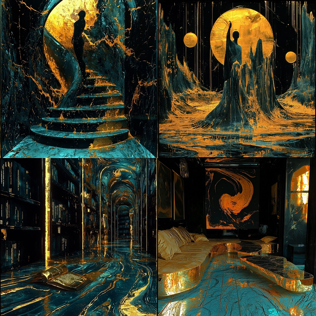 Lighting effects with intense golden highlights create depth and contrast against the dark blue backgrounds. The spatial sense is guided by fluid, sweeping lines and reflective surfaces, accentuating the interplay between light and dark. Textures appear highly polished and metallic, enhancing the luminous quality of the golden elements.