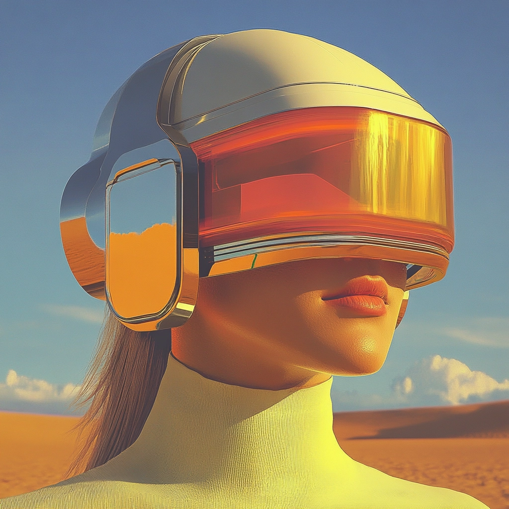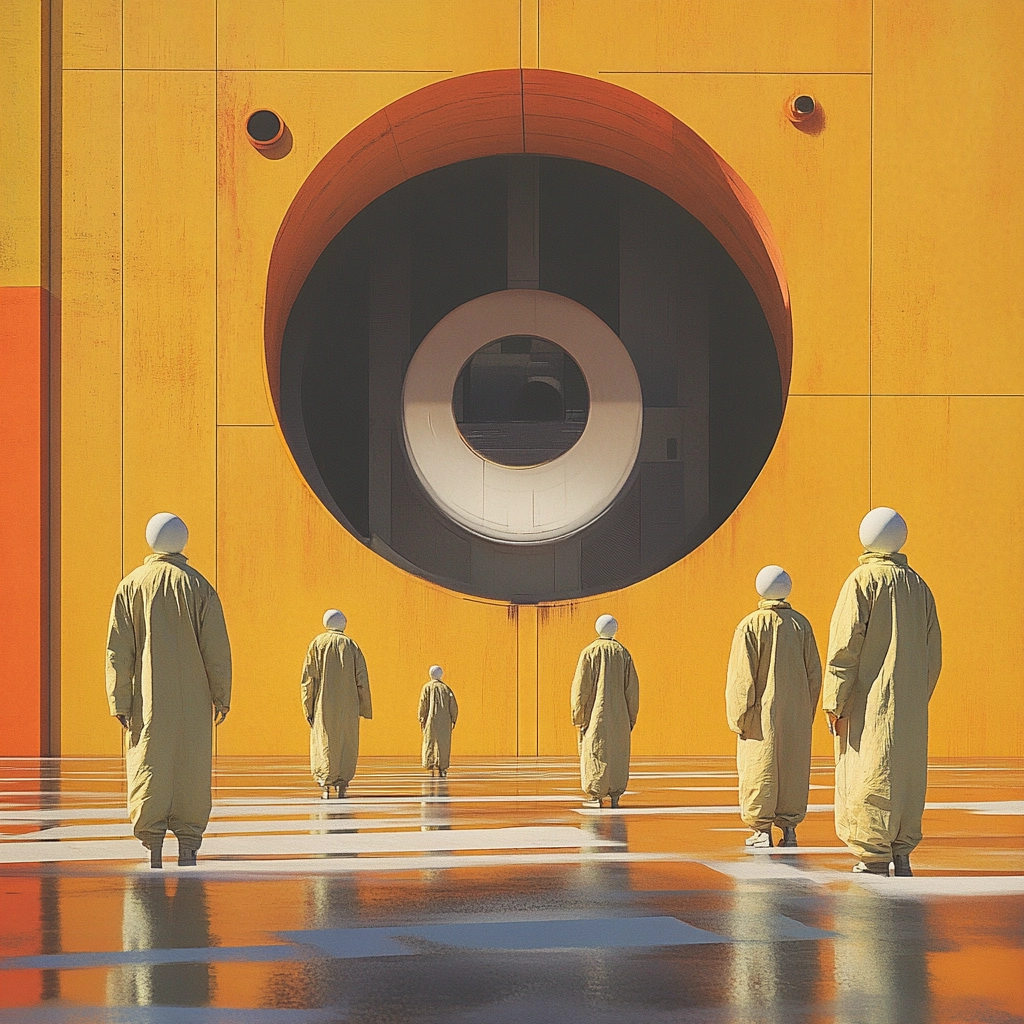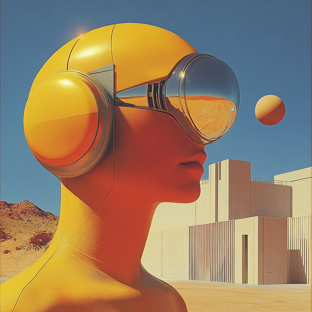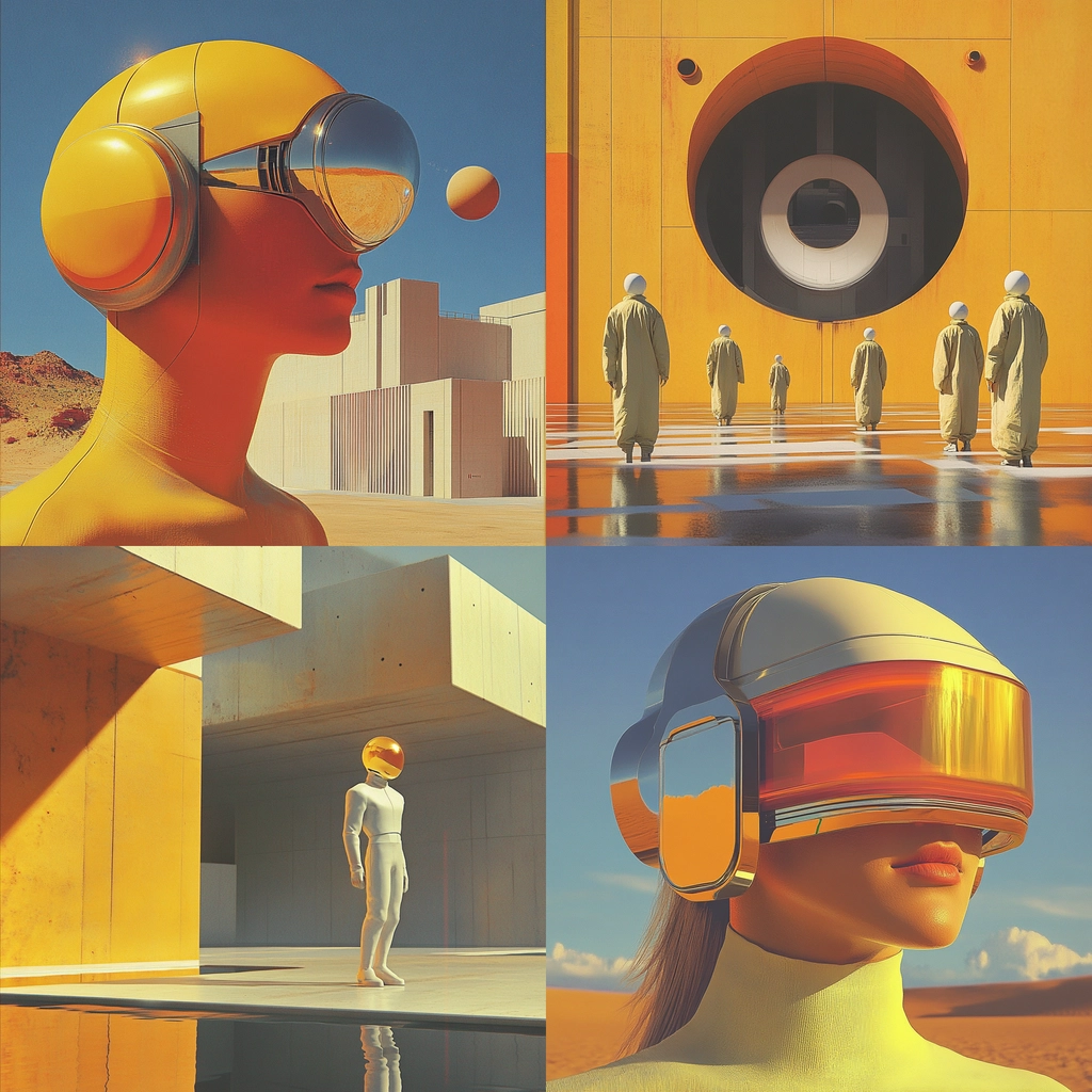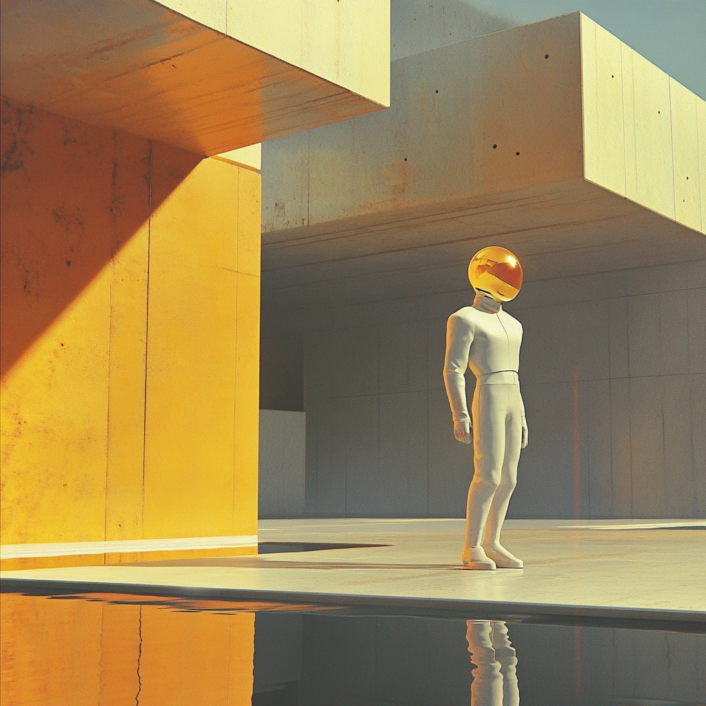 The warm yellow dominates while beige and blue provide subtle contrast, producing futuristic lighting. Deep shadows create a sharp spatial definition, emphasizing geometric forms with a smooth, metallic sheen that appears technologically advanced.