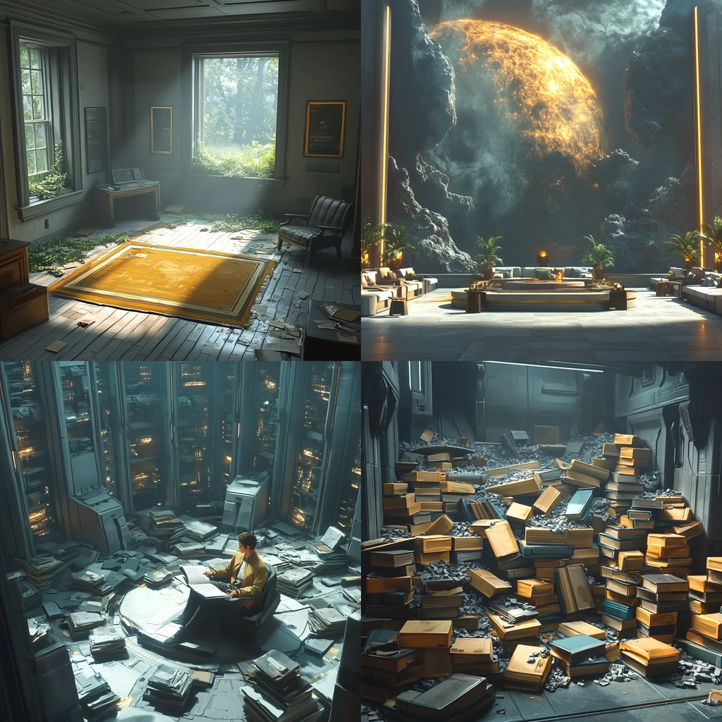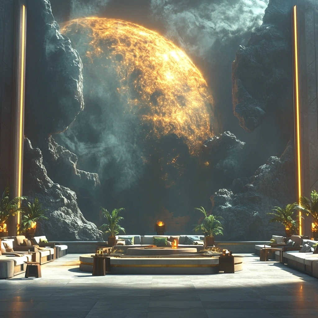 A rich composition of gold and dark hues with complex lighting.