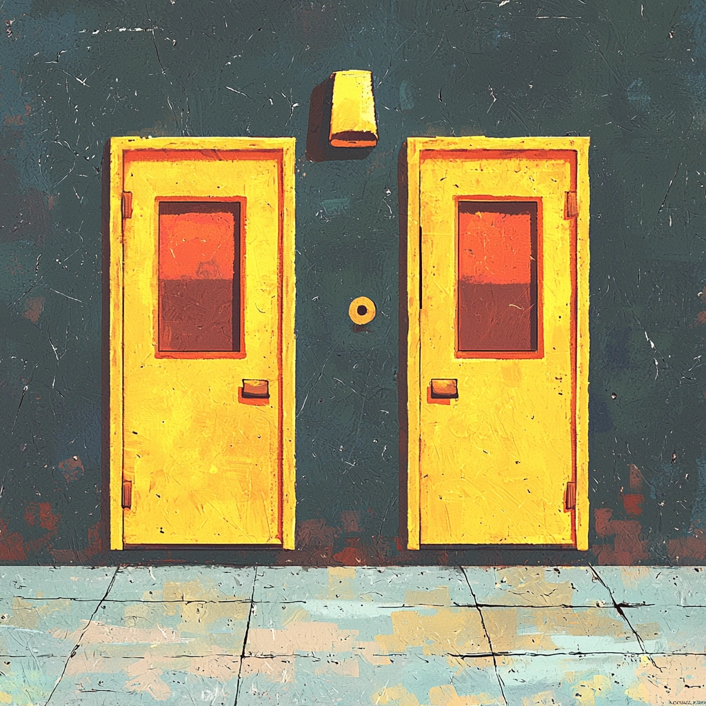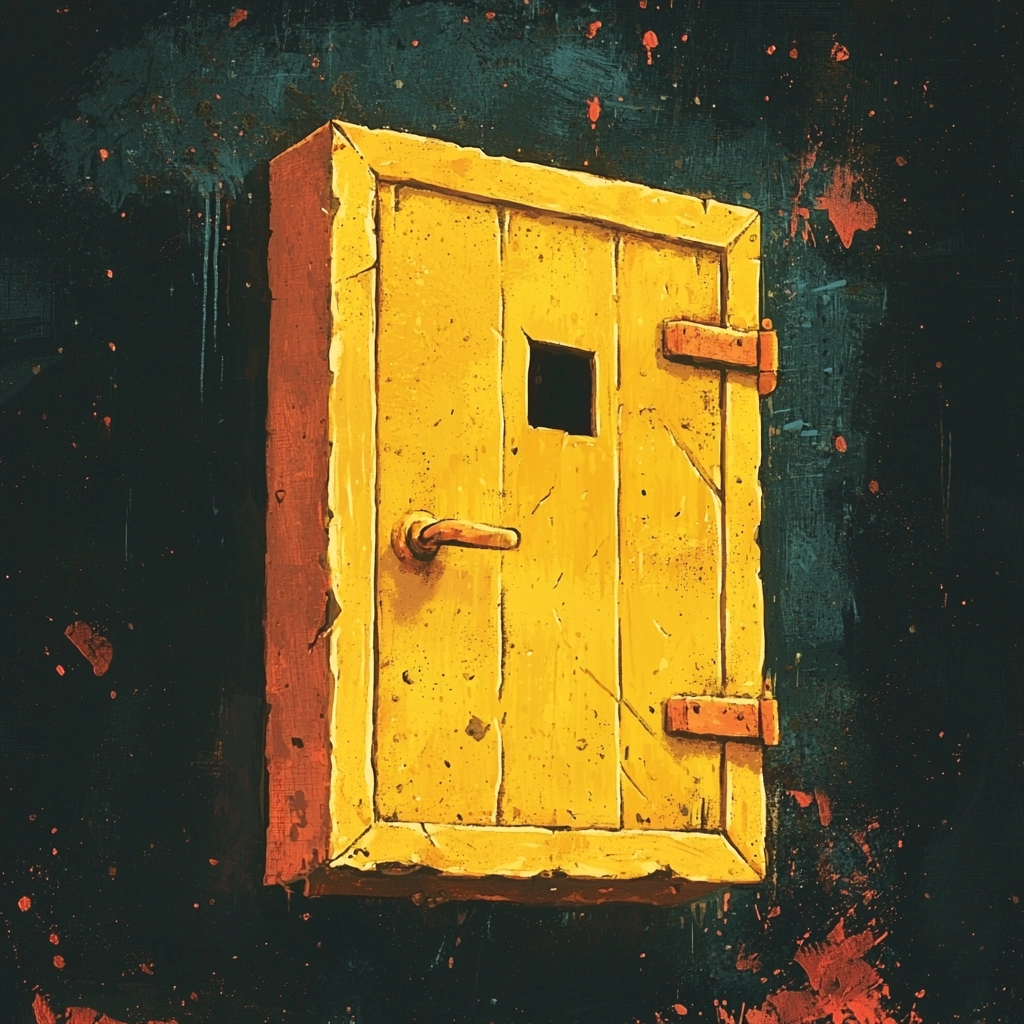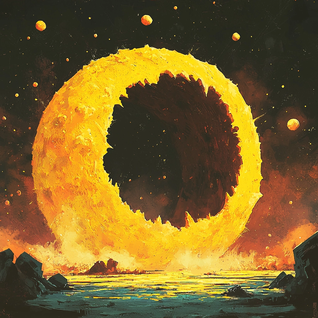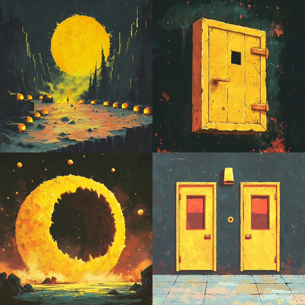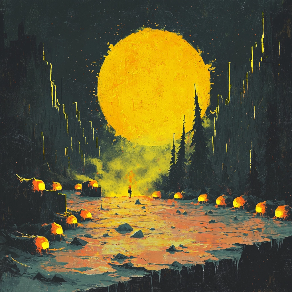 Lighting creates sharp contrast between bright yellow forms and deep shadows. The yellow is textured and somewhat rugged, while the surrounding darkness gives a sense of depth and distance. Subtle textures emphasize the tension between light and shadow.