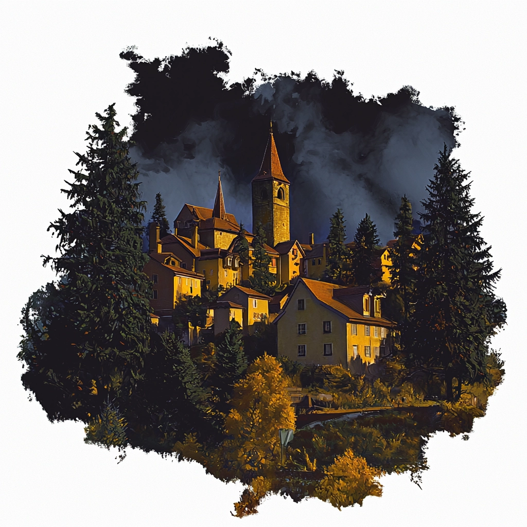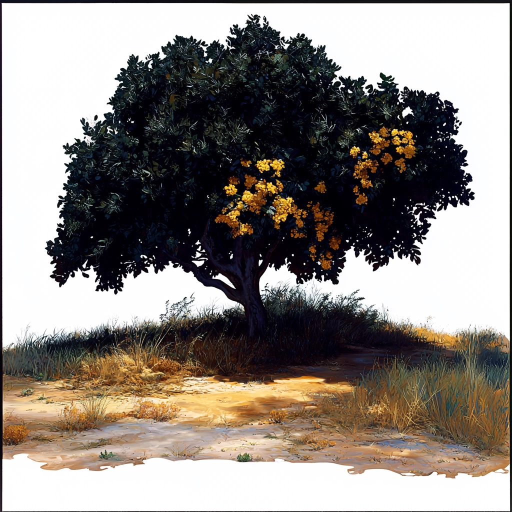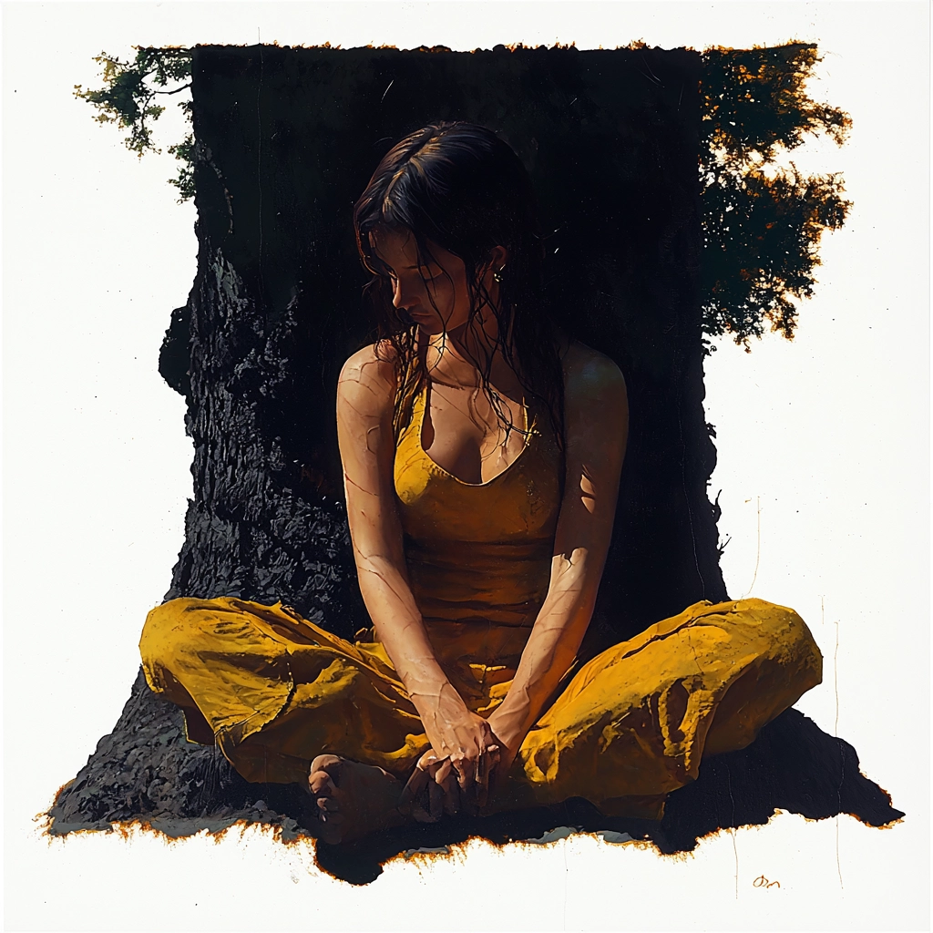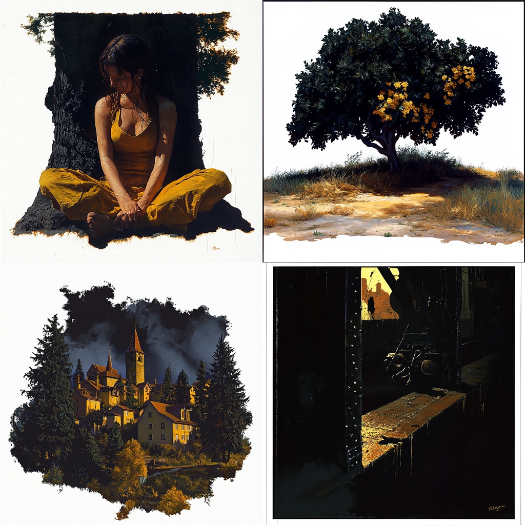 Dominance of yellows and browns contrasts with deep blacks. The bright foregrounds transition to shadow, crafting a dramatic light play. Textures are detailed, enhancing spatial depth.
