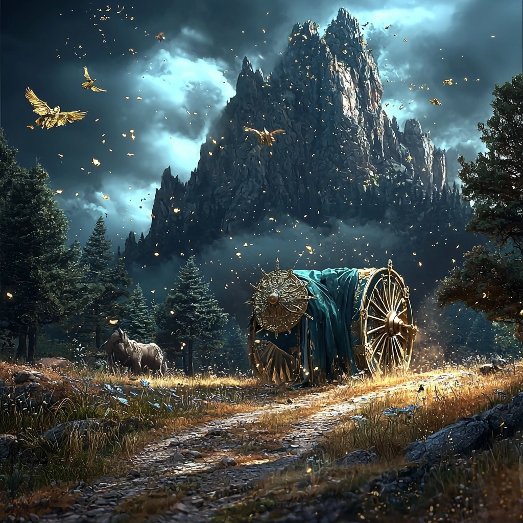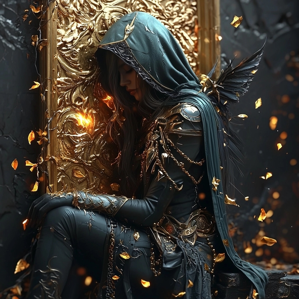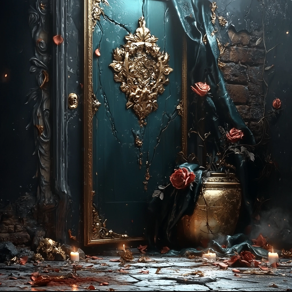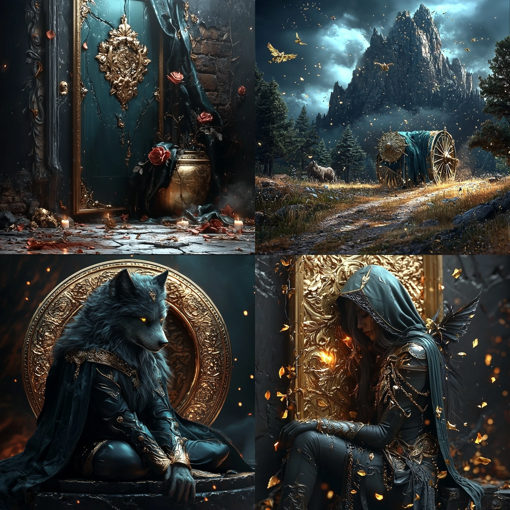 Stunning use of gold lighting highlights intricate textures and elaborate details against deep, cool backgrounds. The spatial arrangement creates a dramatic and dynamic sense of depth, enhancing the intricate compositions and adding a sense of grandeur.