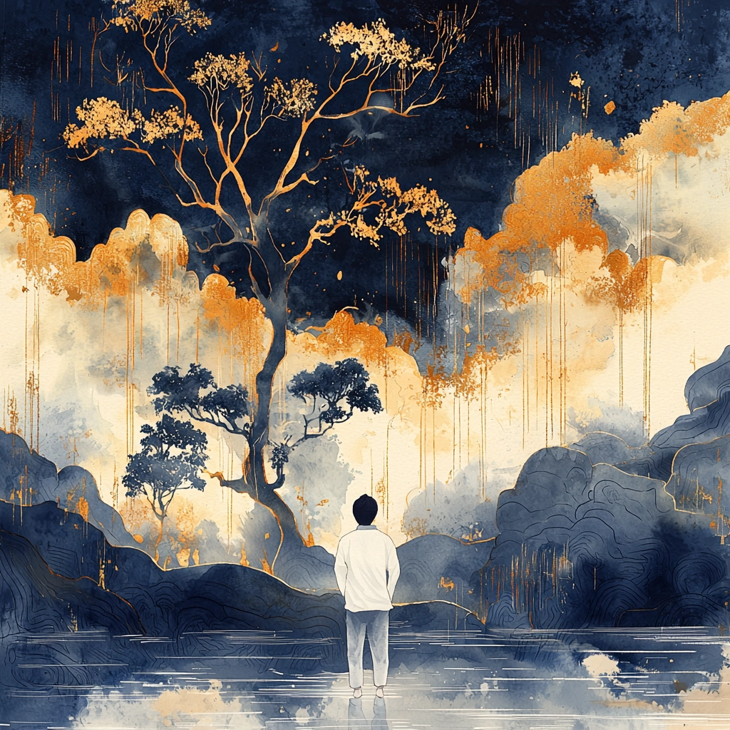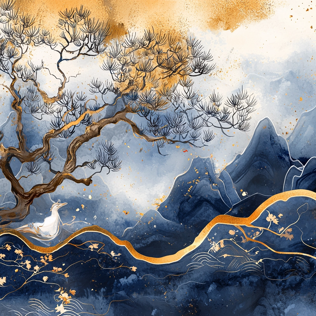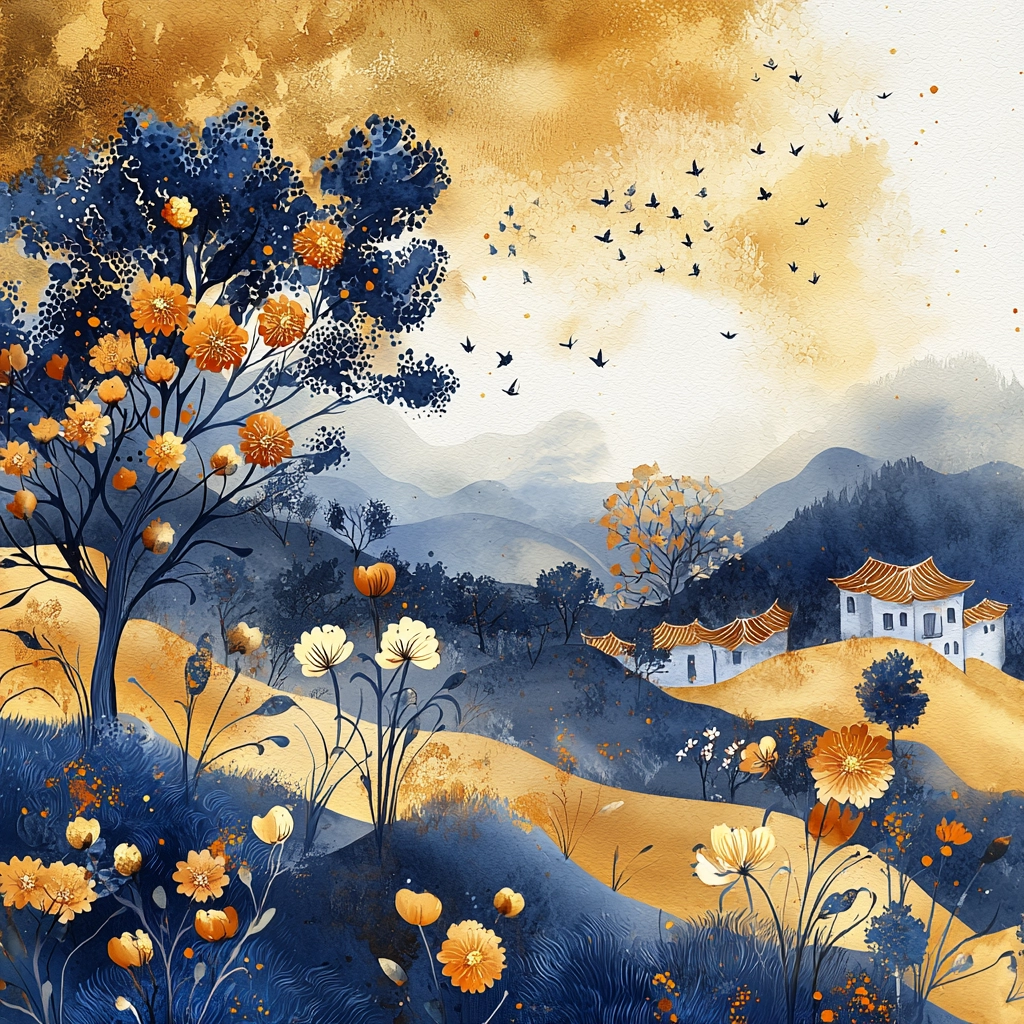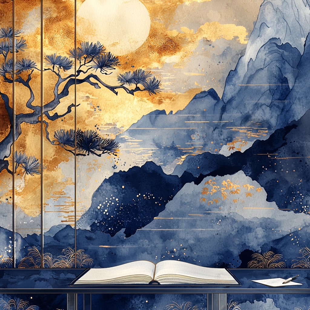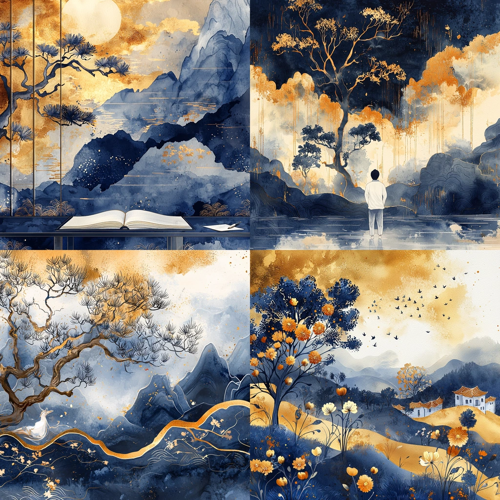 A harmonious balance of dark blue and gold hues with intricate compositions.