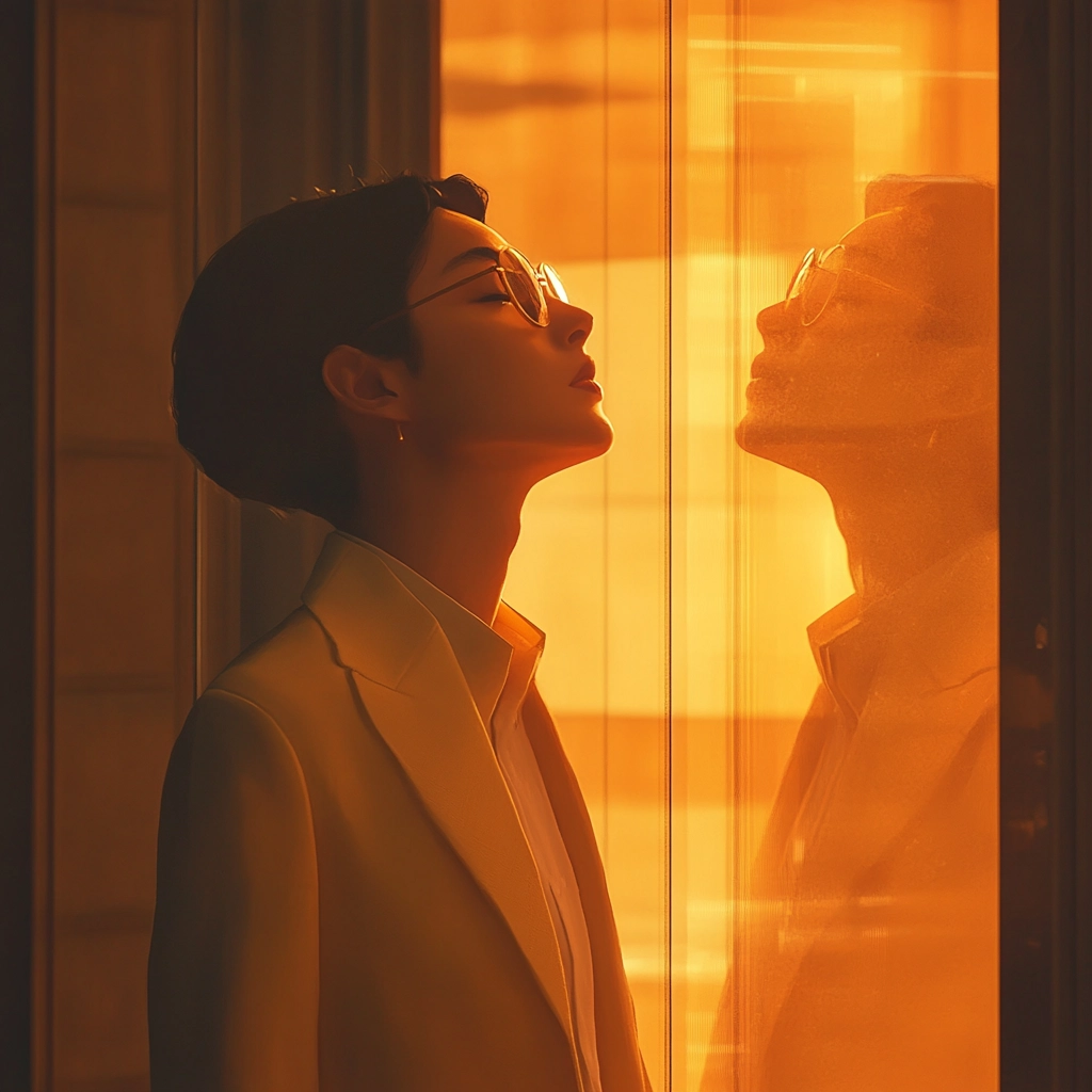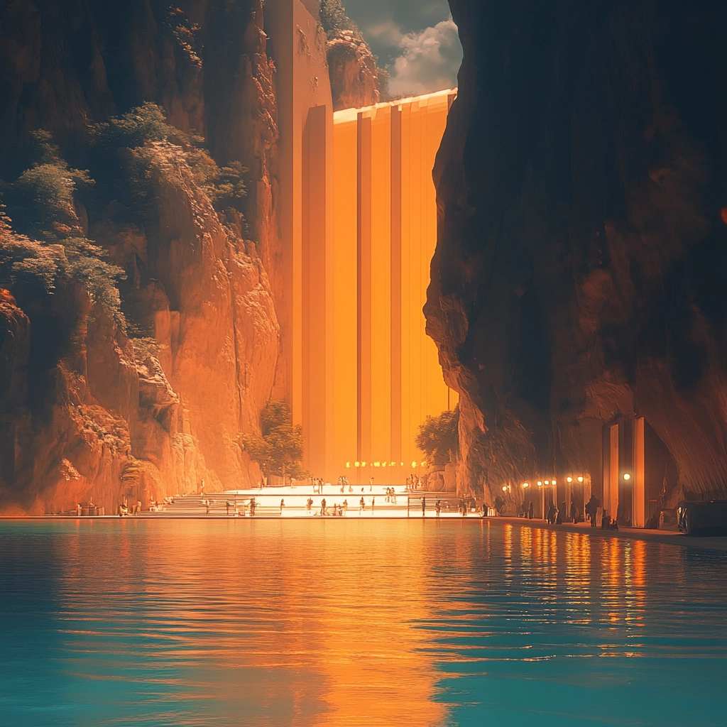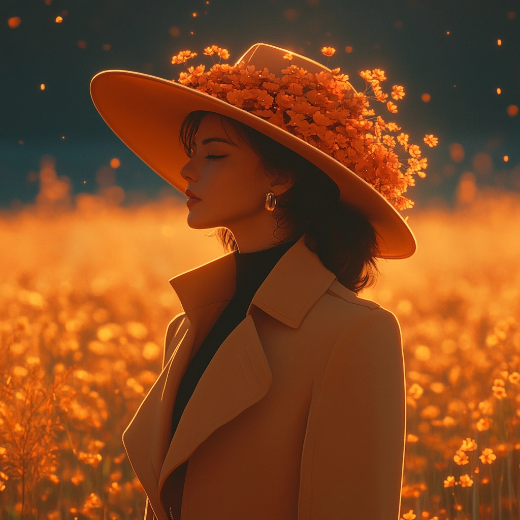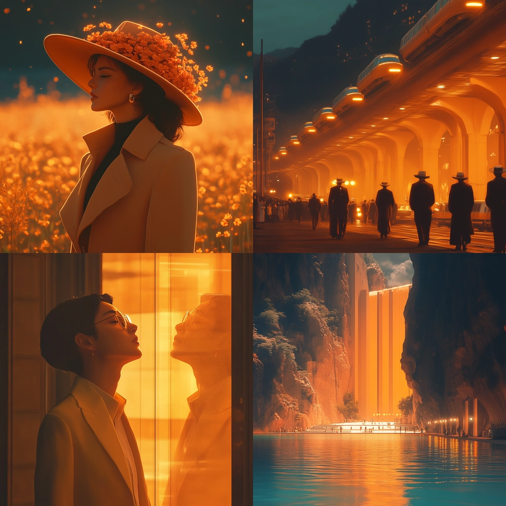 The use of artificial lighting creates an intense glow, enriching the prominent orange tones. There is a strong sense of depth achieved through the contrast between light and shadow, and the smooth textures are enhanced by the interplay of warm and cool colors.