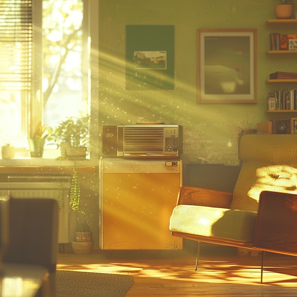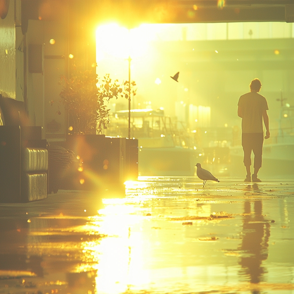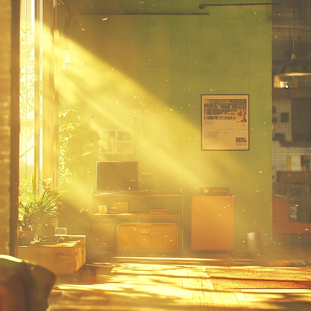 The use of golden light accentuates warmth, enhancing the texture by creating reflections and shadows. The spatial arrangement feels expansive while maintaining a close, intimate focus. Surface textures are softly blurred yet retain sufficient detail through the light interplay.