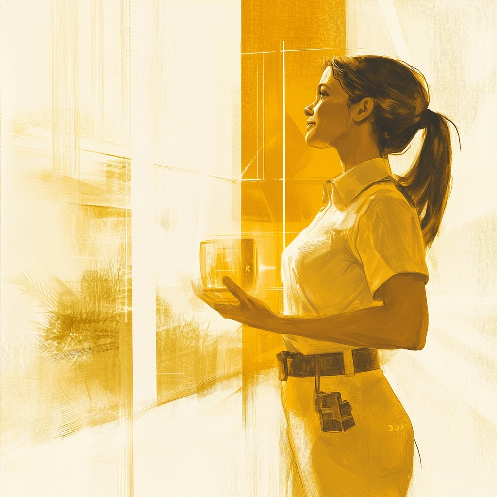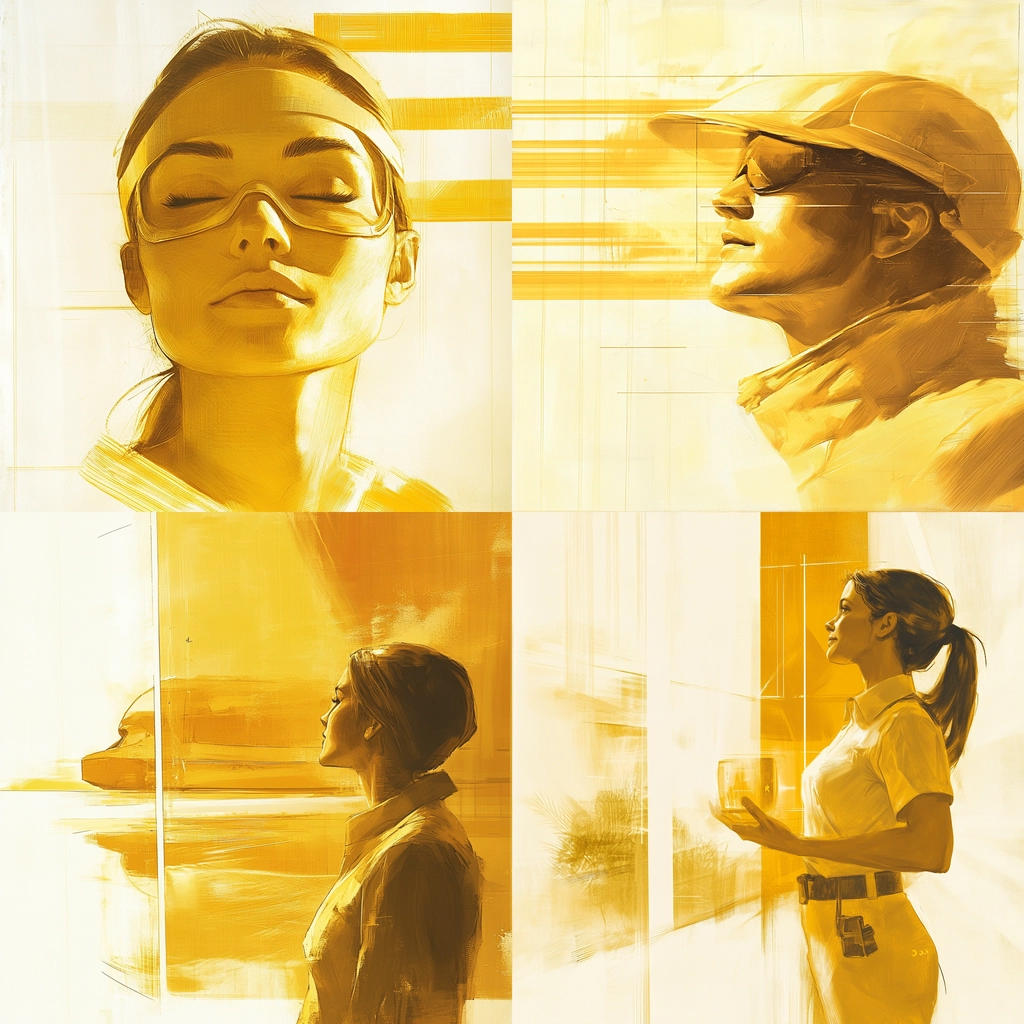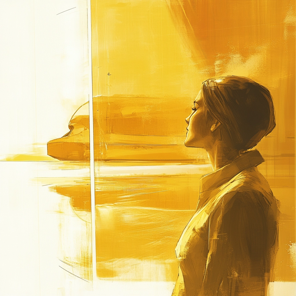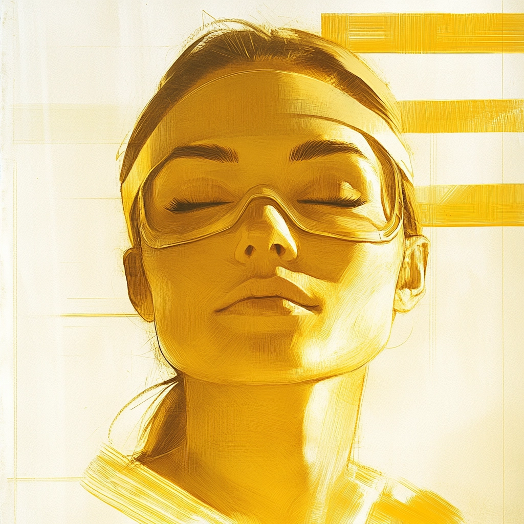 The use of light gives an impression of both soft diffusion and sharp delineation, characterized by a contrast of bright yellows with softer white areas. Linear elements create a sense of rhythm and directionality, enhancing spatial perception.
