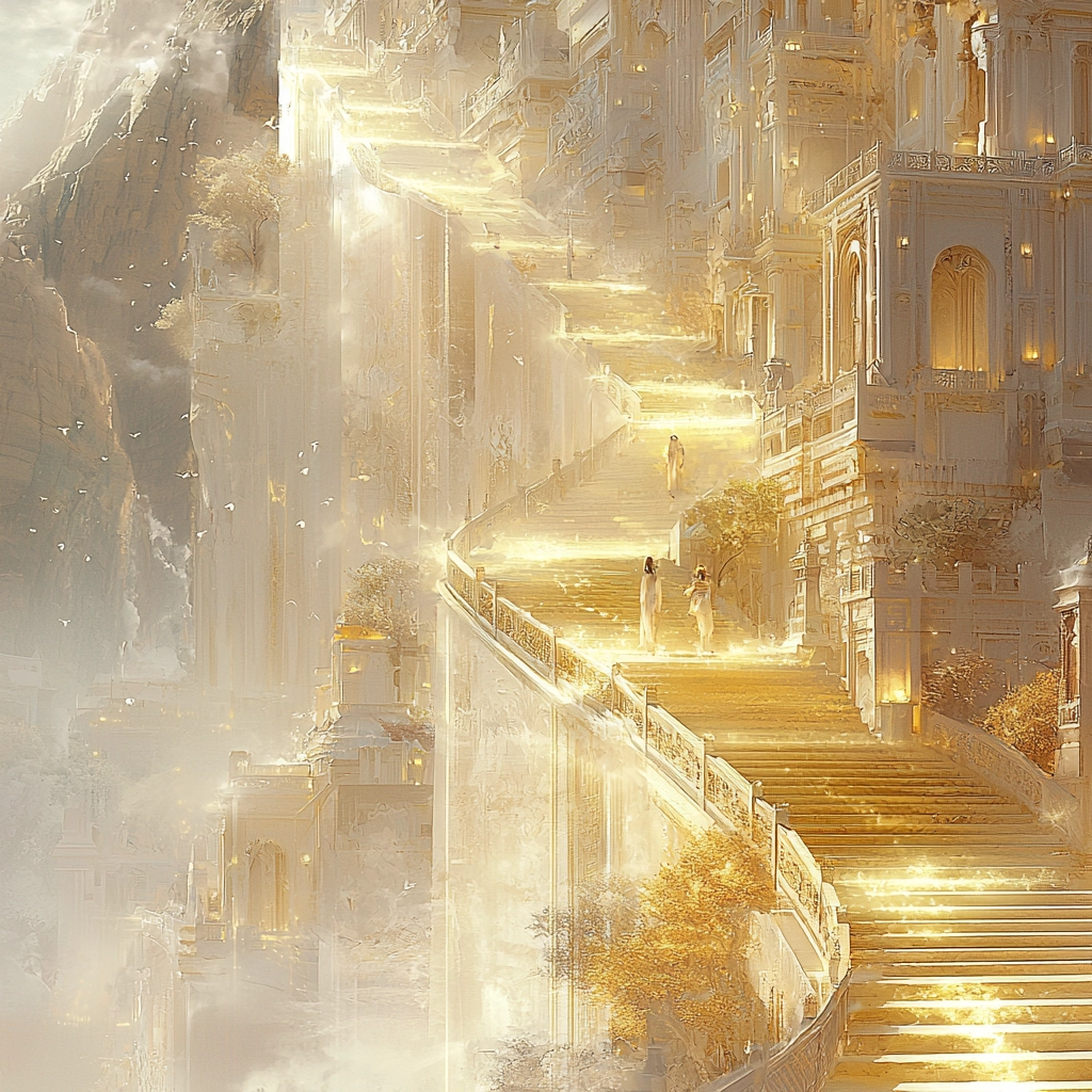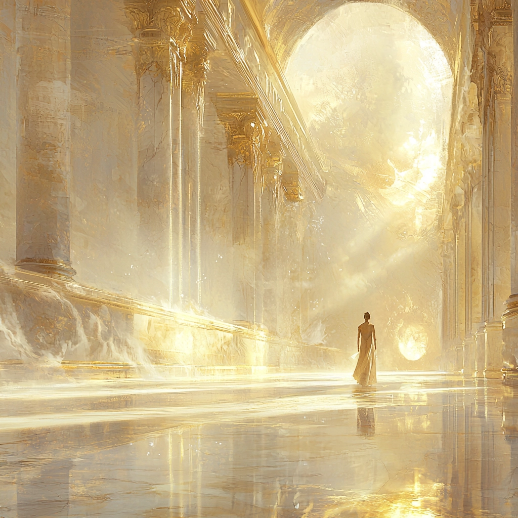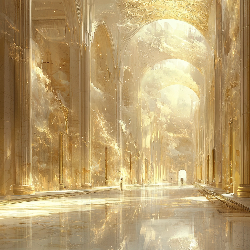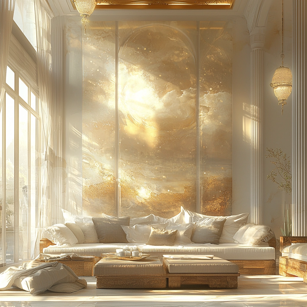 The use of gold and white color contrasts creates a glowing effect, highlighted by strategic light focusing. The expansive spaces are emphasized through reflective surfaces, enhancing the sense of grandeur and opulence while soft textures blend fluidly with strong architectural lines.