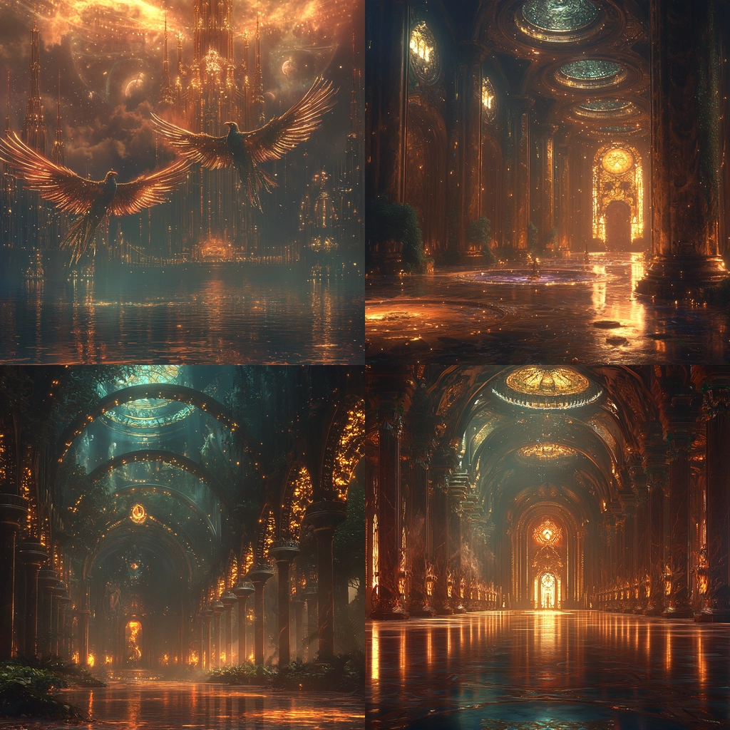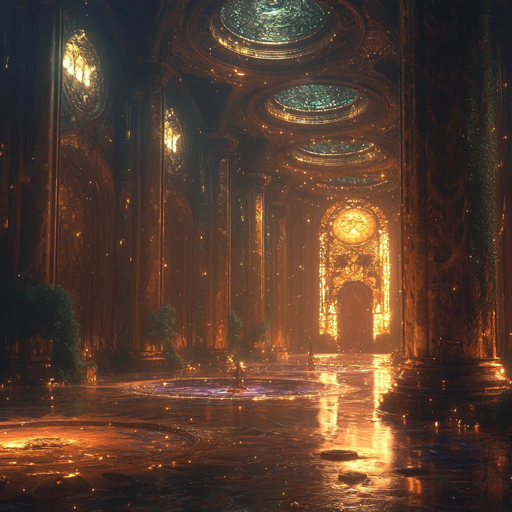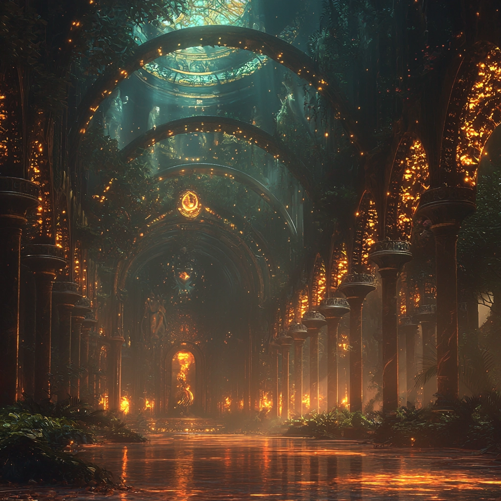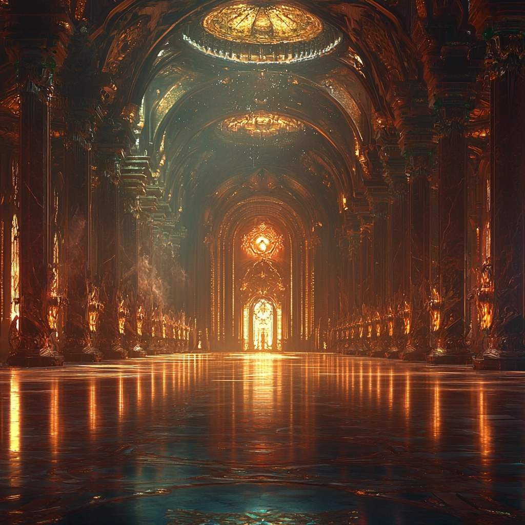 Vibrant golden lighting underscores a sense of grandeur and elegance, highlighting dark blue shadows that define depth and space. Textures are smooth with a soft glow effect enhancing architectural details.