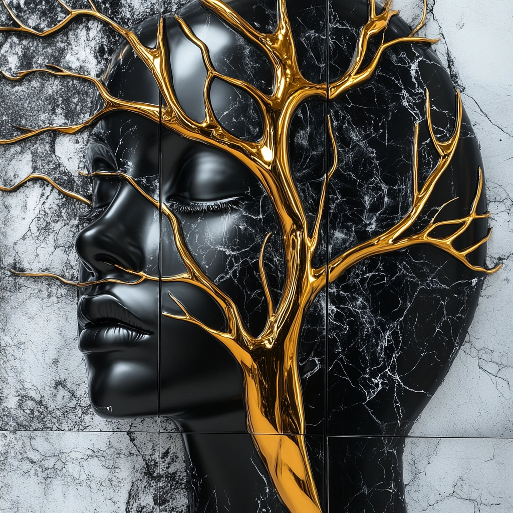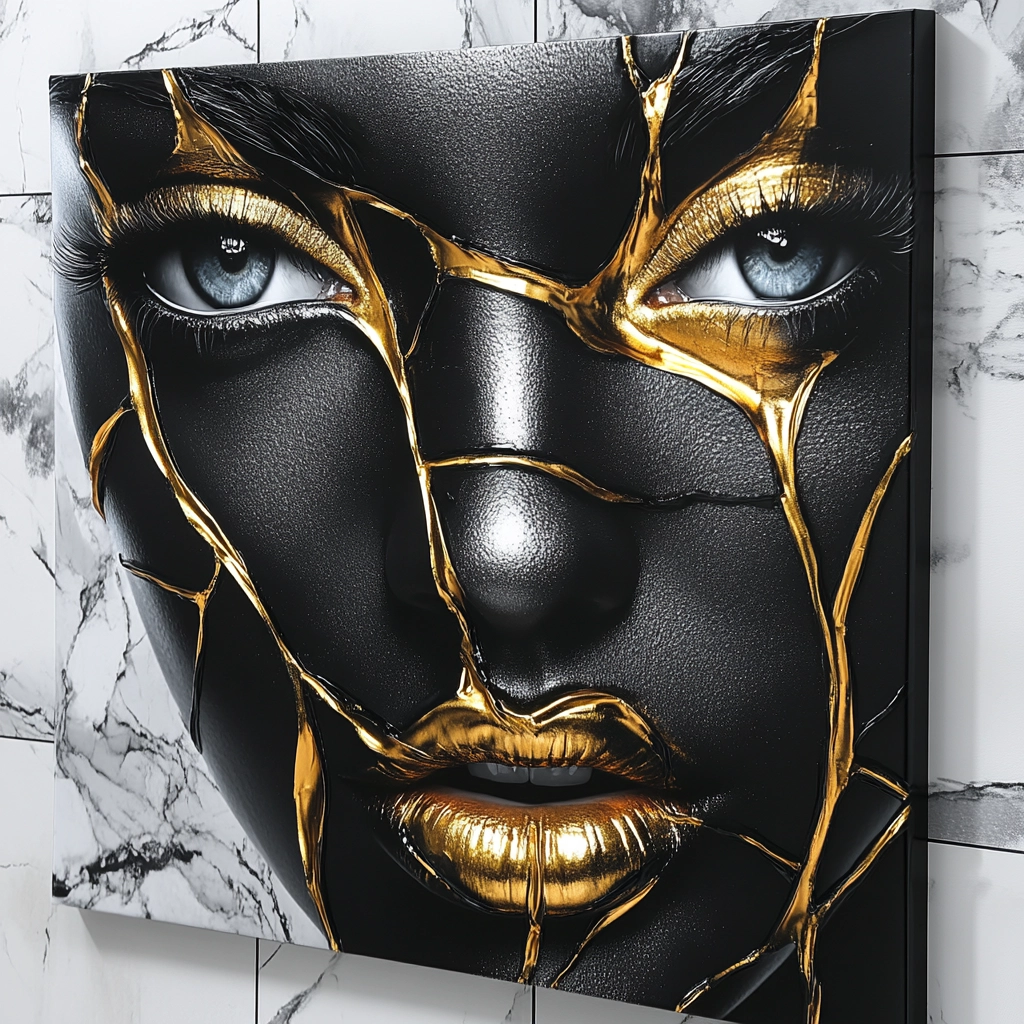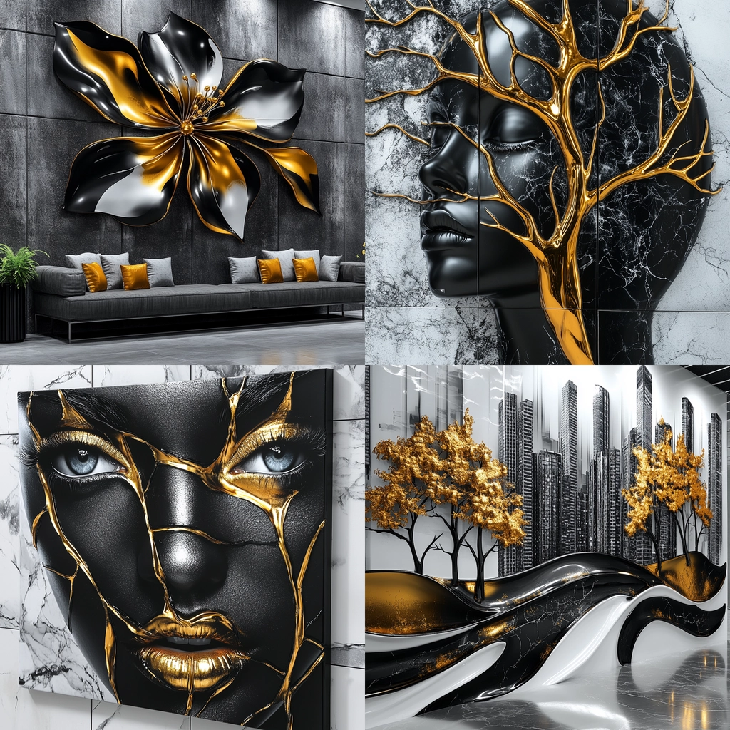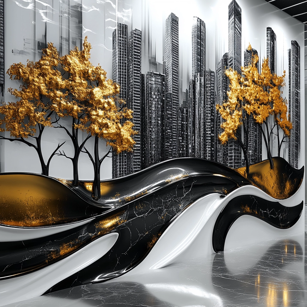 The lighting highlights the glossy textures and high contrast between the deep black and shimmering gold tones. The white marble adds elegance and spatial depth, resembling a polished surface with its crisp lines and structured flow.