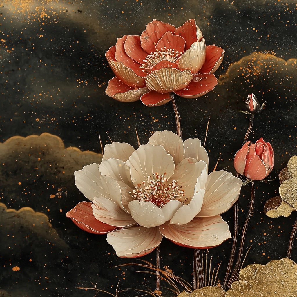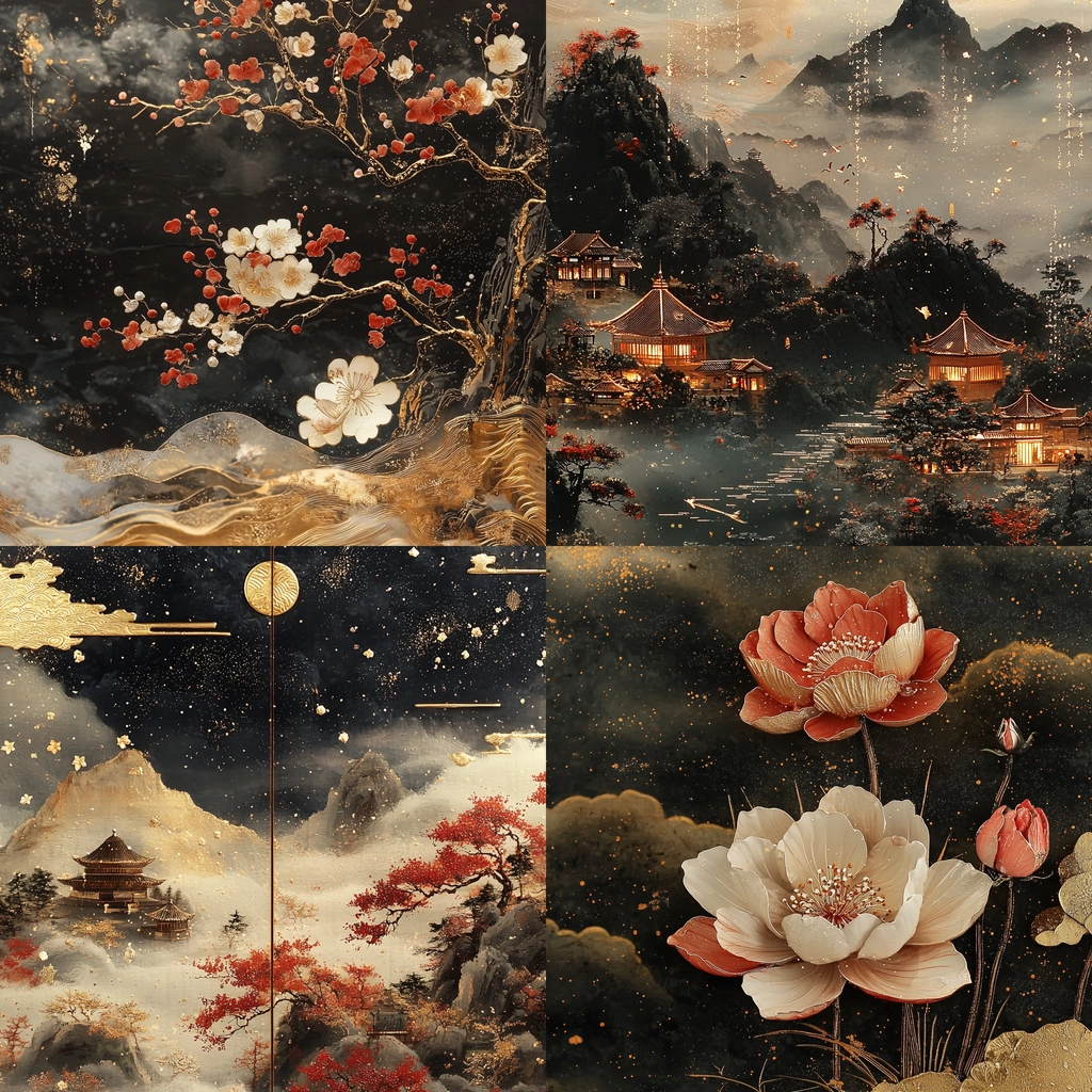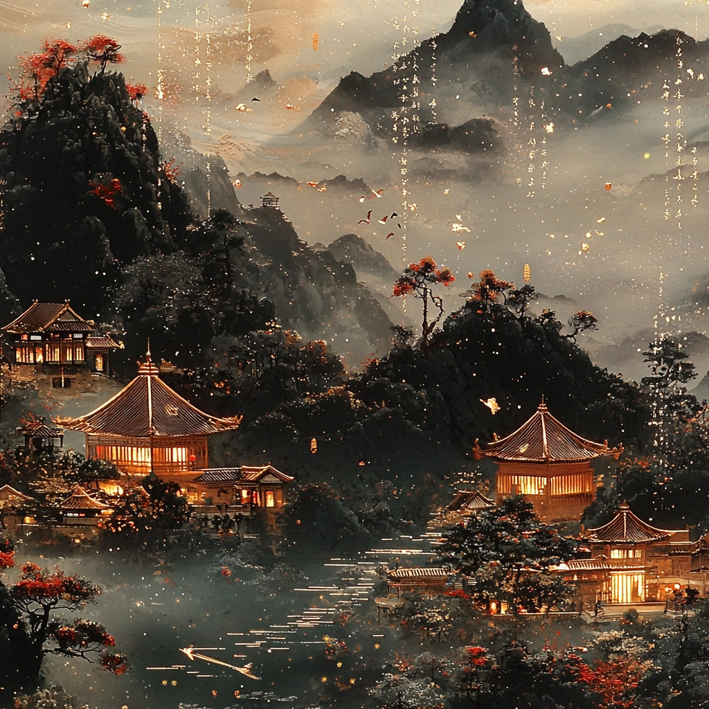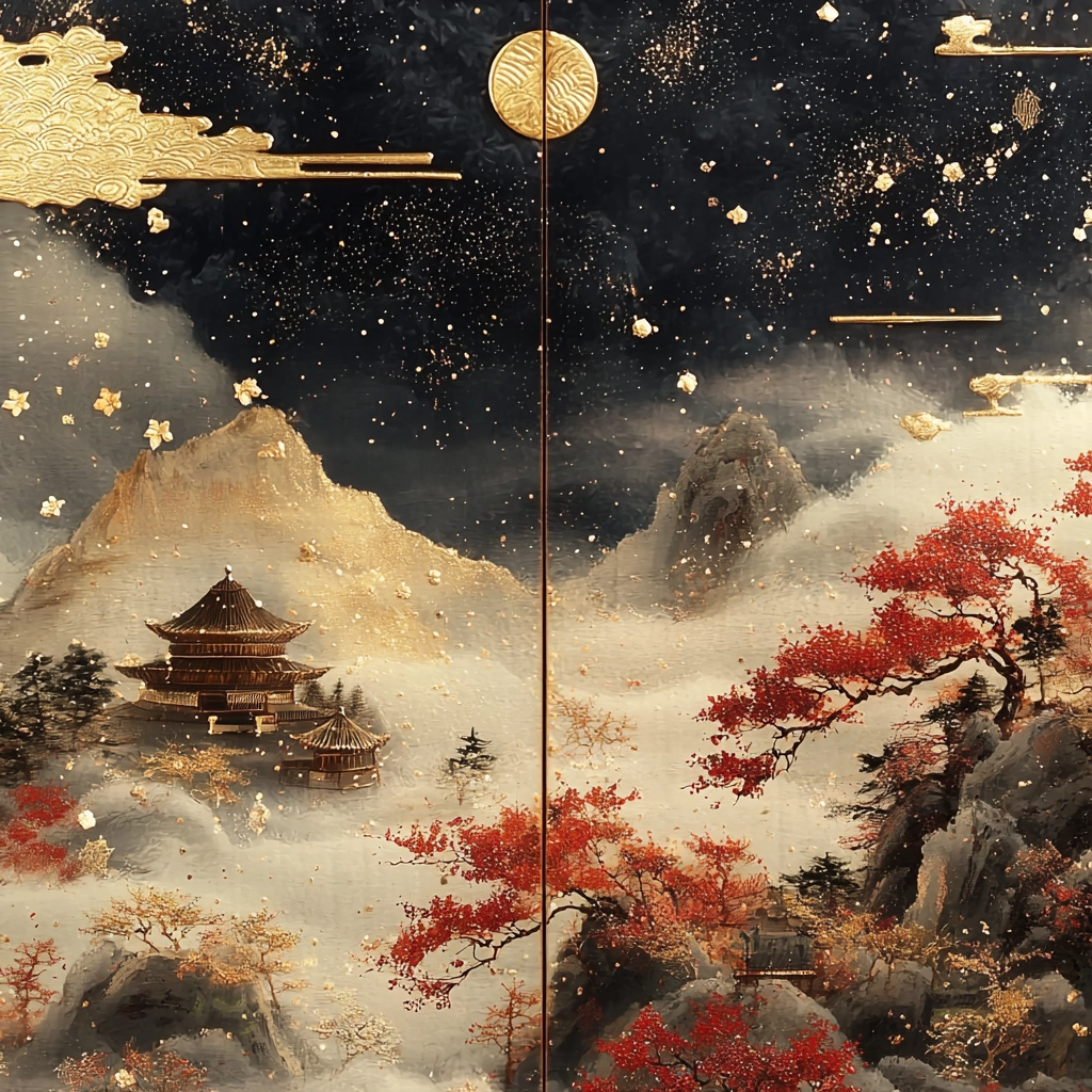 The use of gold creates a luminous lighting effect that accentuates the depth and intricate textures against the dark, moody backdrop. Red elements add vibrant accents, while delicate color transitions enhance the spatial composition and sophisticated detailing.