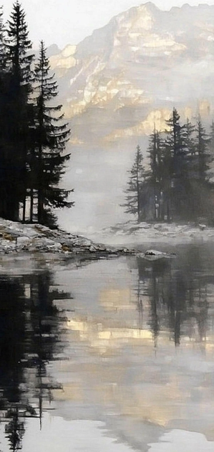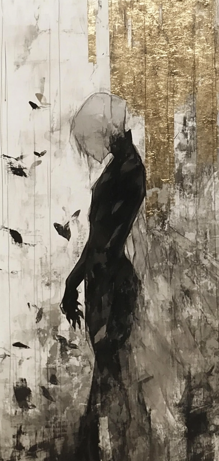 The interplay of light creates depth, highlighting the gold against the muted background. The textured brushstrokes suggest a dense terrain, while shadows add dimension to the scene.