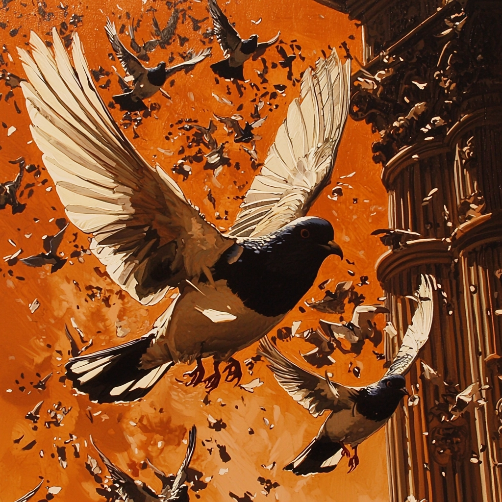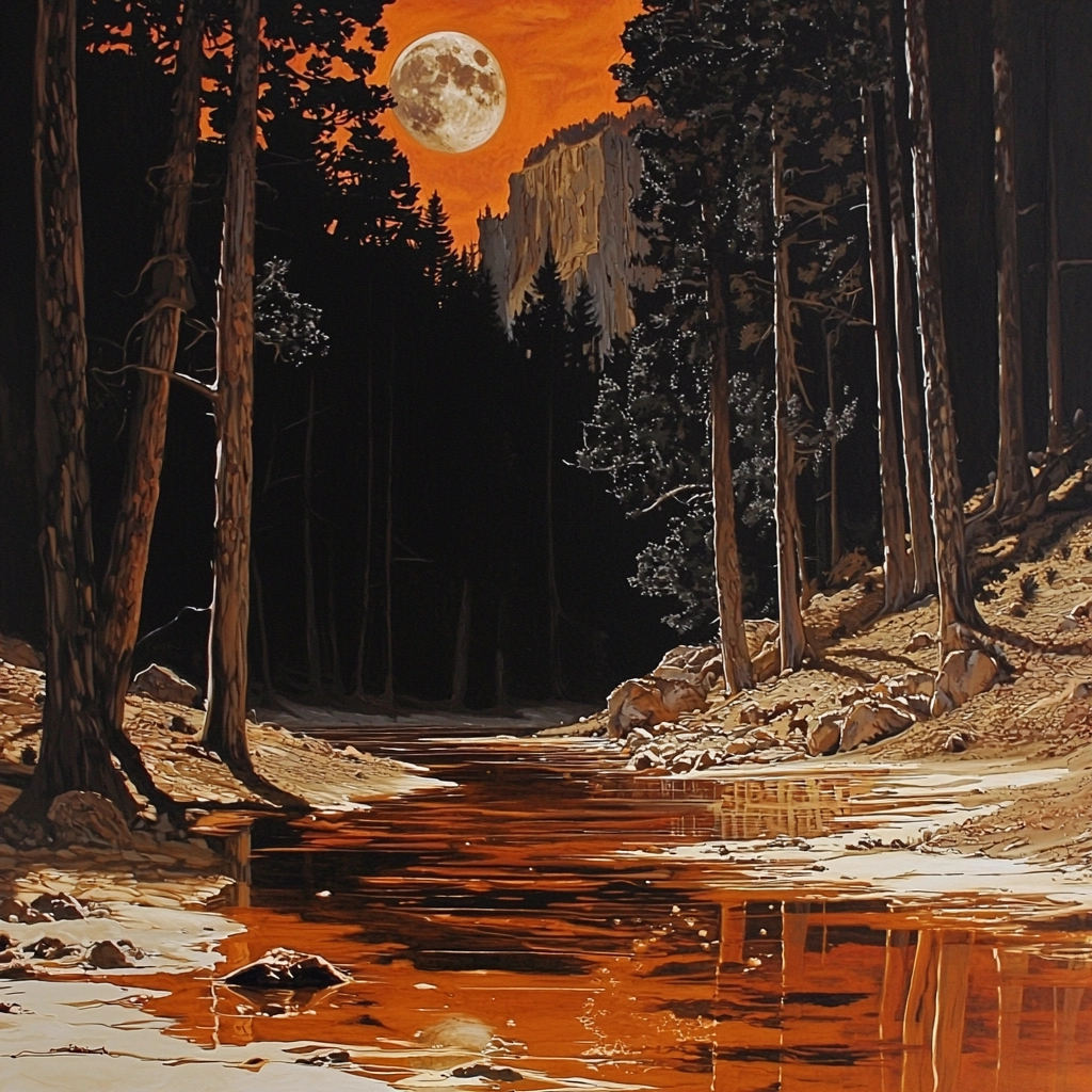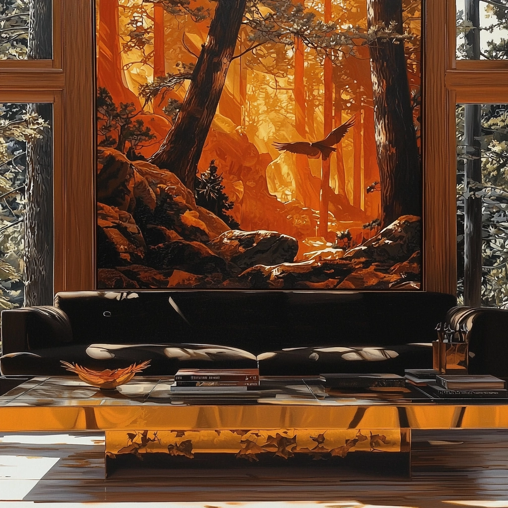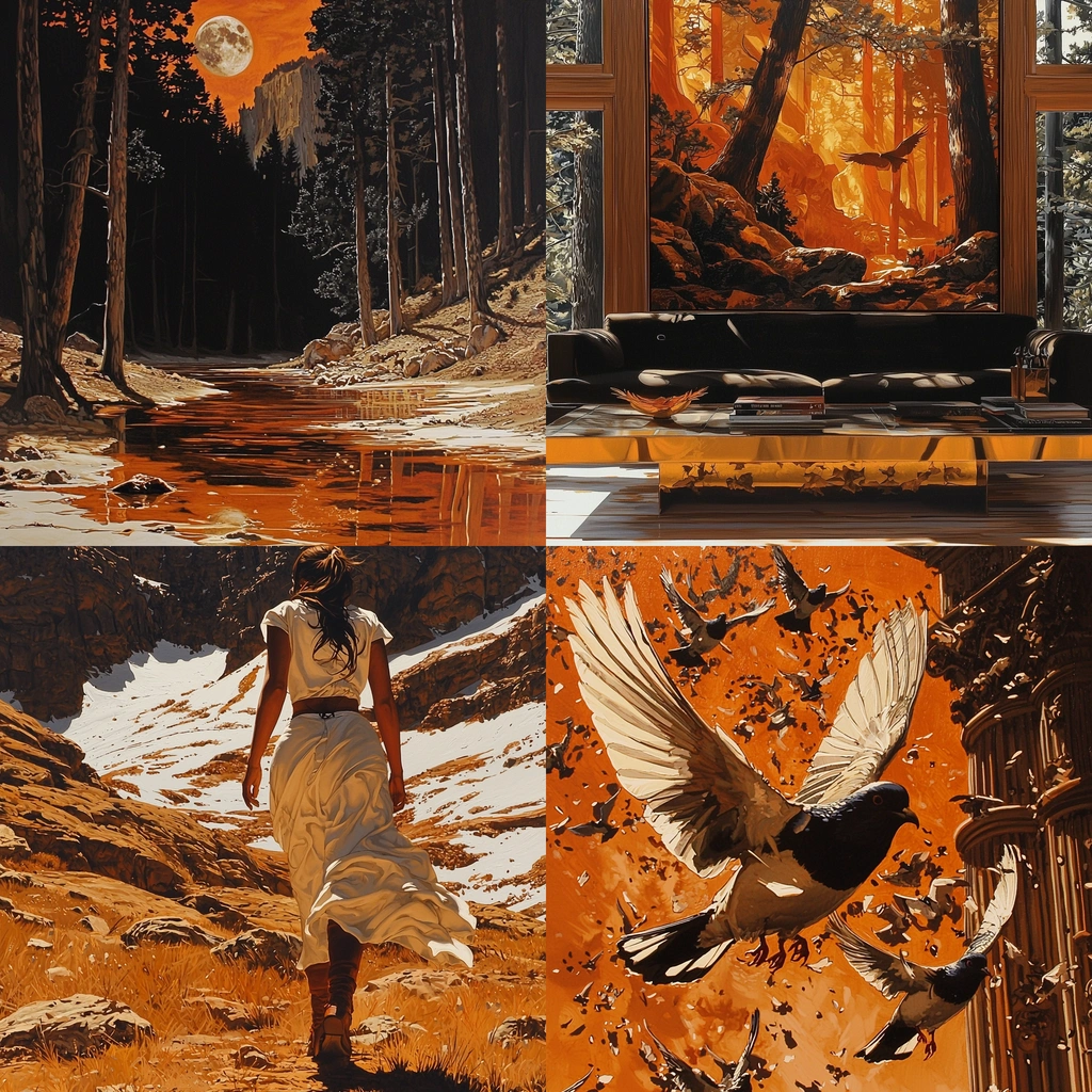 The use of lighting creates an interplay between illuminated and shadowed areas, contrasting the warmth of orange with the earthiness of brown, while textures evoke a tactile sense of the environment.