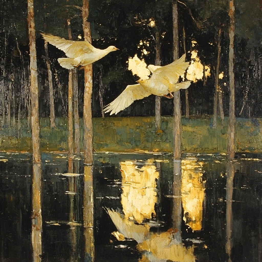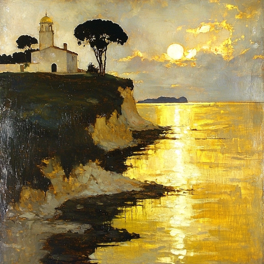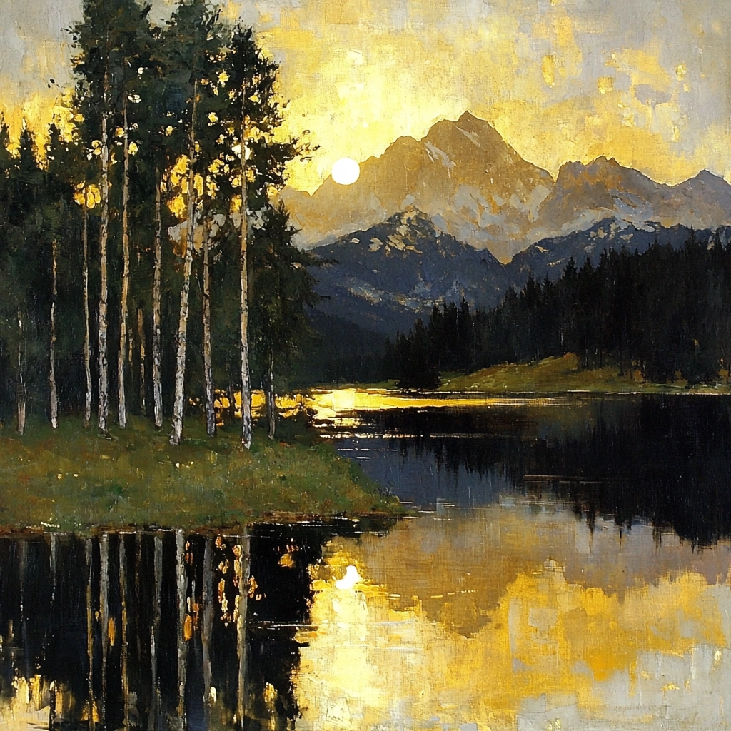 A harmonious interplay of golden light and reflective surfaces dominates the composition, creating a sense of tranquility.