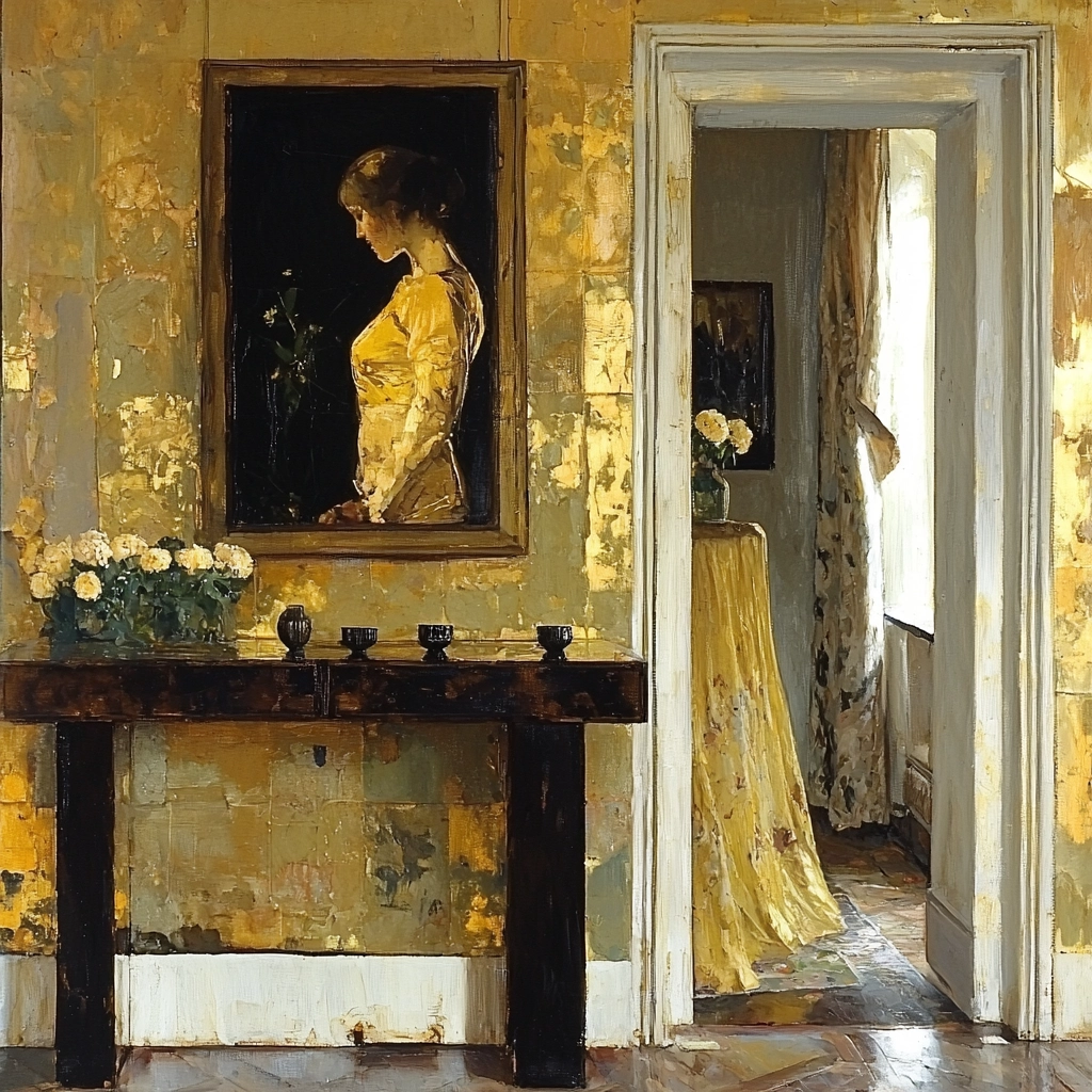 The lighting effects emphasize golden hues, casting a warm glow over reflective surfaces. Colors are rich and saturated, with dynamic contrast. The texture conveys a vivid sense of depth, enhancing spatial elements.