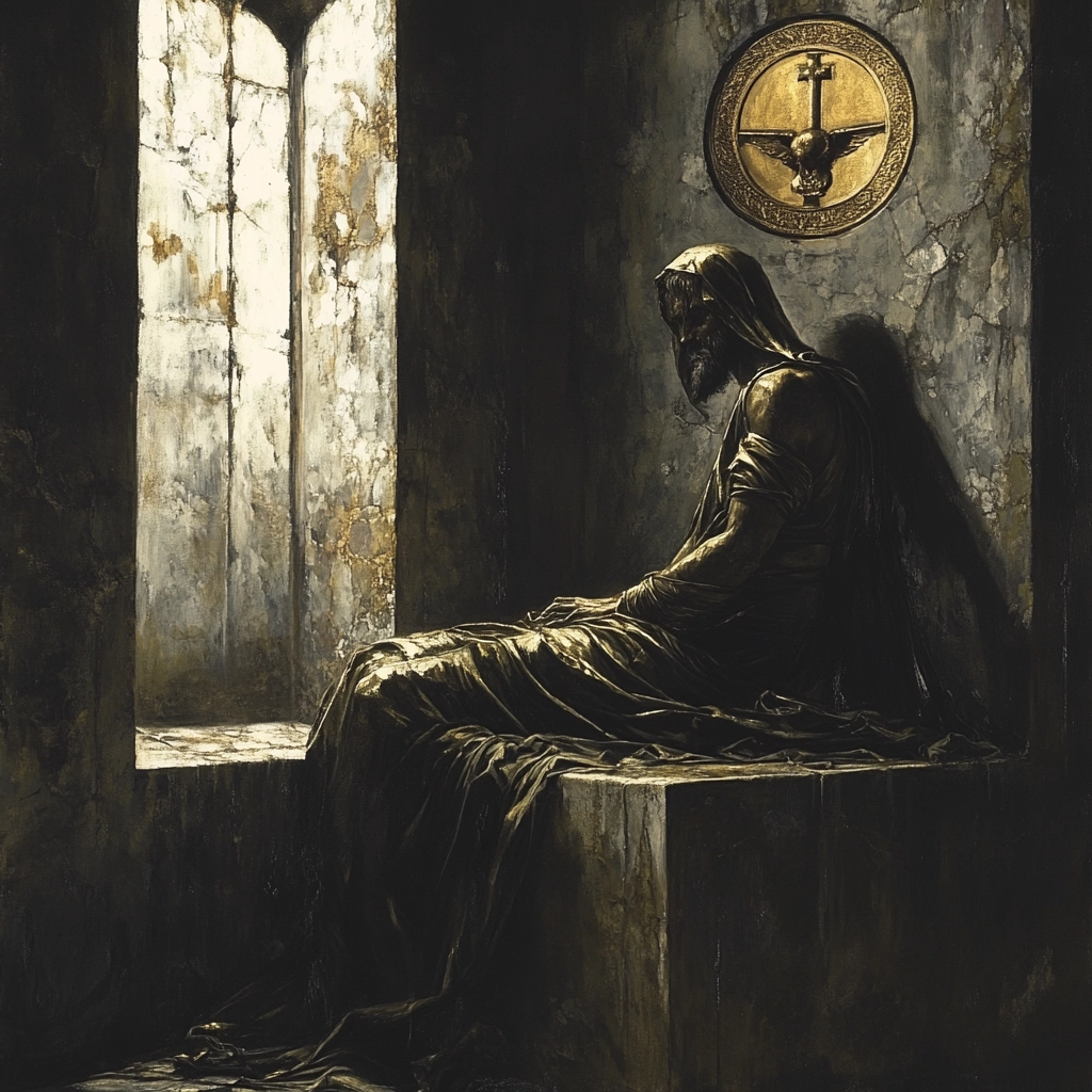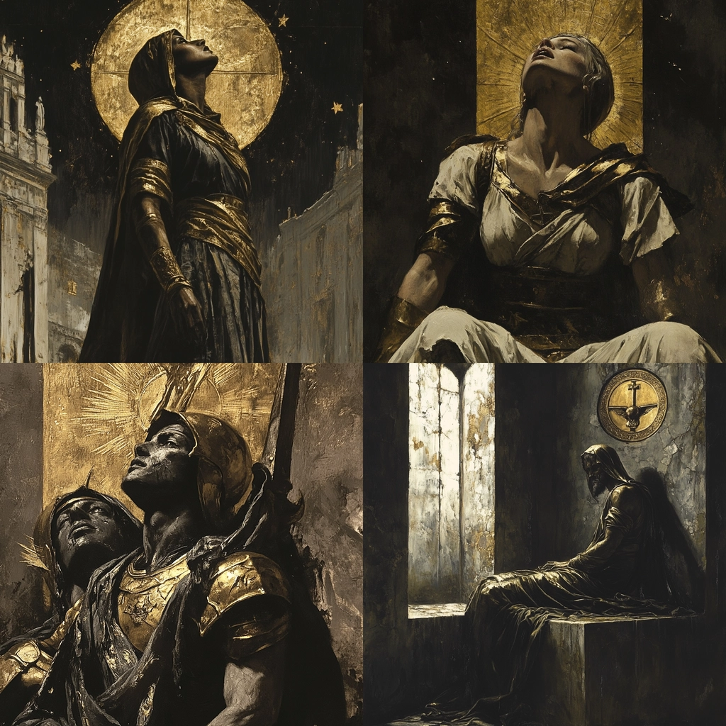 Illumination is directed to highlight forms, creating striking contrast against deep shadows. The golden hues project a strong luminance that gives depth to the scene, while the textural richness achieves a tactile quality through meticulous brushwork and layered tones.