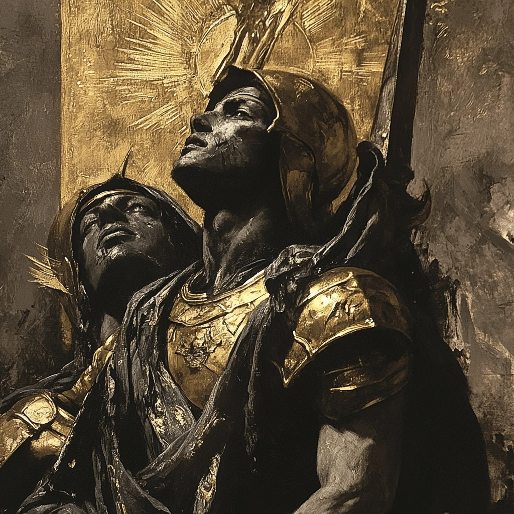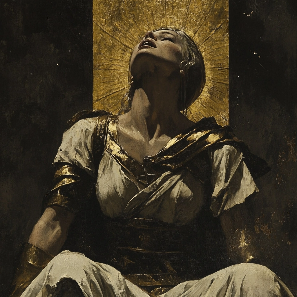 Rich gold and deep brown tones enhance the dramatic, illuminated composition.