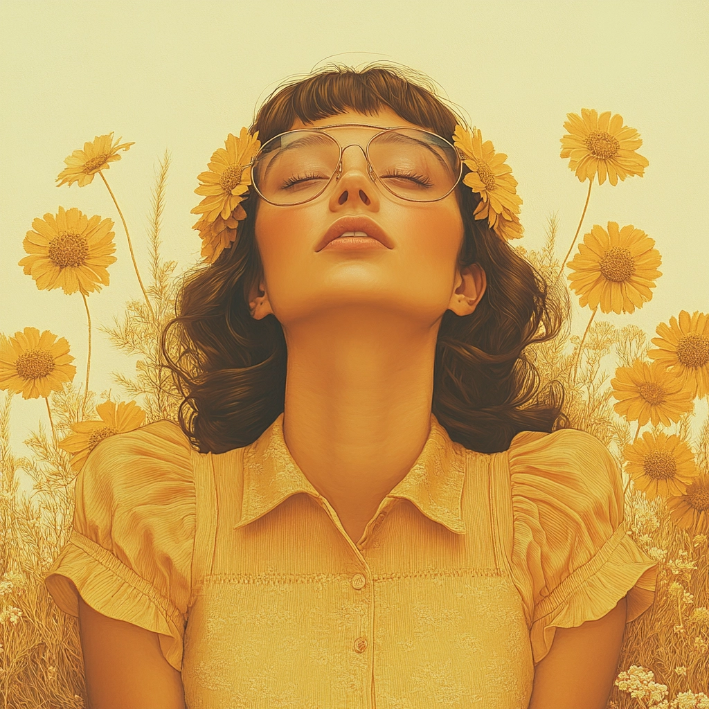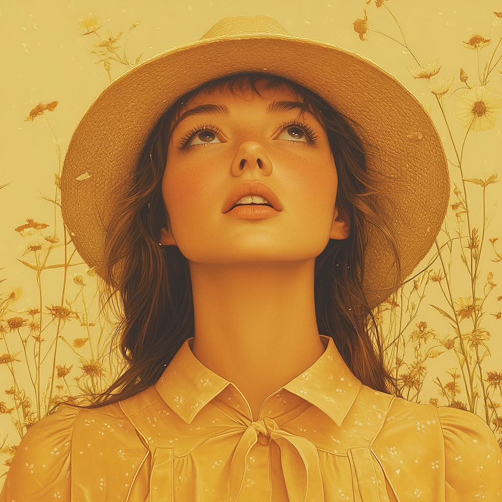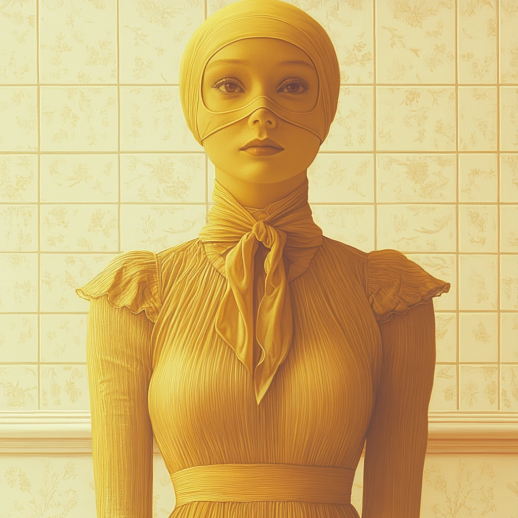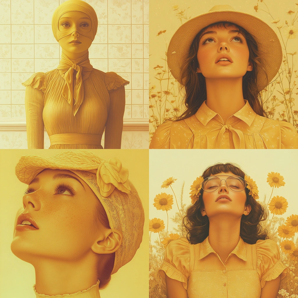 The warm yellow hues create a nostalgic glow, enhancing the sepia-like vintage feel. Soft lighting emphasizes texture variations across textiles, while a shallow depth of field enriches spatial perception.