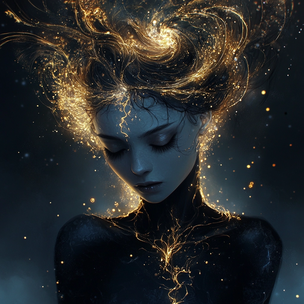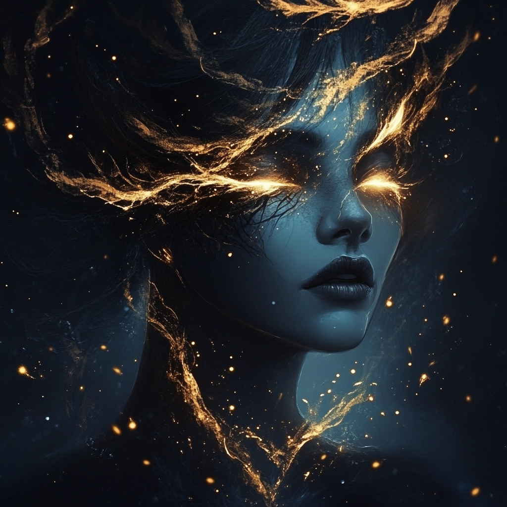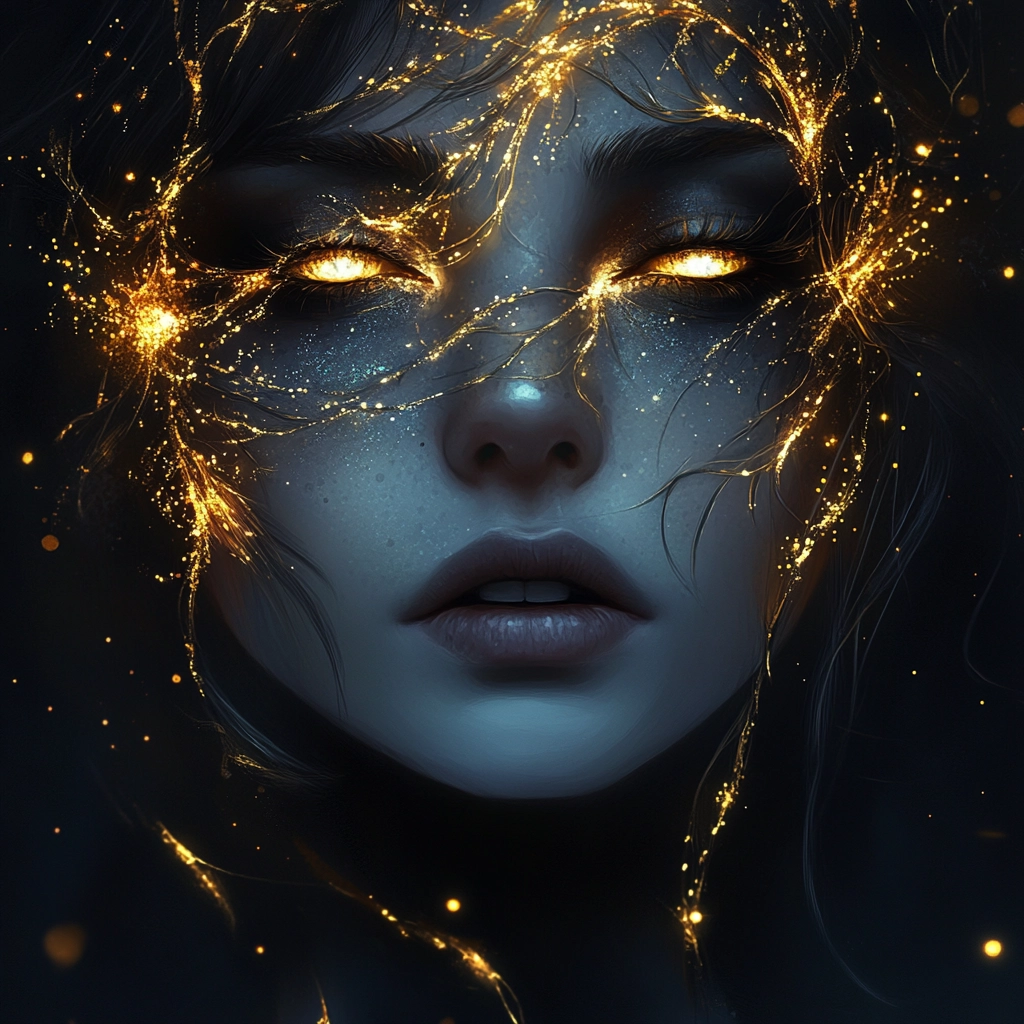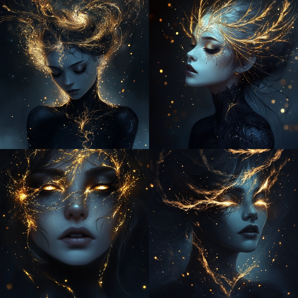The lighting casts a dramatic, almost electric glow, contrasting dark blue and gold hues. Light streaks create movement, providing depth and dimensionality. Textures are vivid and finely detailed, with a sense of fluidity in the golden streaks.