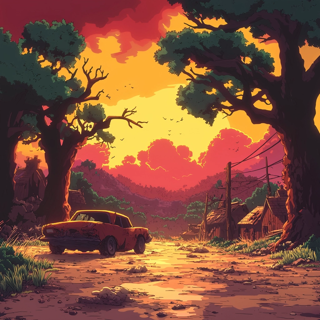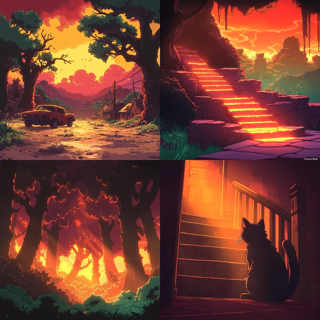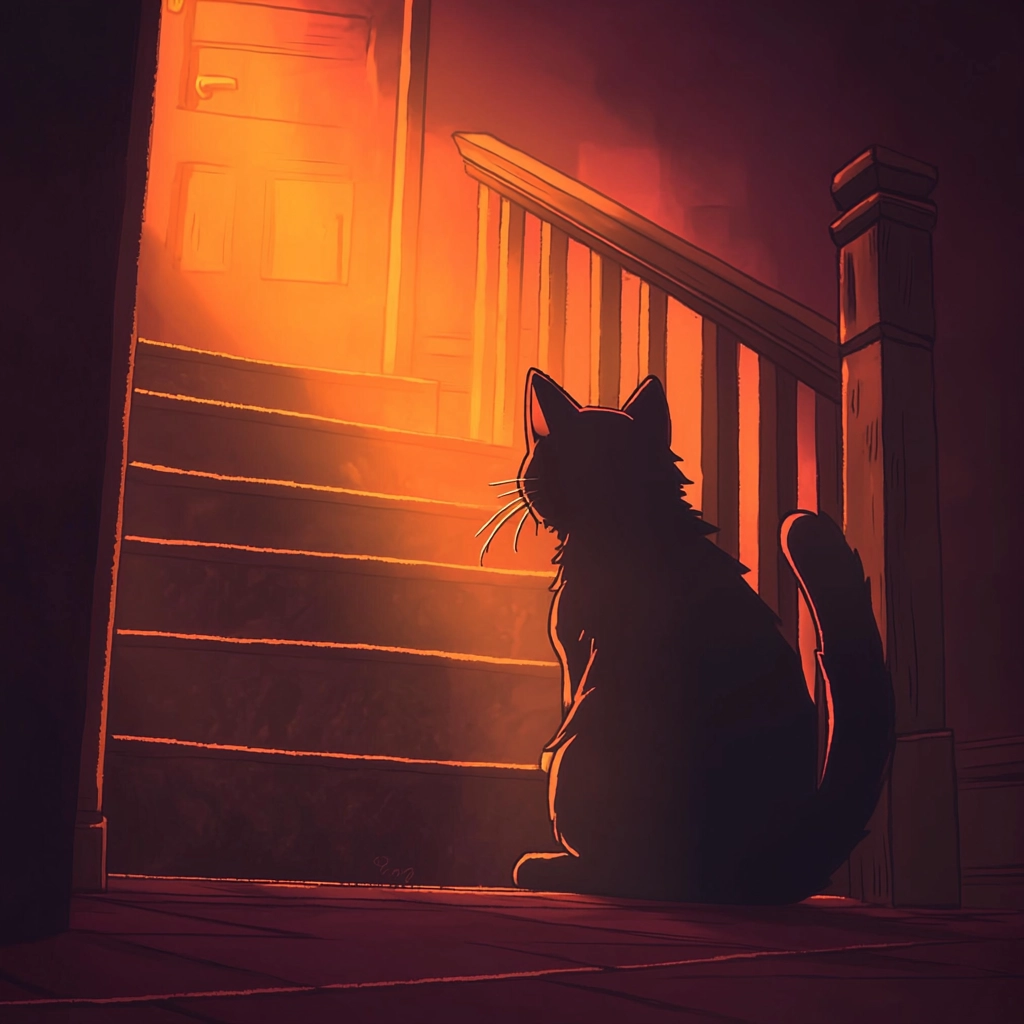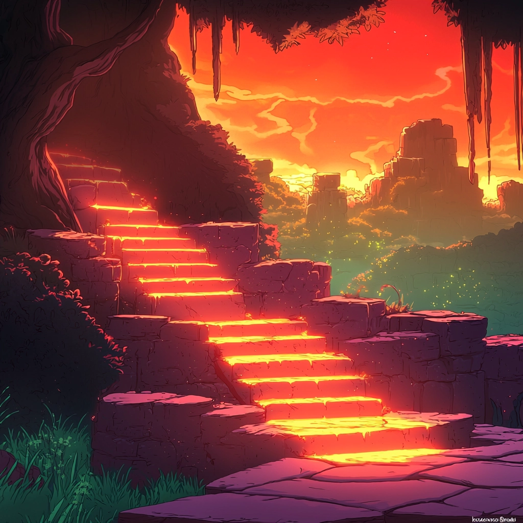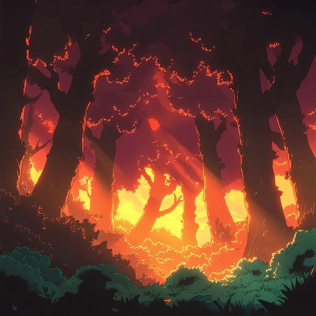 Dramatic lighting emphasizes orange tones, creating a sense of warmth and depth. The transition from bright highlights to dark shadows enhances the spatial arrangement with a vivid texture contrast.