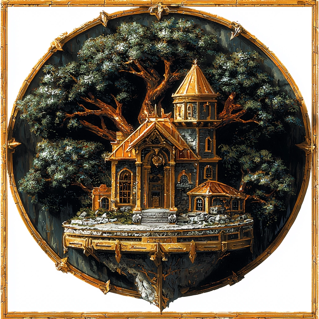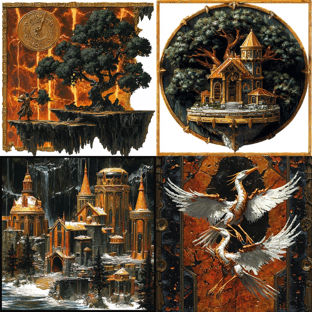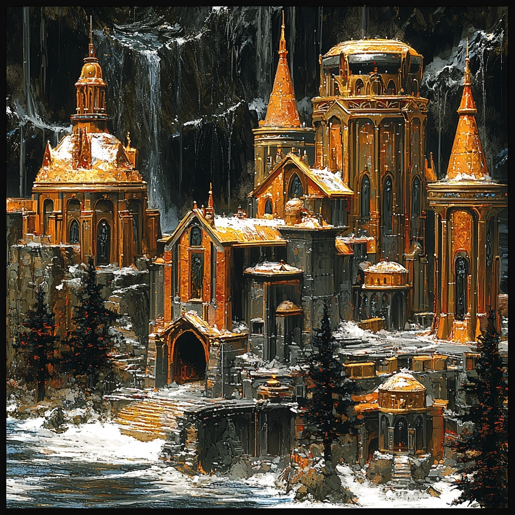 This work employs highlighted golds and oranges to illuminate the central elements, creating depth and vivid contrasts against the dark background. The surfaces reveal intricate details, giving a sense of complexity and texture. The shimmering light brings out nuances within structured forms, lending a specific visual rhythm and a layered spatial quality.