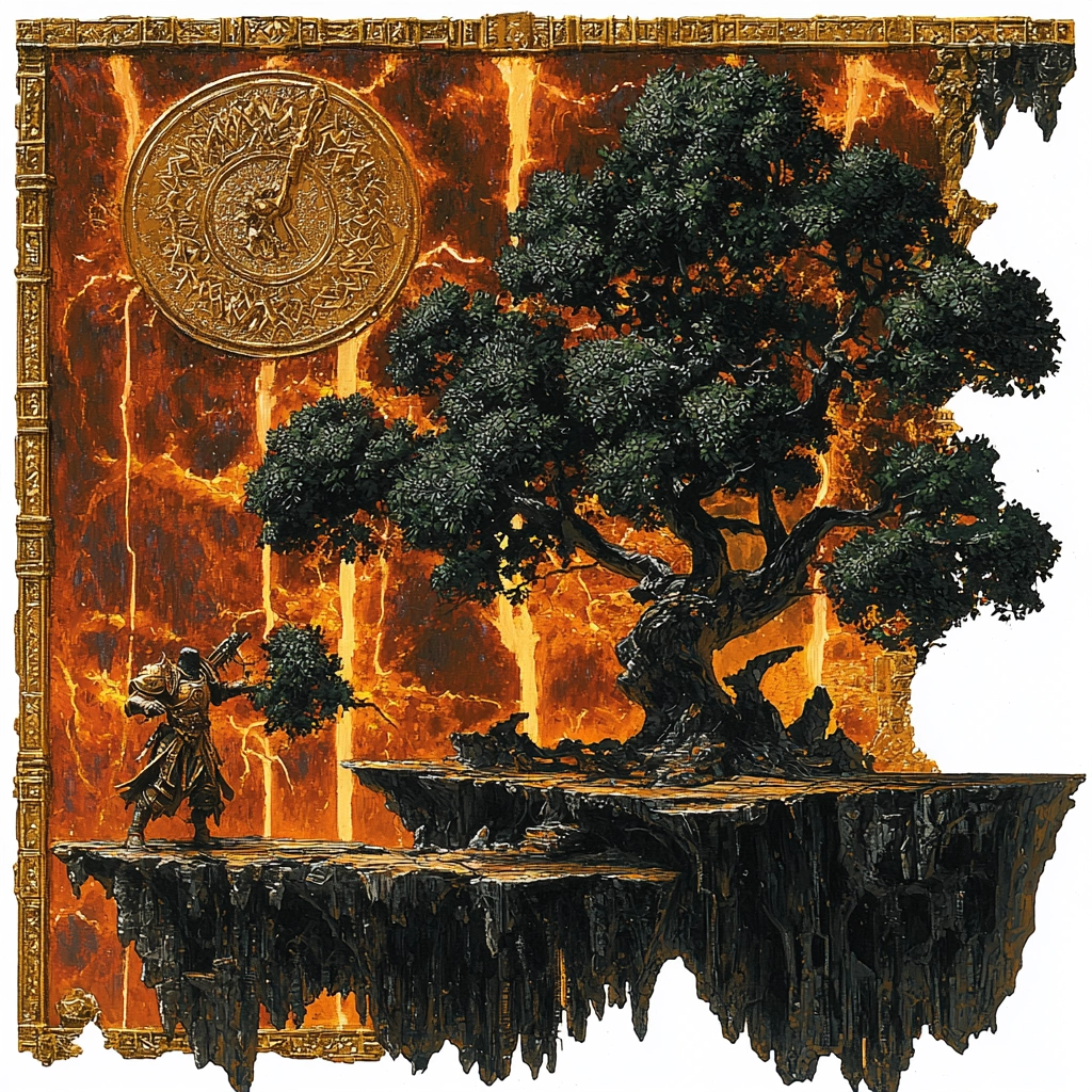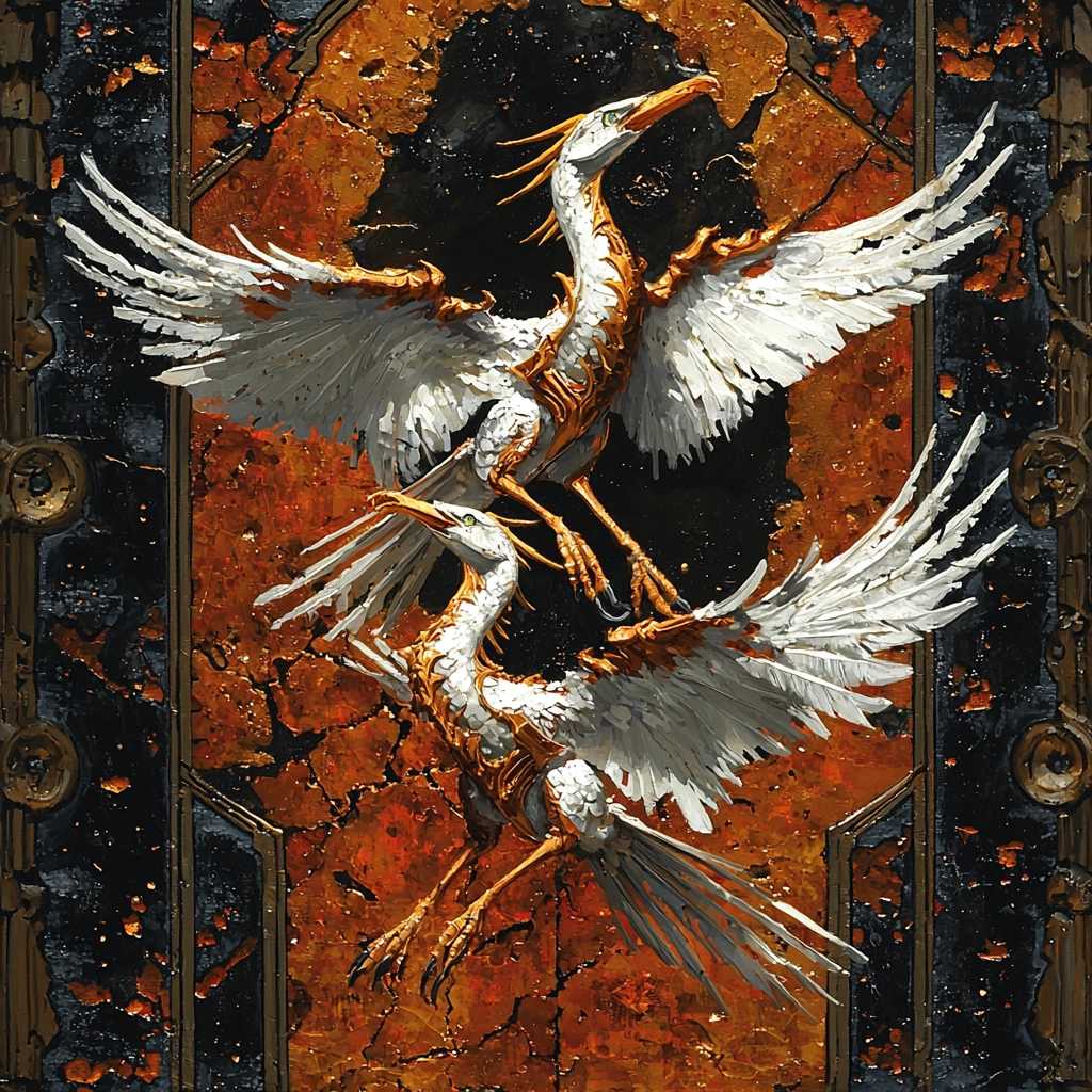 The composition features intricate detailing with prominent warm tonal contrast amid a dark backdrop.