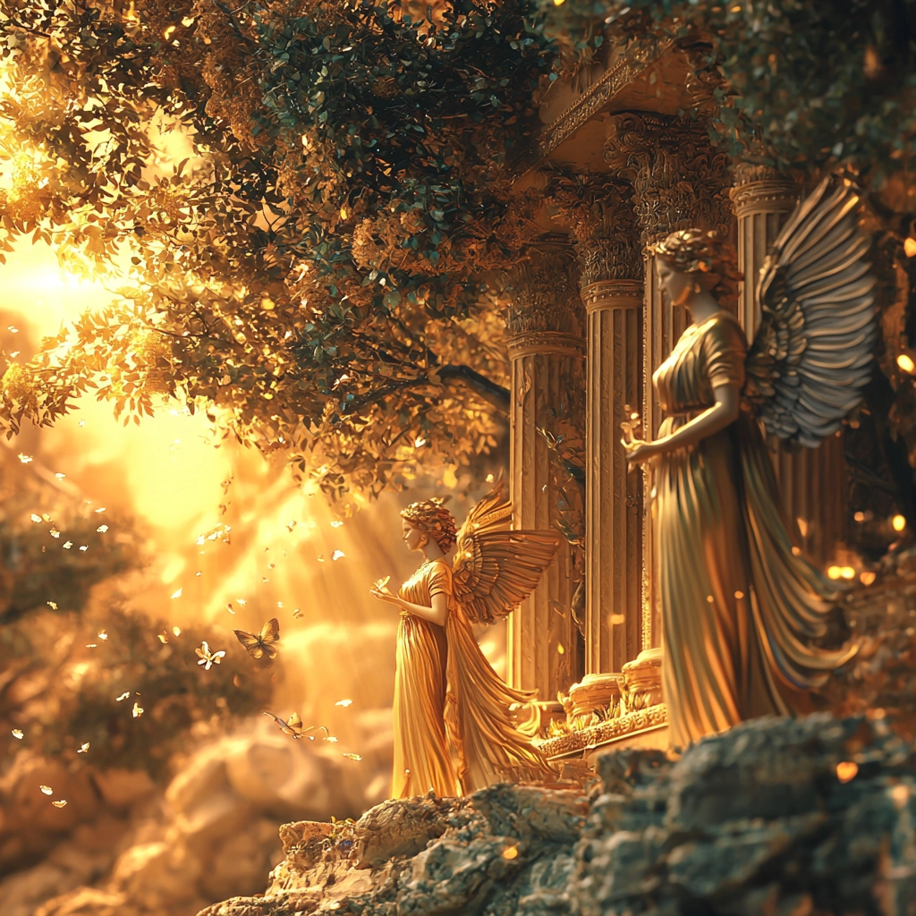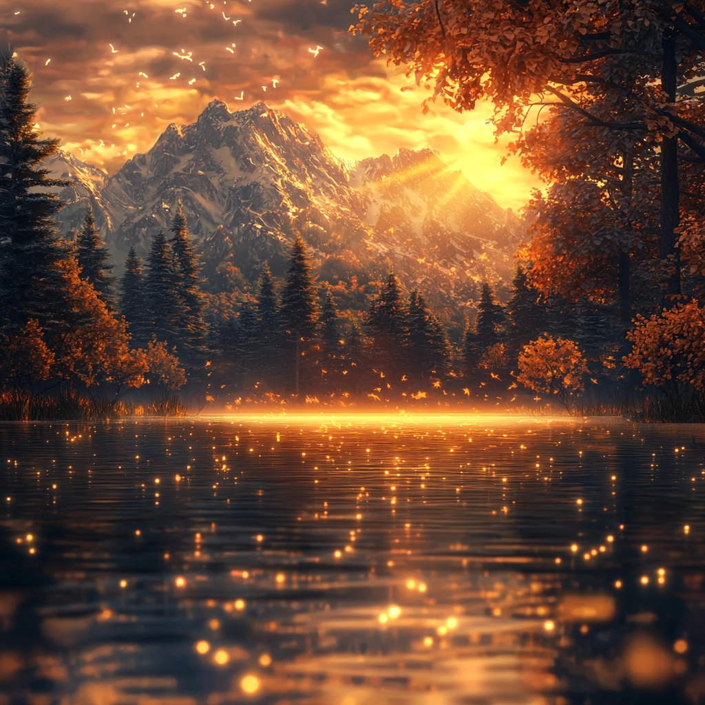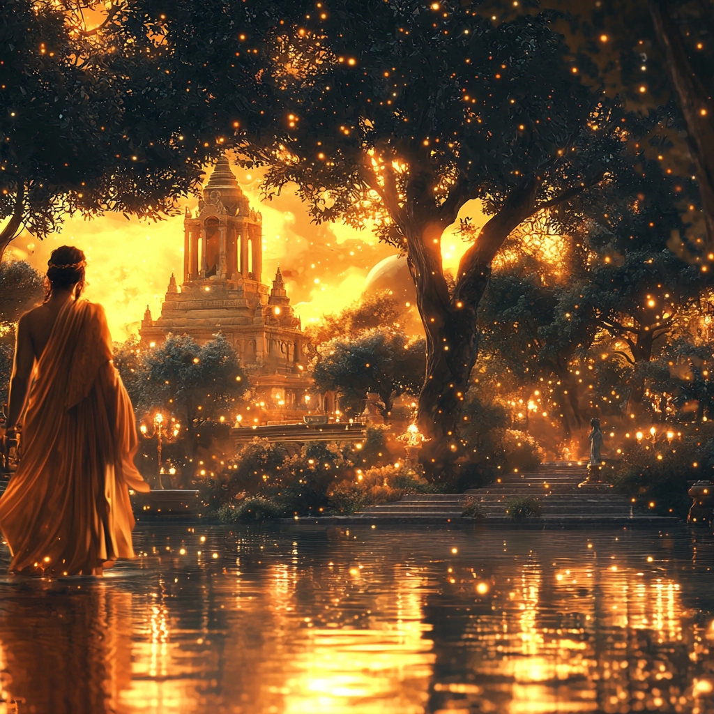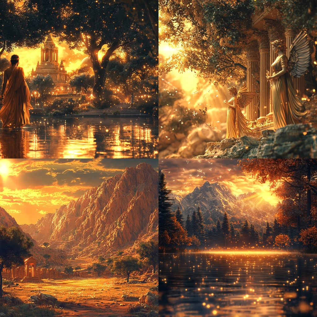 Utilizes shimmering gold tones against deep blue shadows creating a radiant and immersive effect.