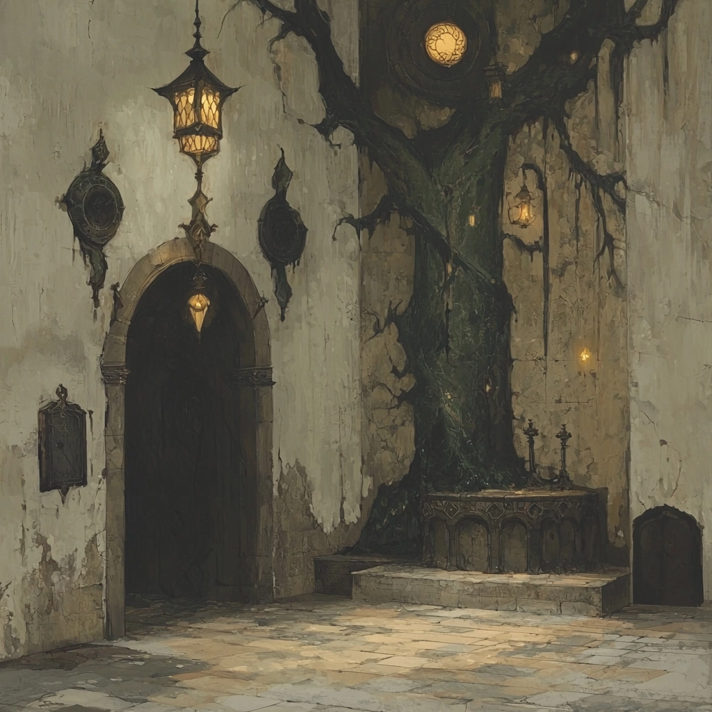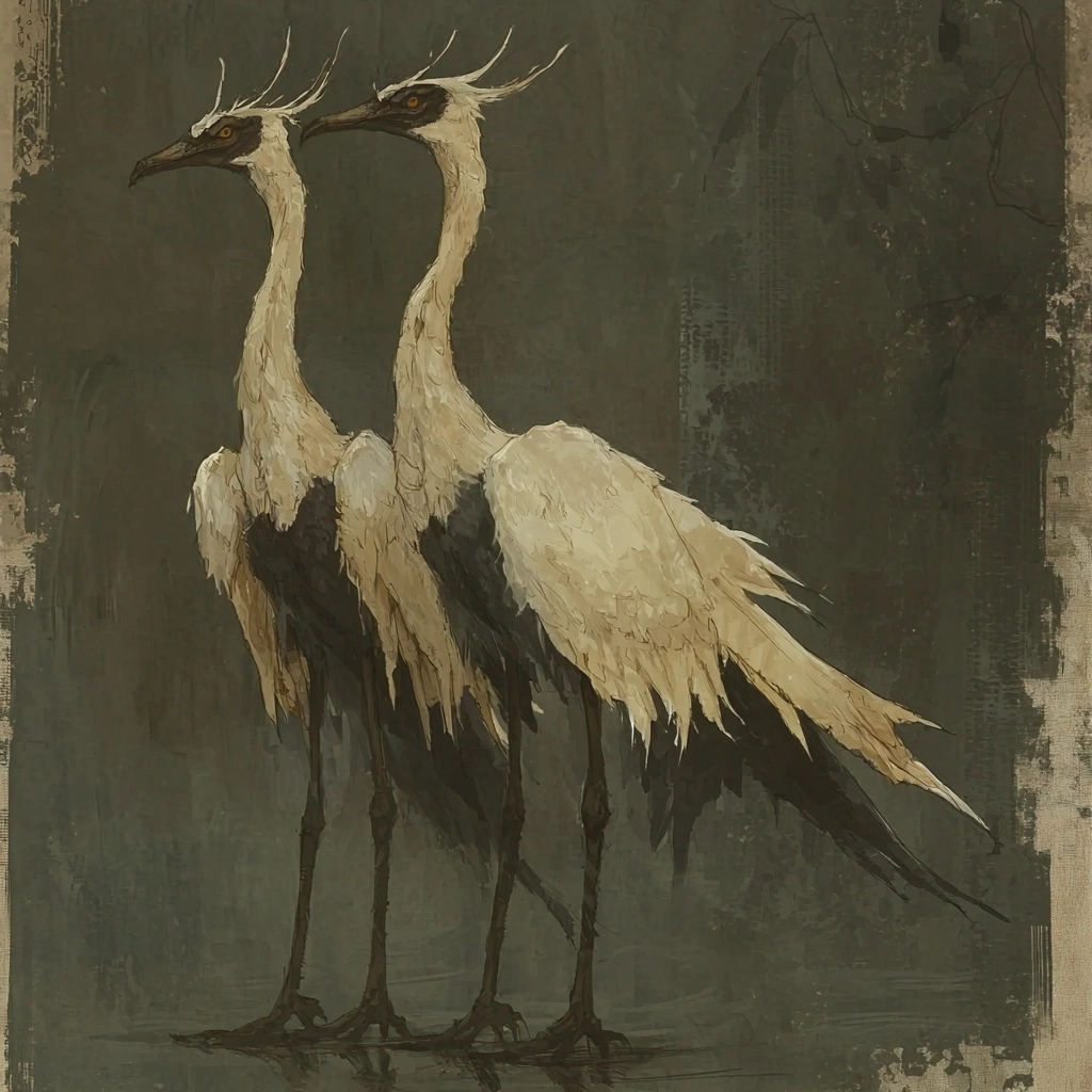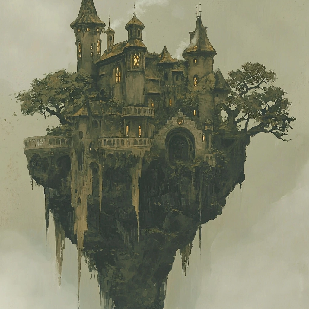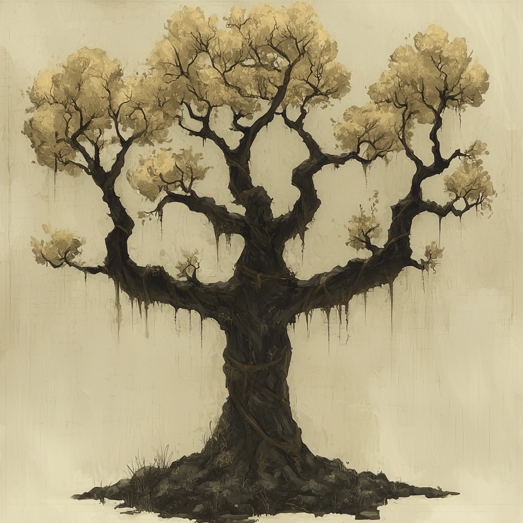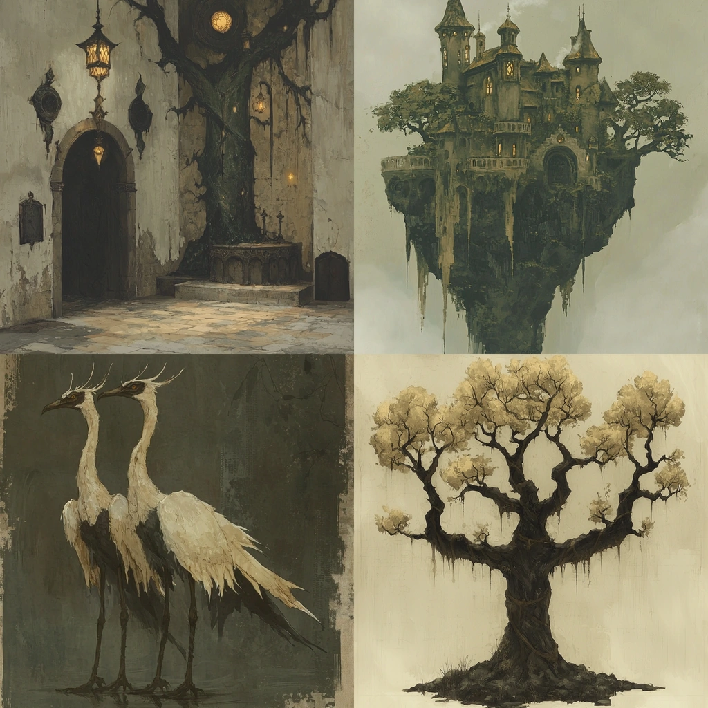 Muted earthy tones with intricate details and a strong contrast.