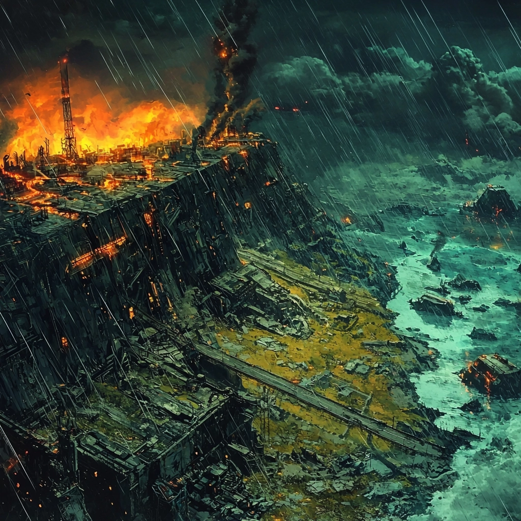 Lighting effects create an intense interplay between shadow and illumination, heightening spatial depth. Rich texture details evoke a tactile environment, emphasizing rough surfaces through intricate brushwork and varied coloration within defined perspectives.