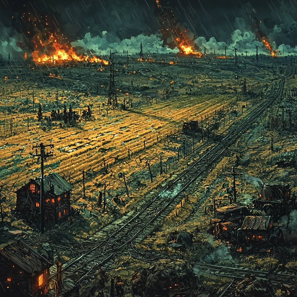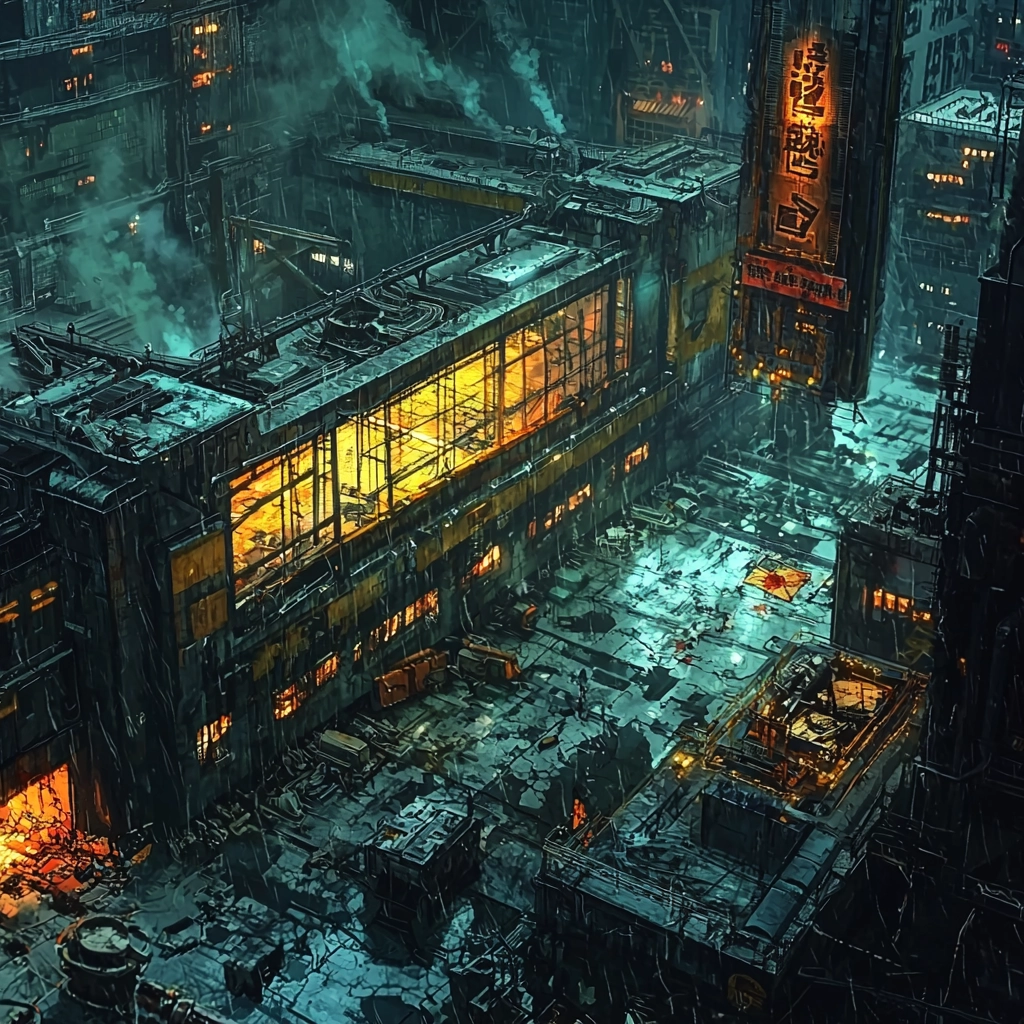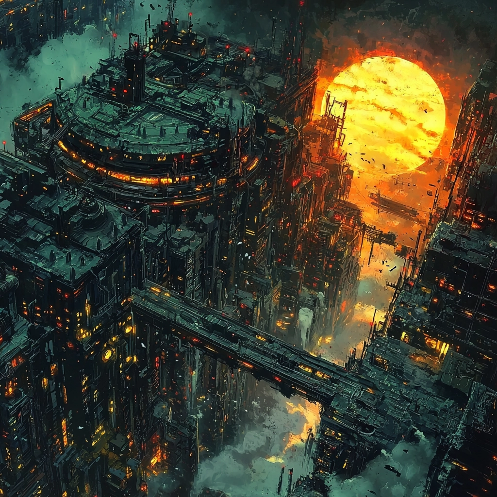 Dominant dark tones with bright highlights creating stark contrast against an intricate, complex layout.