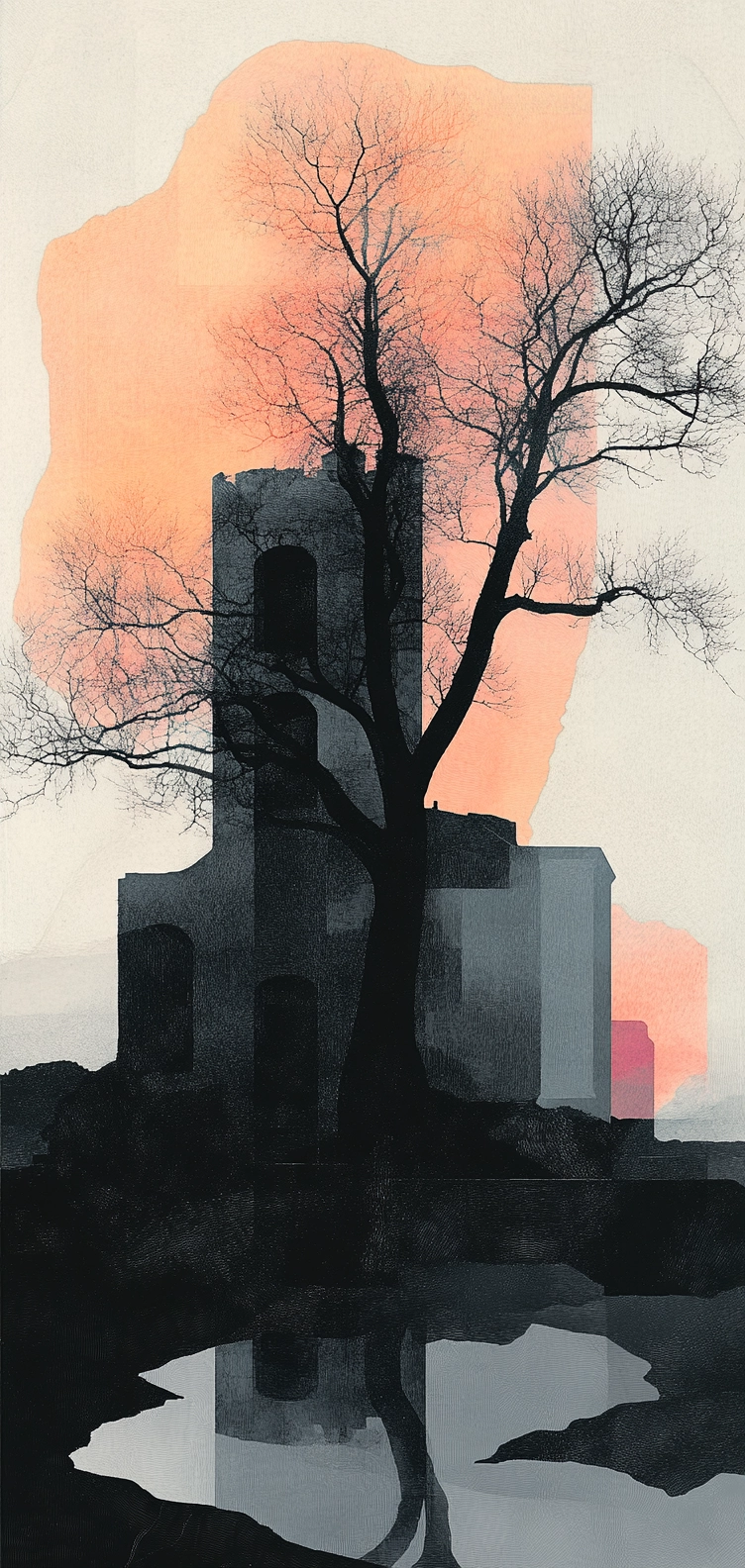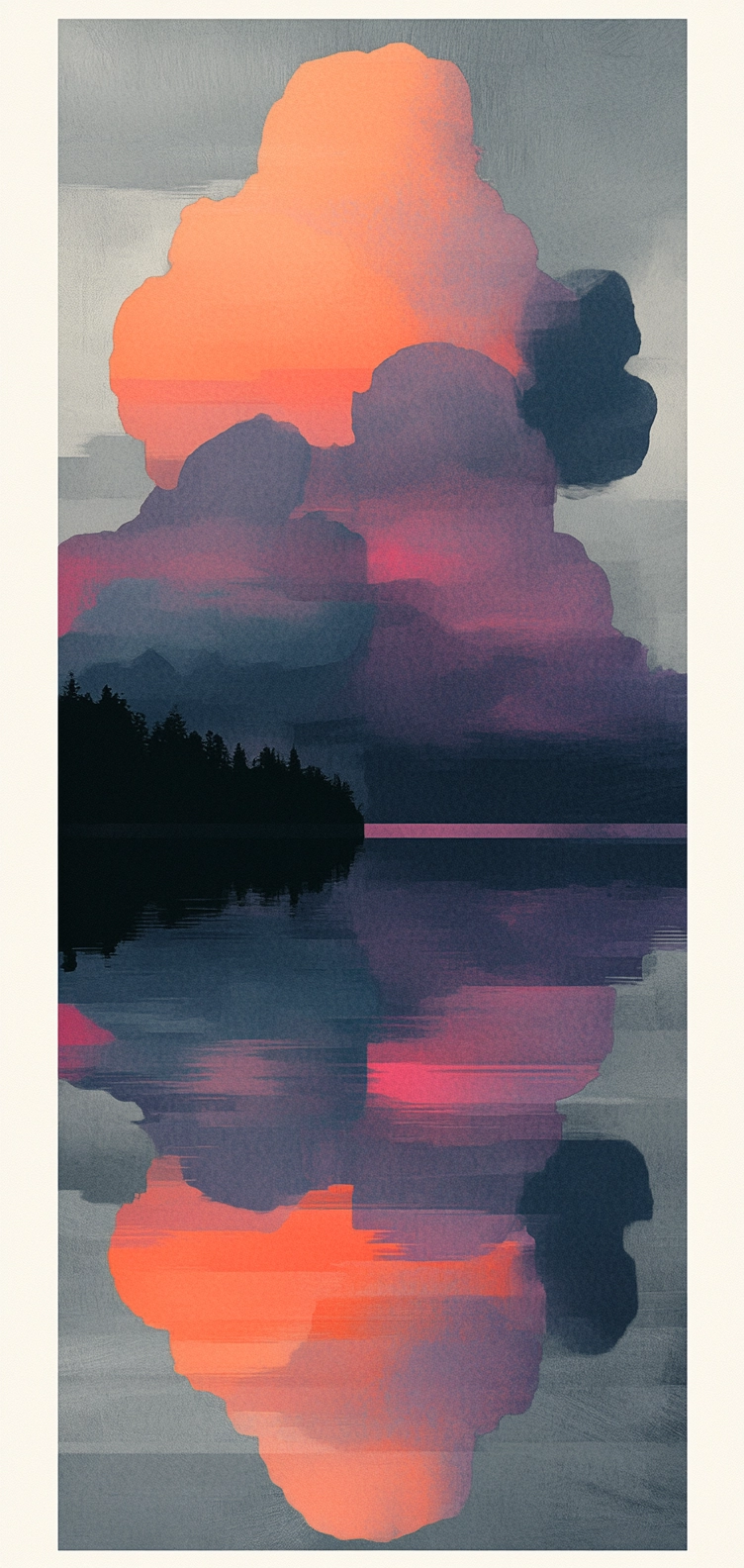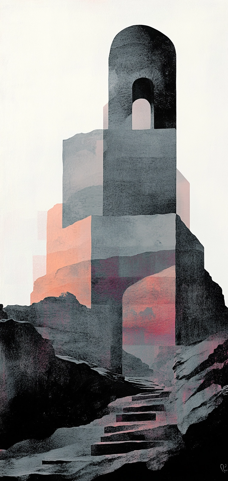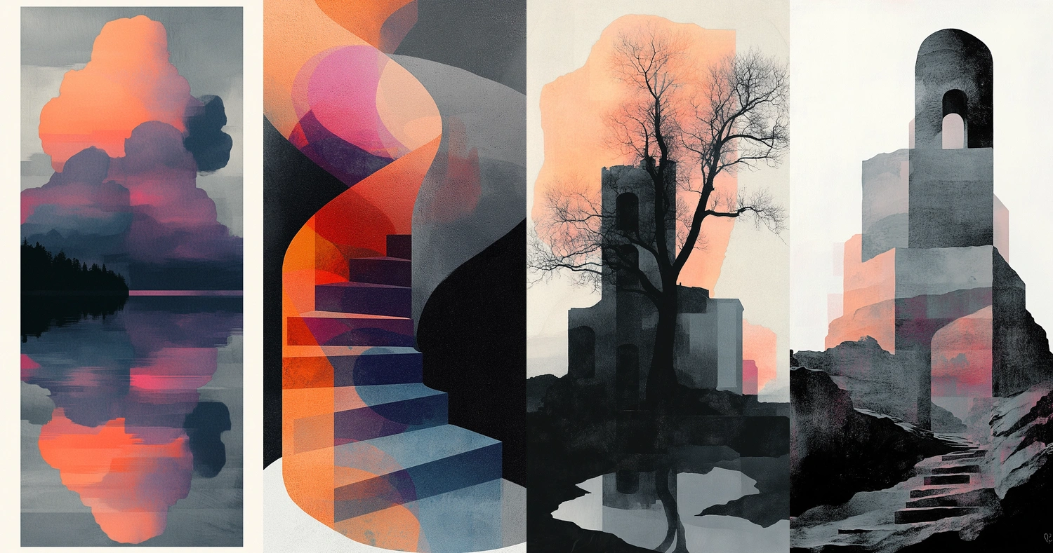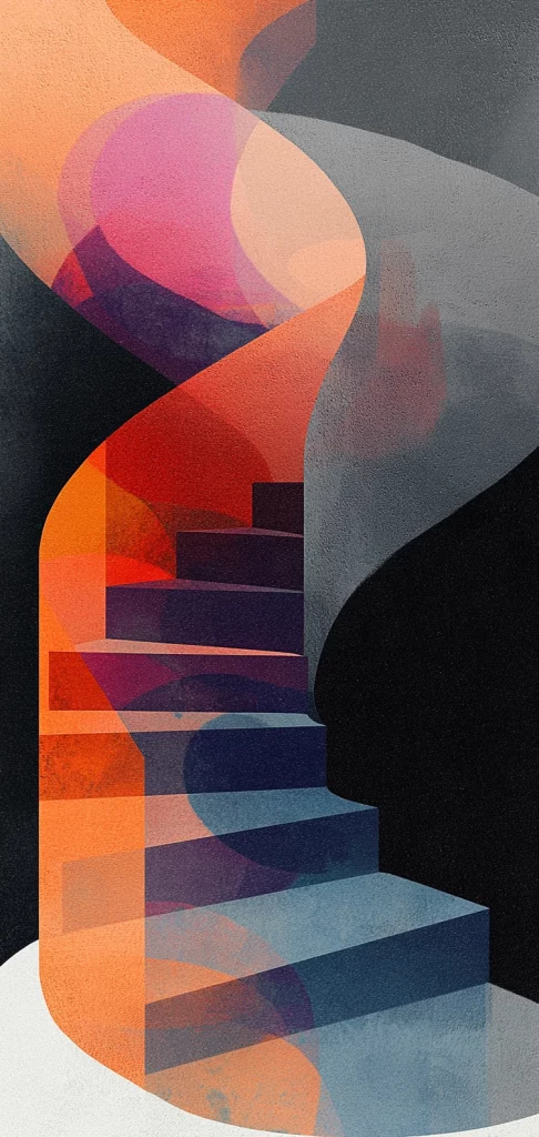 The use of gradients lends a soft yet dramatic lighting effect, enhancing spatial perception. Colors transition smoothly, creating visual fluidity. Contrast between vibrant and muted tones balances the composition.