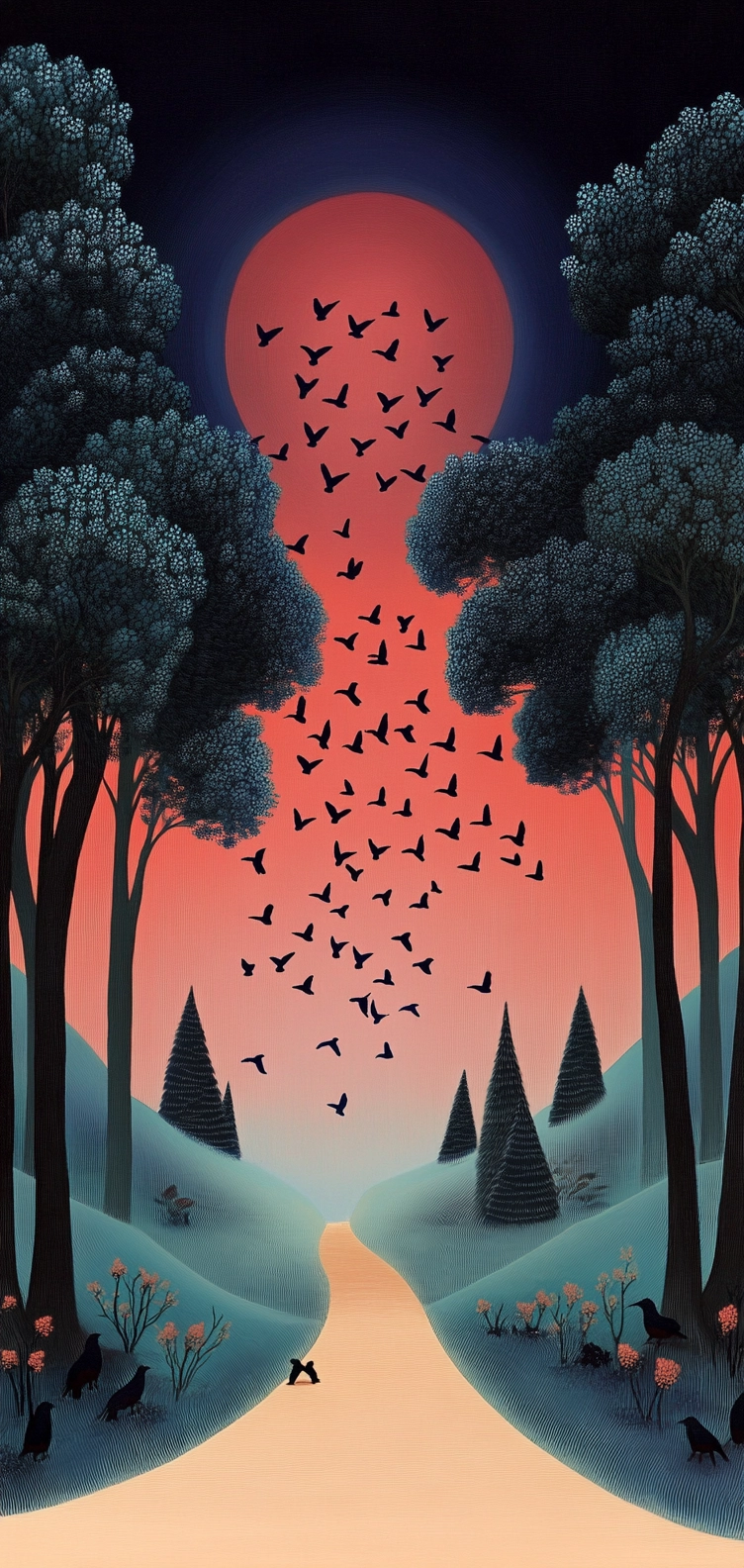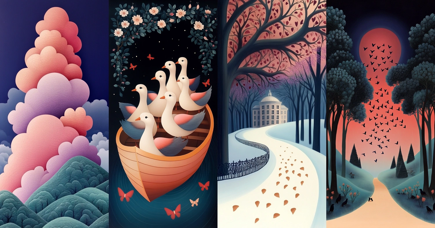 Soft gradient lighting blends pastel tones with rich contrasts throughout balanced, flowing compositions.