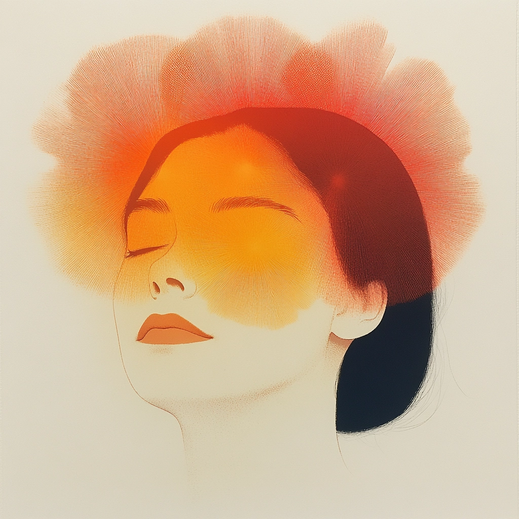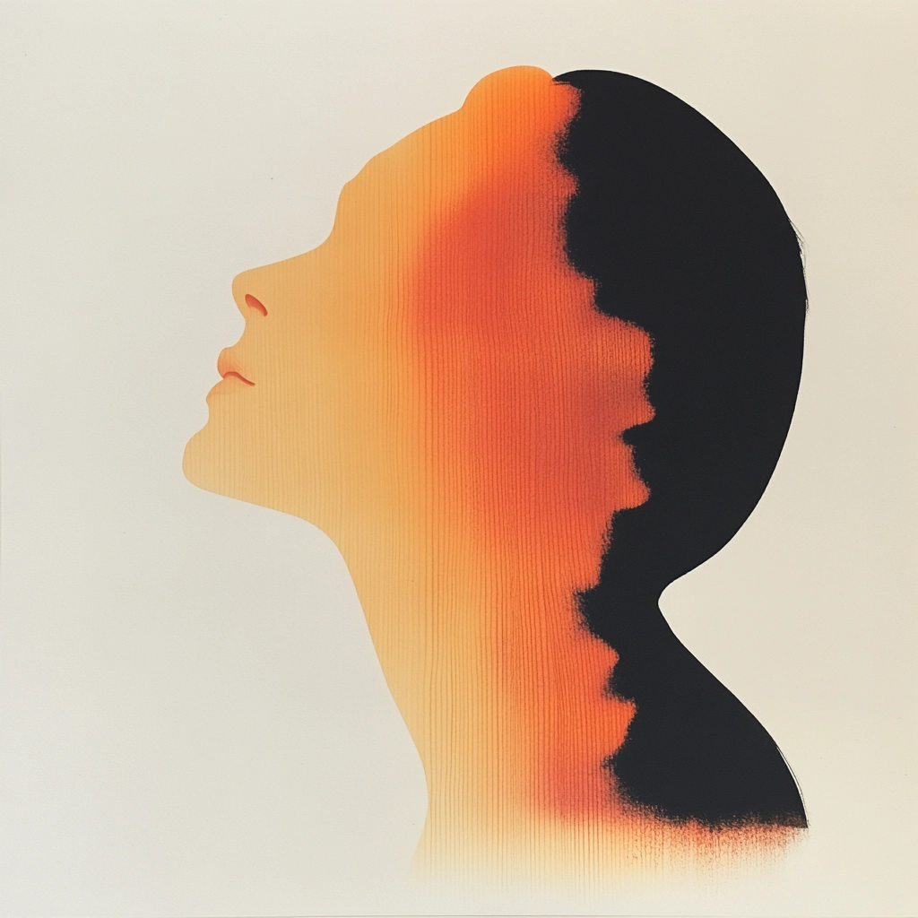 The composition uses gradient transitions and defined silhouettes with contrasting orange and black tones.