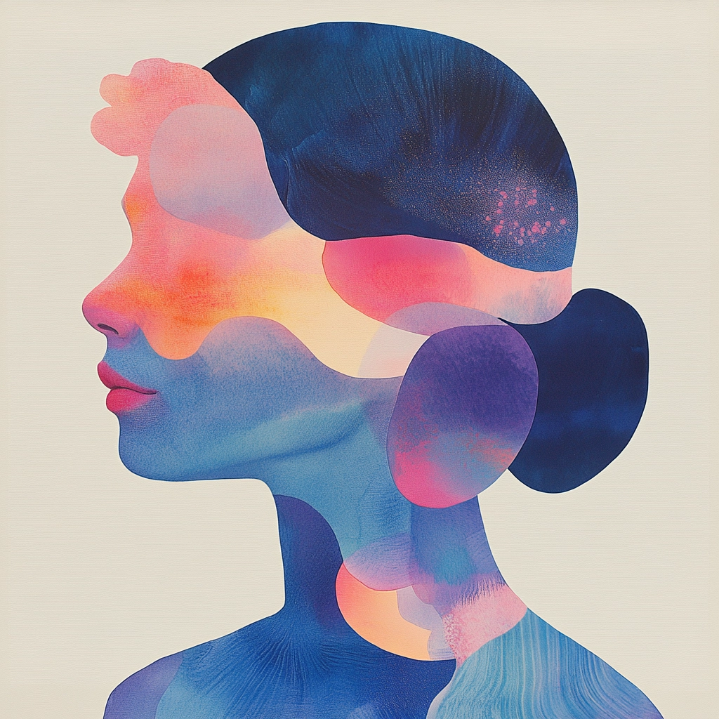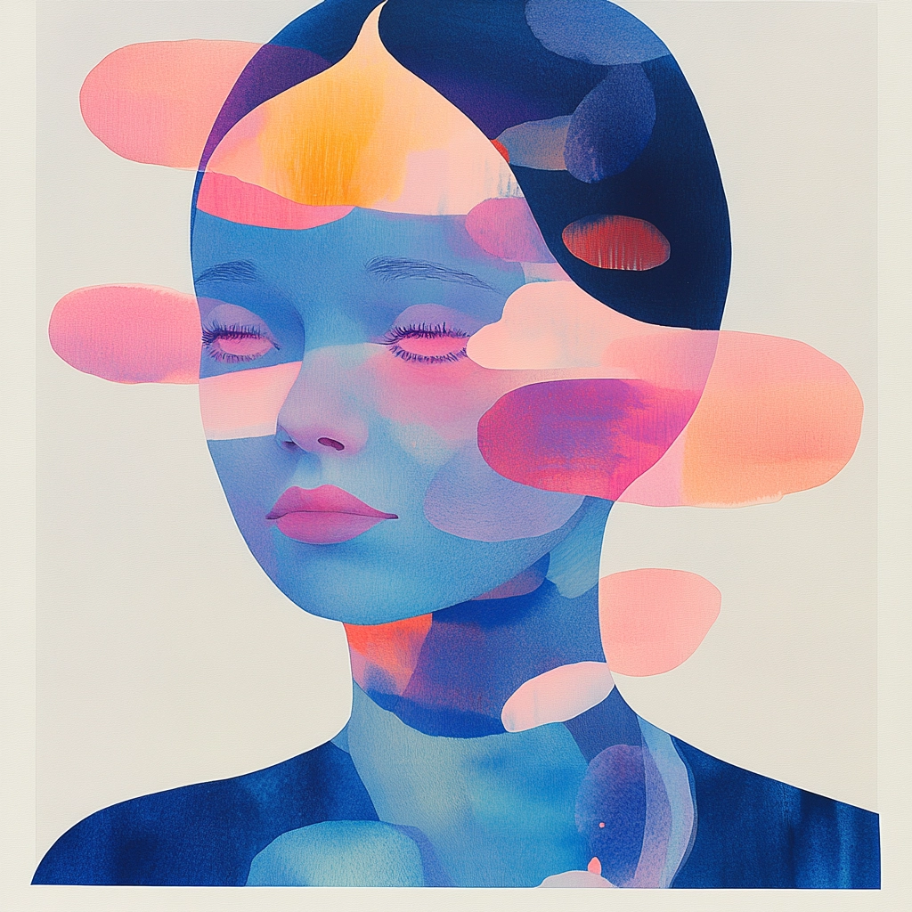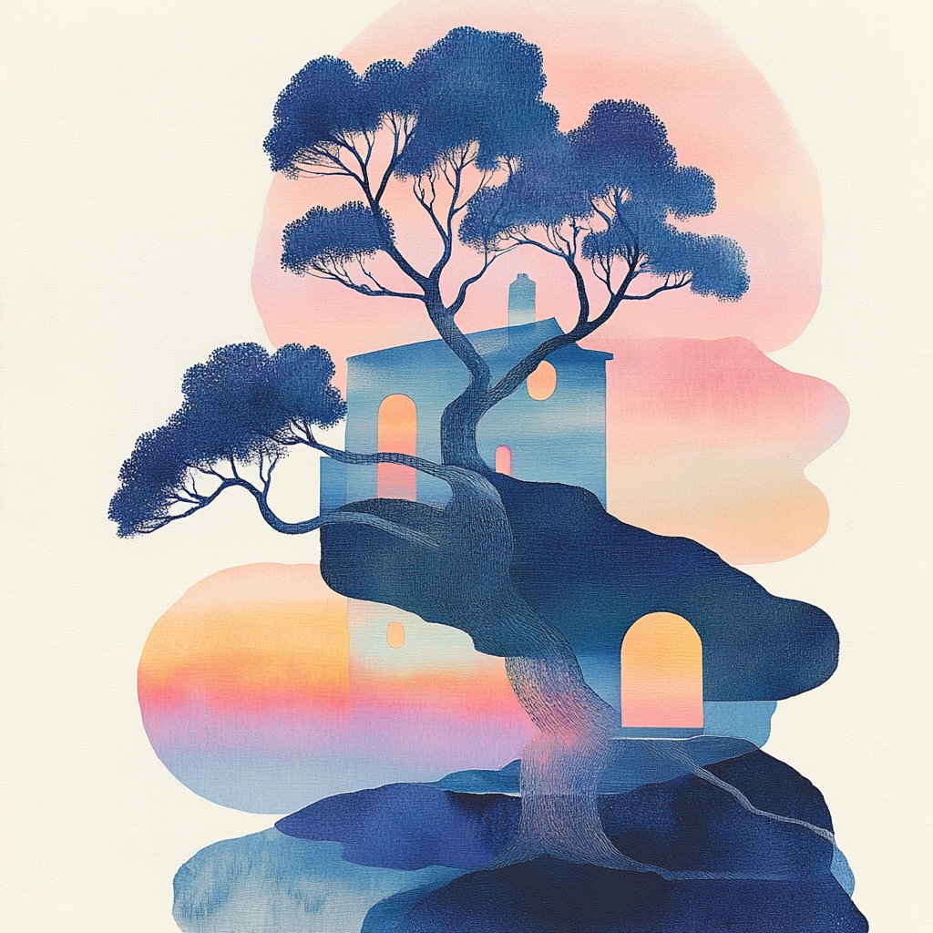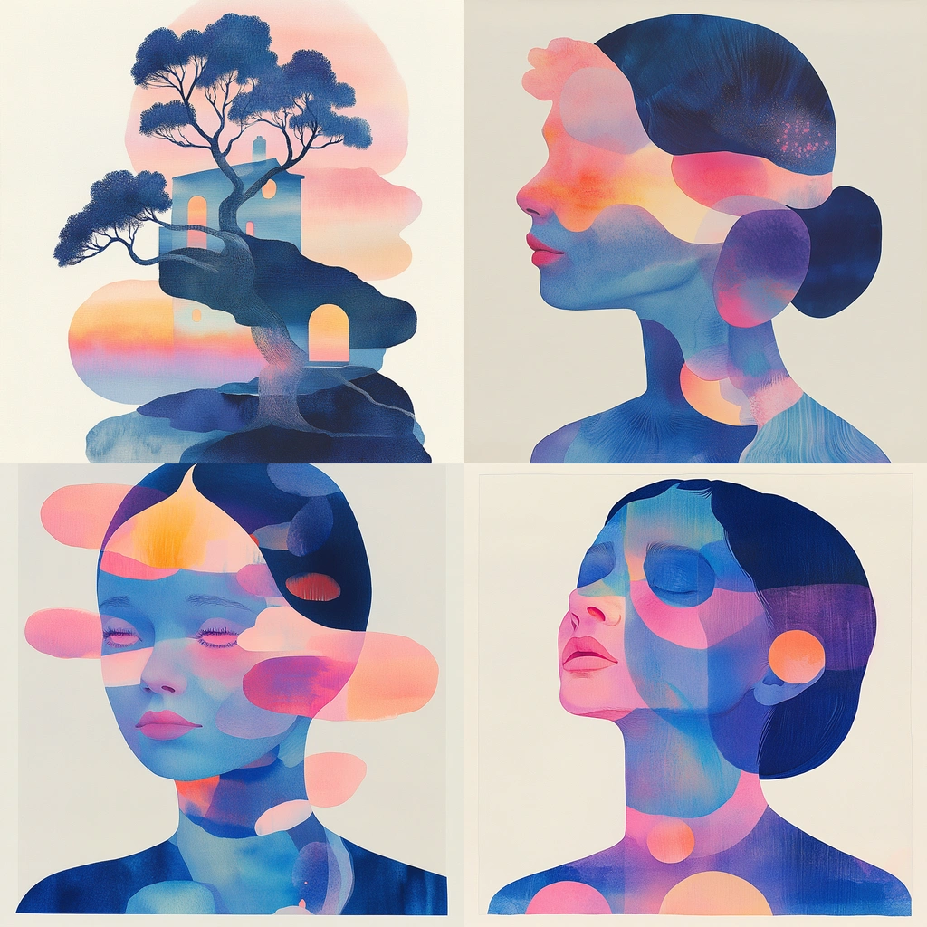 Combines soft gradients and silhouettes creating a cohesive visual flow.