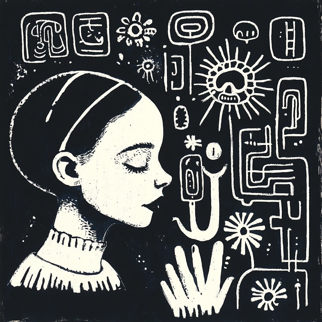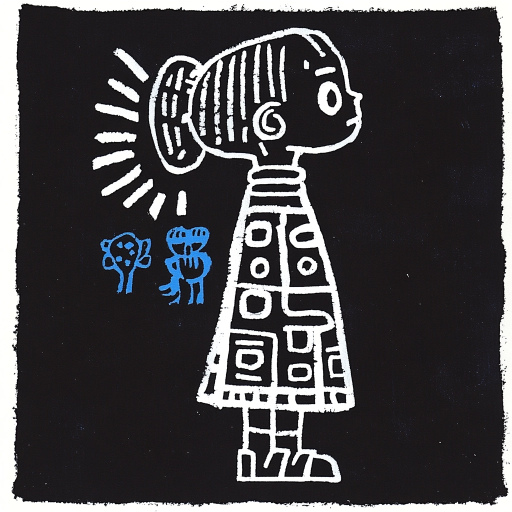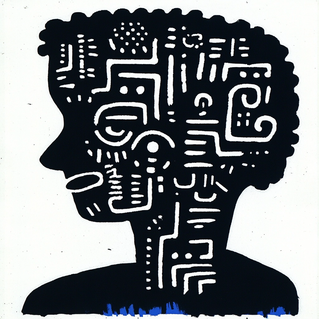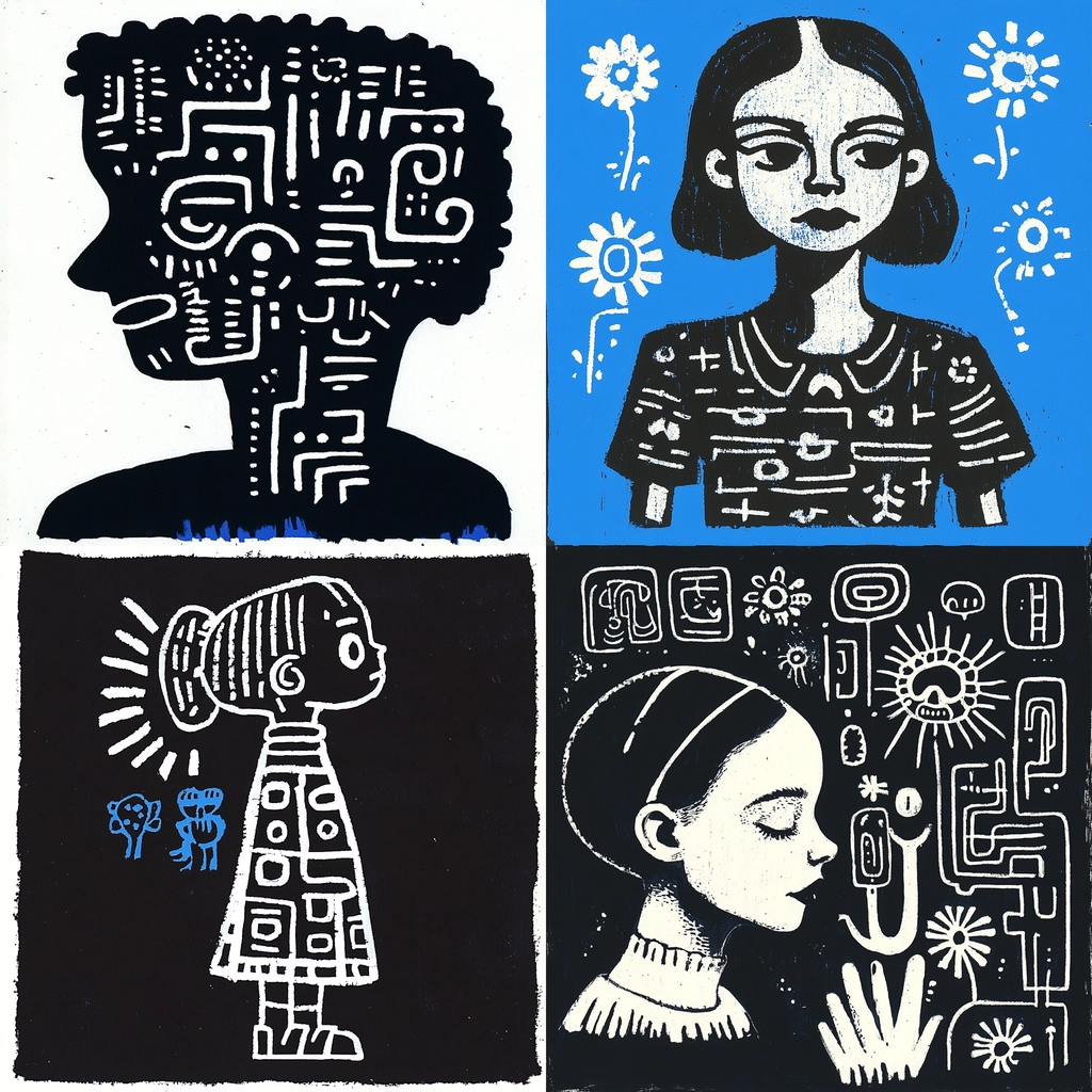 Strong contrasts of black and white shapes set against solid blue fields, arranged in distinct compartments with clear linear patterns and symbolic motifs.