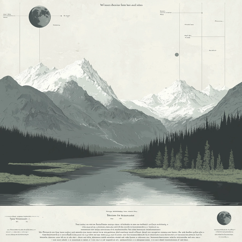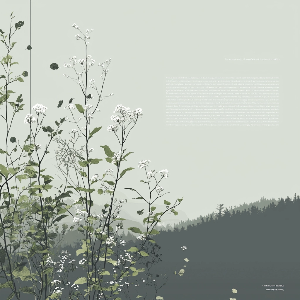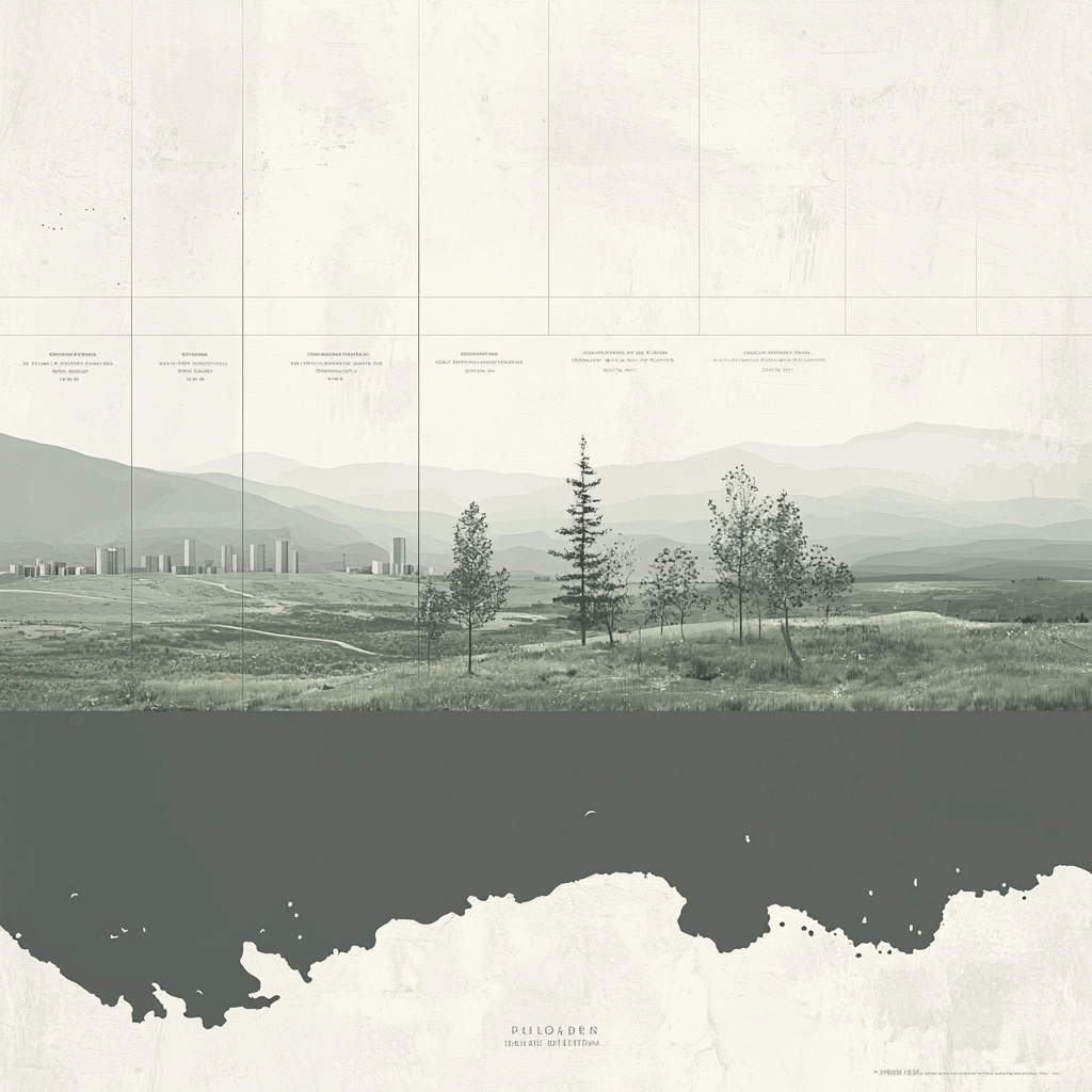 Lighting is soft with desaturated grays and greens contrasted by subtle orange highlights. The space is expansive with defined yet blurred boundaries. Texture appears smooth yet complex, integrating graphical elements with natural impressions.