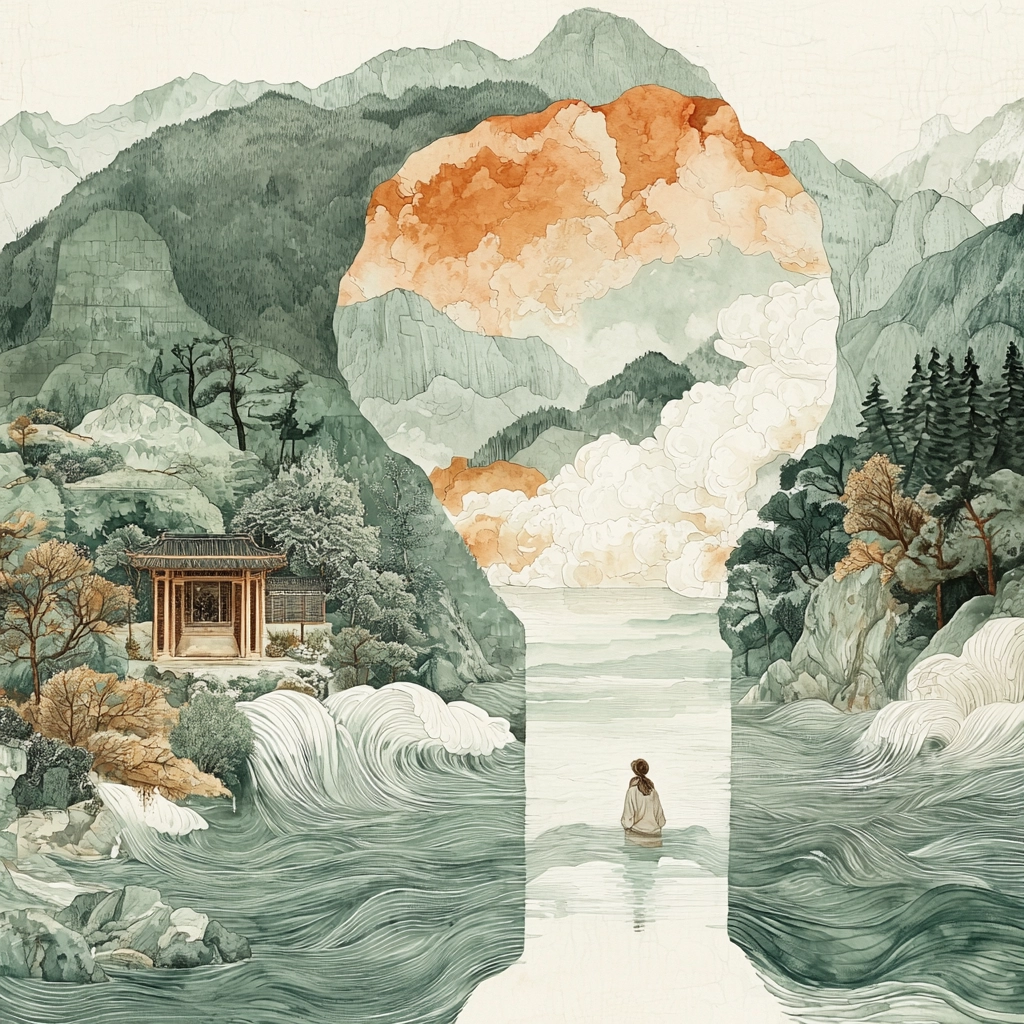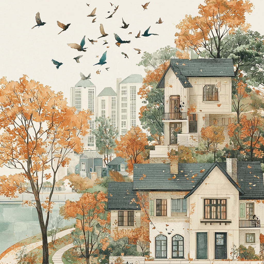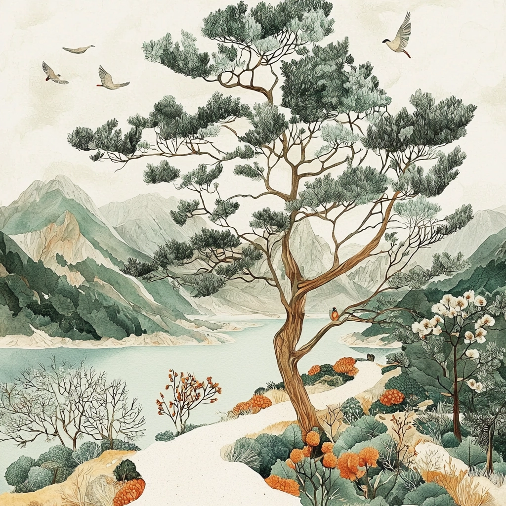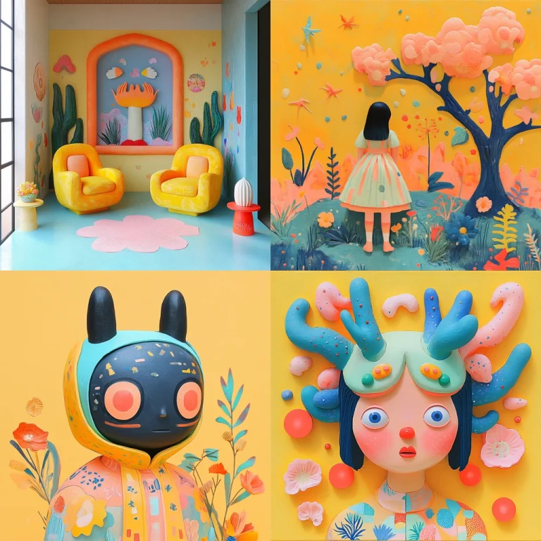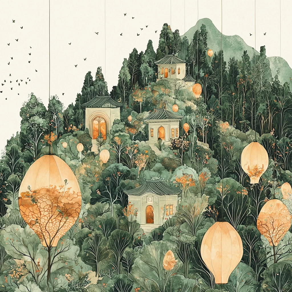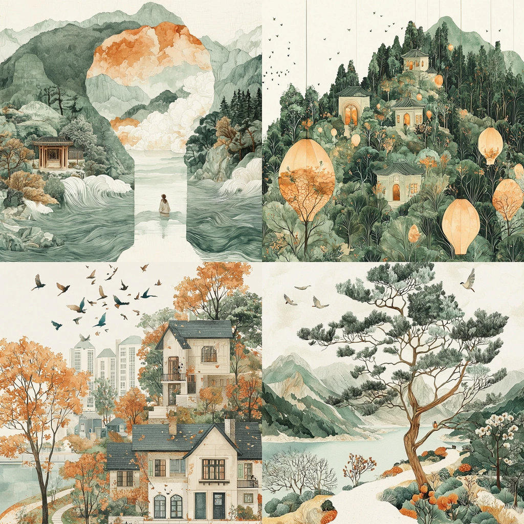 The artwork uses a gentle light source that creates a diffused look, allowing soft colors like green and orange to harmonize within a realistic spatial arrangement. The textures give a sense of depth and dimension.