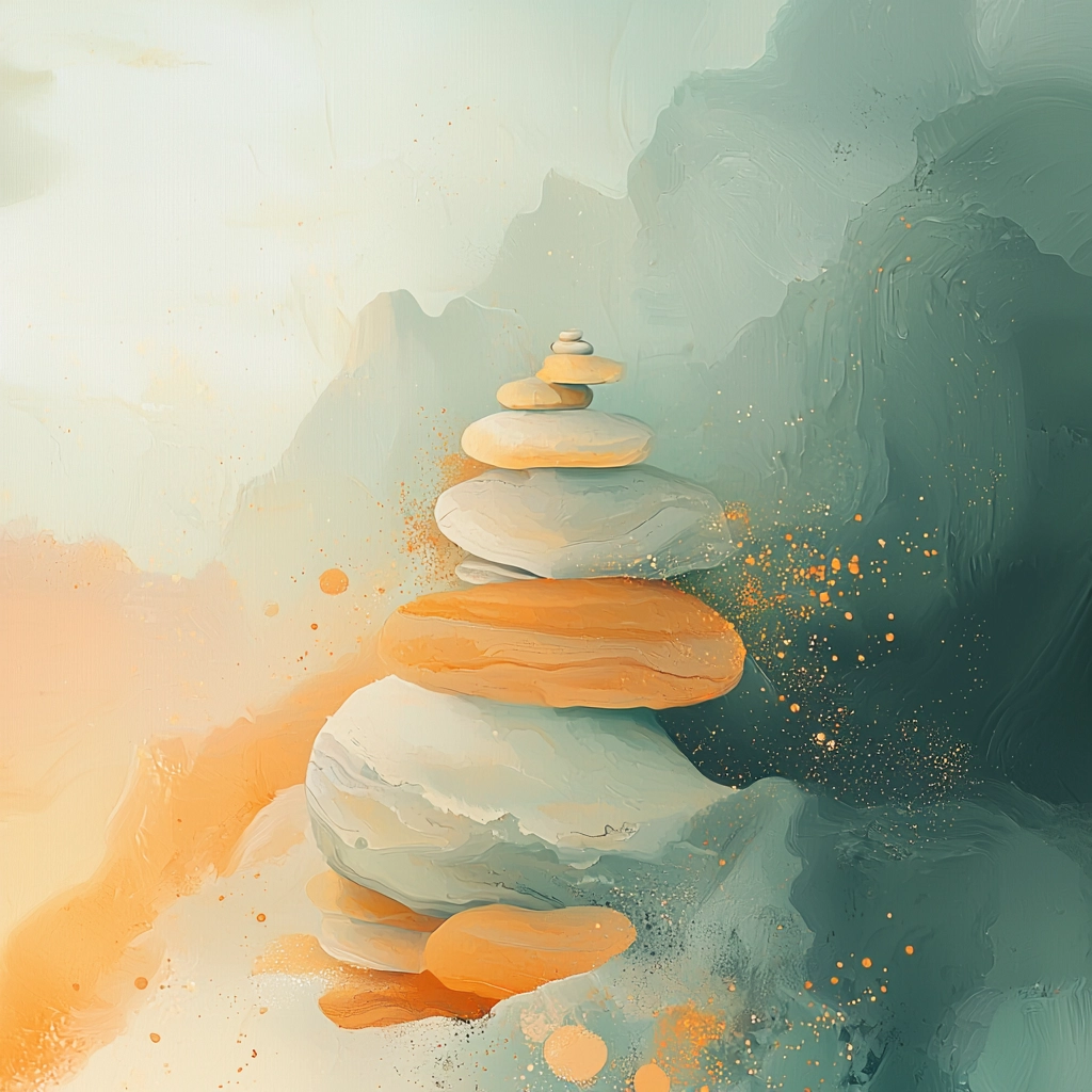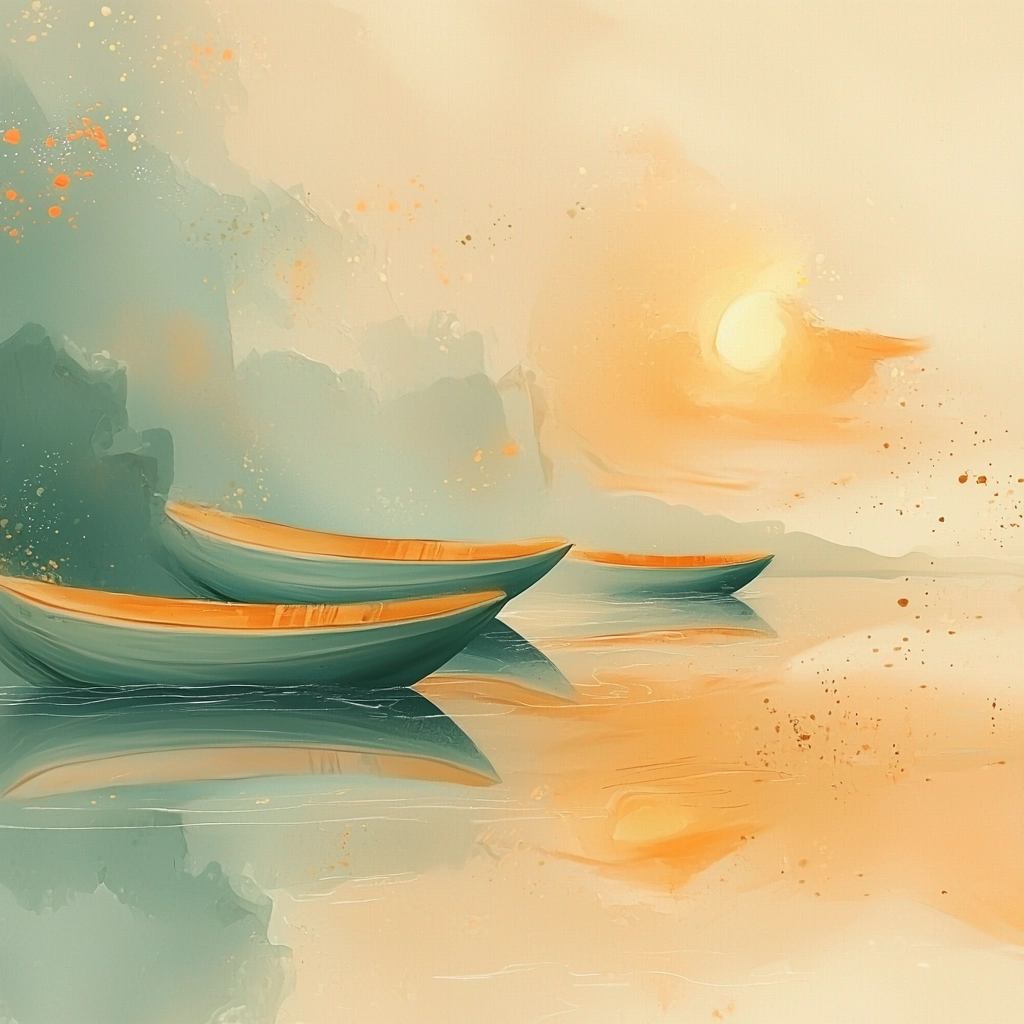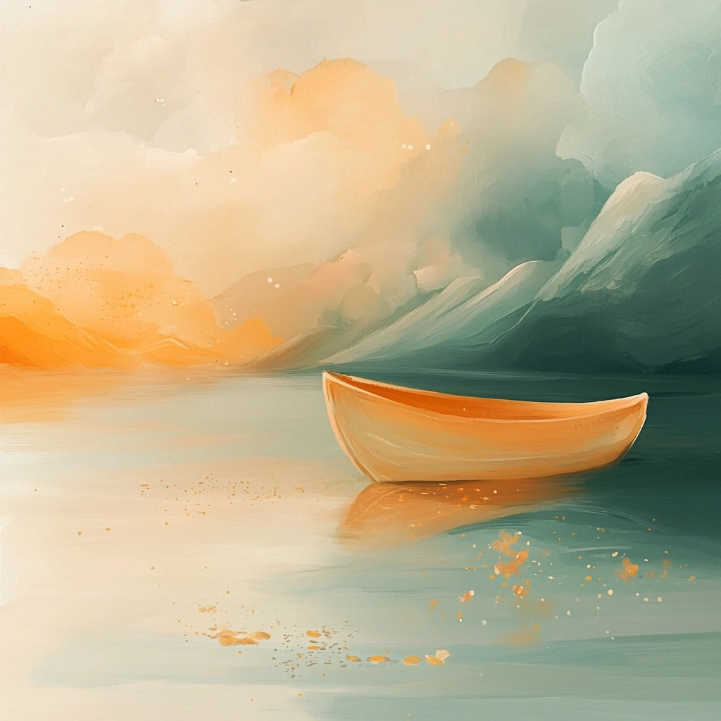The lighting fades gently across warm-toned surfaces, blending with cool overlays to create a misty spatial perception. Textures are smooth and fluid, punctuated by deliberate color accents for harmony.