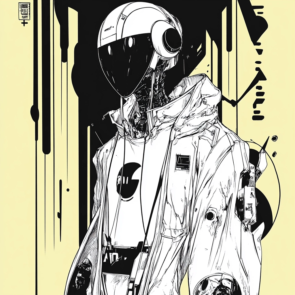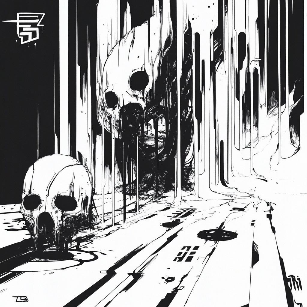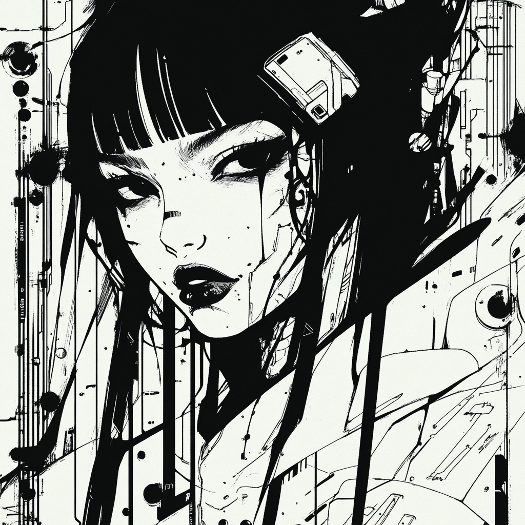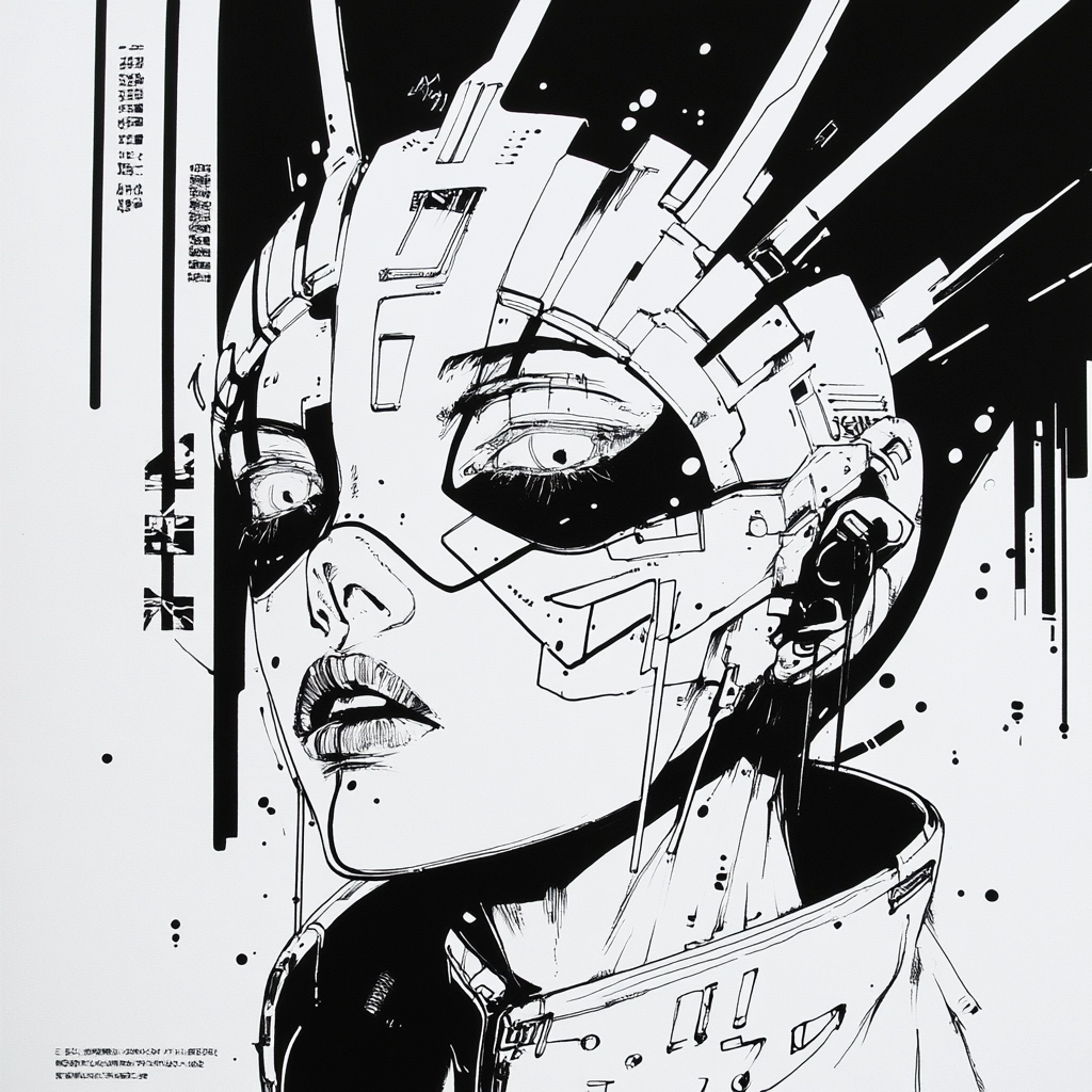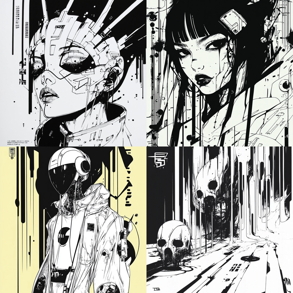 Bold black and white compositions with dynamic line work and futuristic aesthetics.