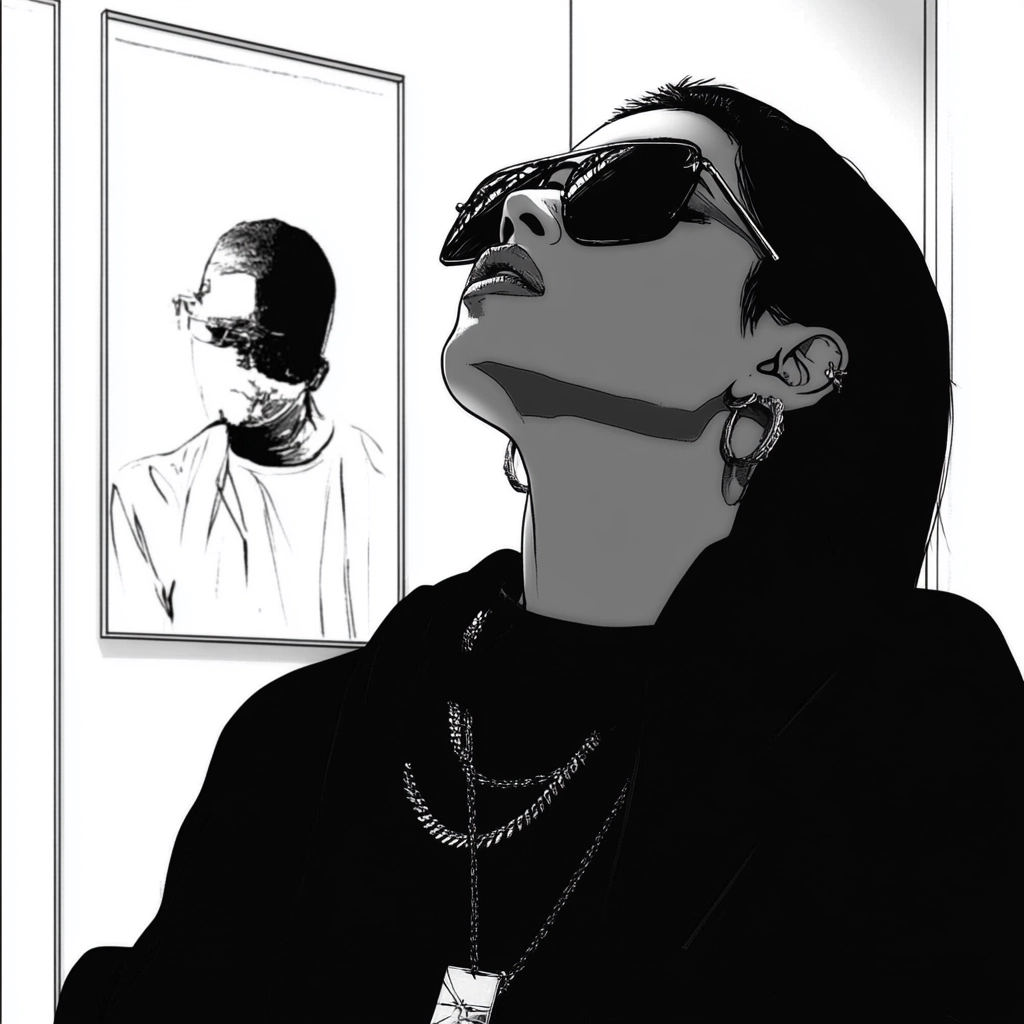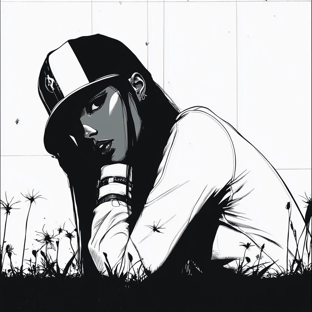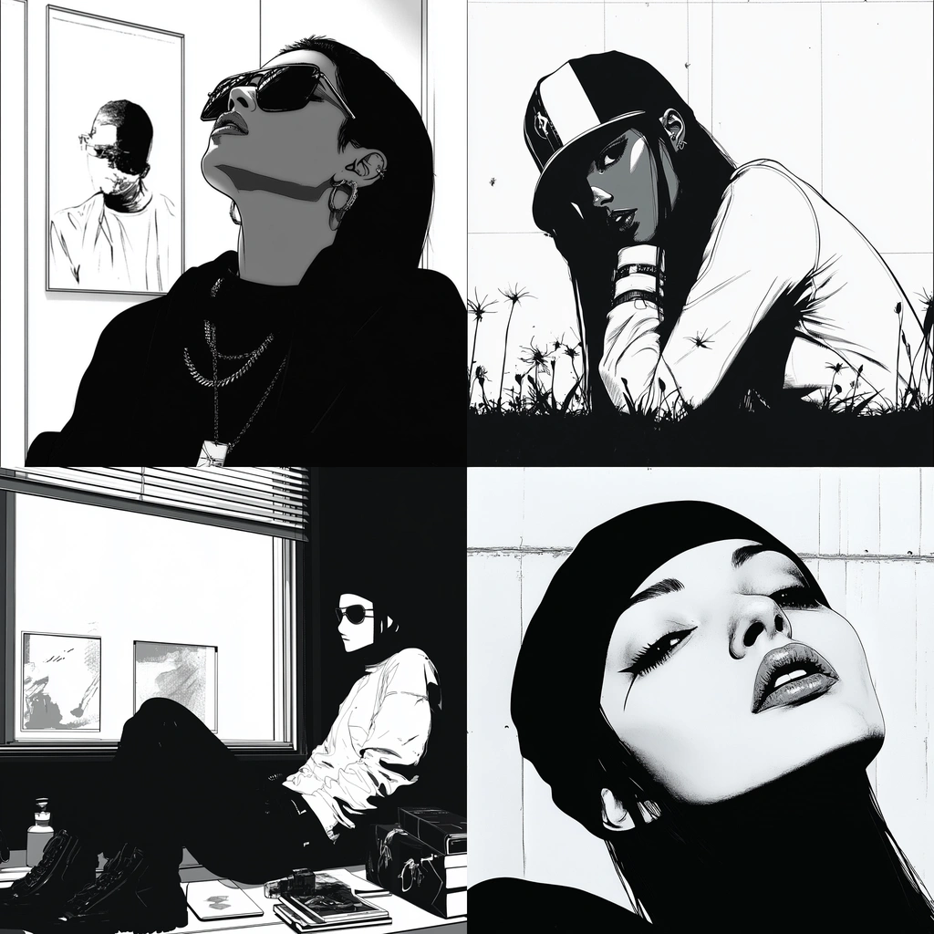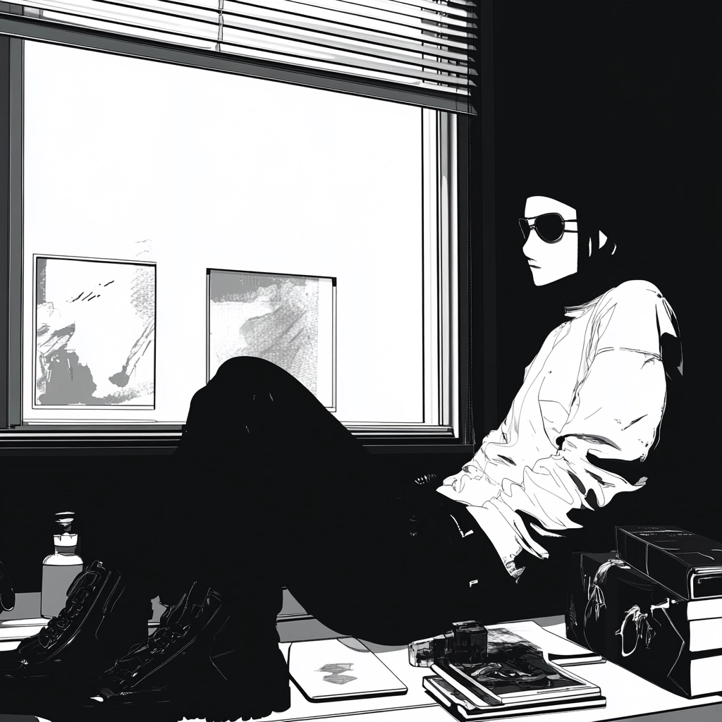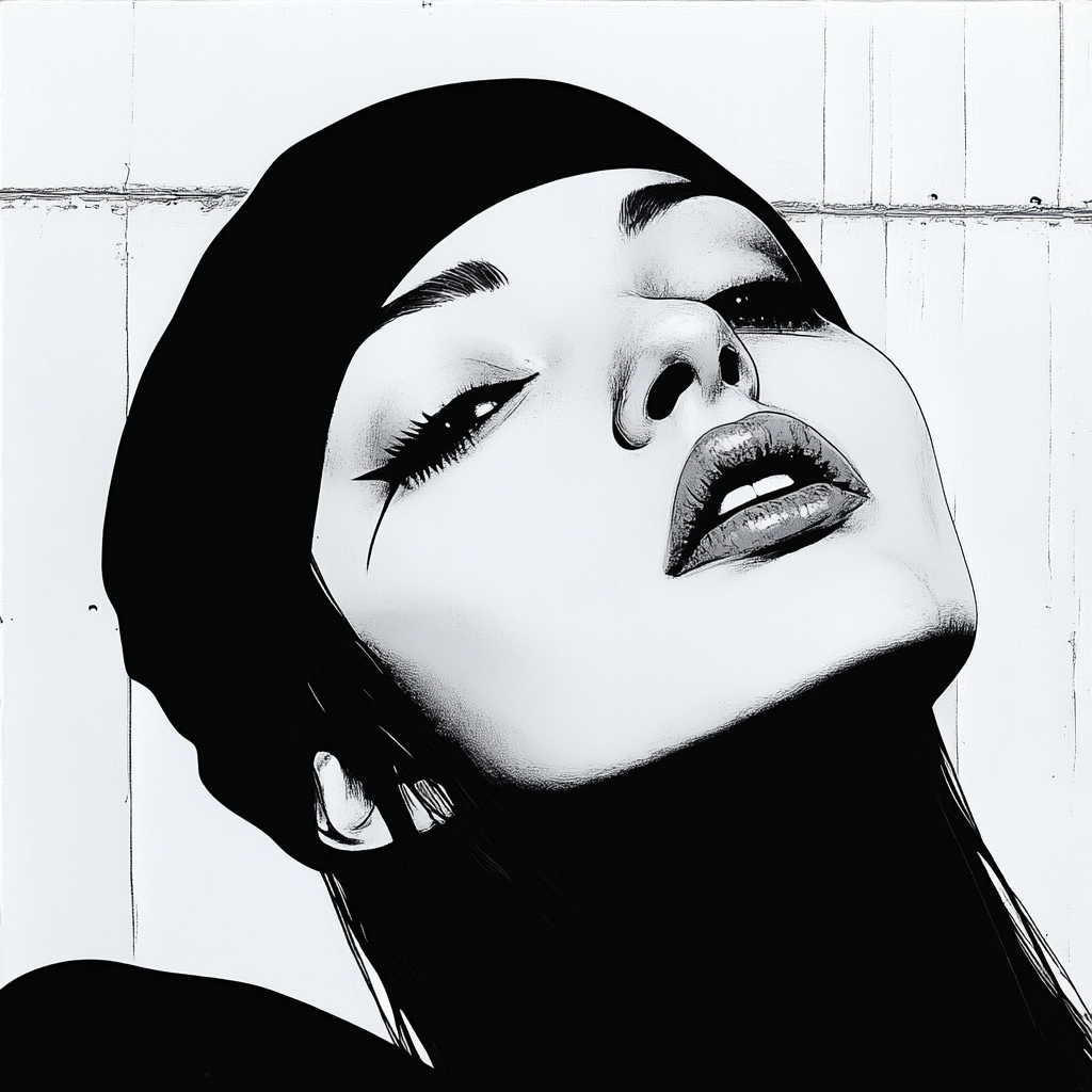 The lighting sharply delineates forms, with solid contrasts highlighting the distinctions between foreground and background. Black and white colors create a crisp and clean texture with minimal spatial depth.
